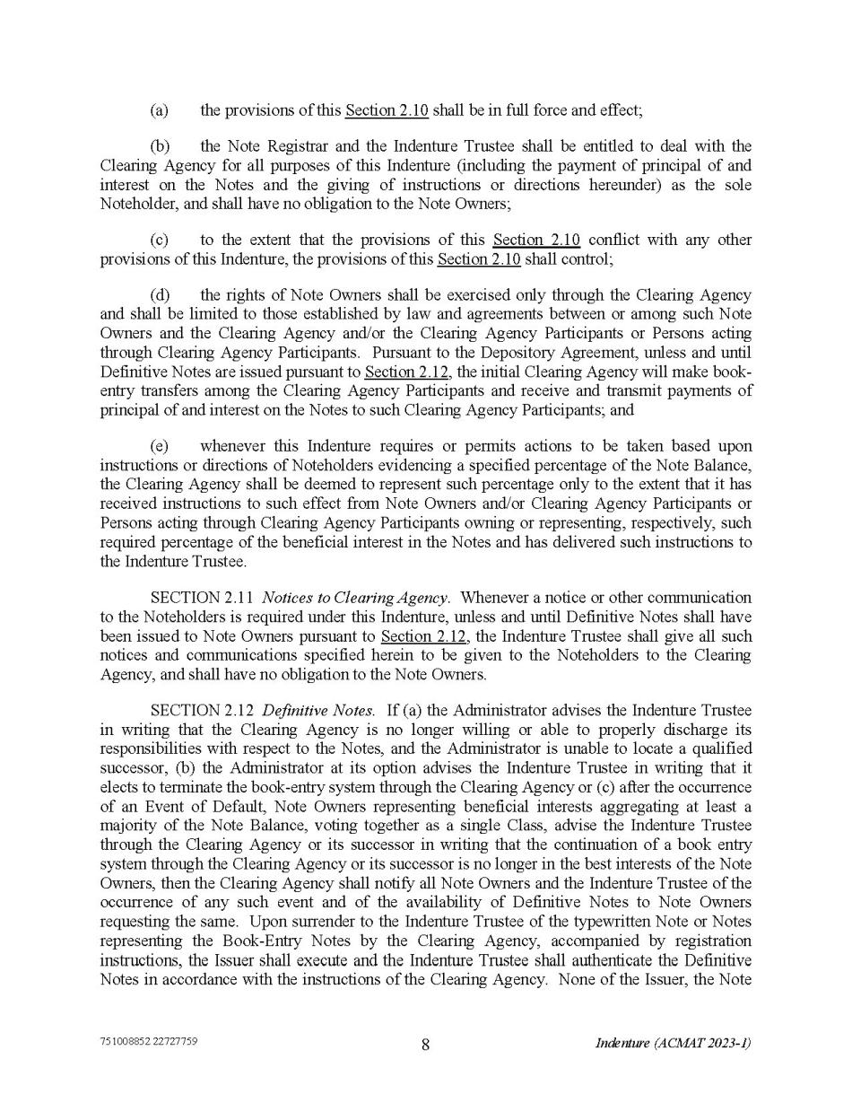 751008852 22727759 8 Indenture (ACMAT 2023 - 1) (a) the provisions of this Section 2.10 shall be in full force and effect; (b) the Note Registrar and the Indenture Trustee shall be entitled to deal with the Clearing Agency for all purposes of this Indenture (including the payment of principal of and interest on the Notes and the giving of instructions or directions hereunder) as the sole Noteholder, and shall have no obligation to the Note Owners ; (c) to the extent that the provisions of this Section 2 . 10 conflict with any other provisions of this Indenture, the provisions of this Section 2 . 10 shall control ; (d) the rights of Note Owners shall be exercised only through the Clearing Agency and shall be limited to those established by law and agreements between or among such Note Owners and the Clearing Agency and/or the Clearing Agency Participants or Persons acting through Clearing Agency Participants . Pursuant to the Depository Agreement, unless and until Definitive Notes are issued pursuant to Section 2 . 12 , the initial Clearing Agency will make book - entry transfers among the Clearing Agency Participants and receive and transmit payments of principal of and interest on the Notes to such Clearing Agency Participants ; and (e) whenever this Indenture requires or permits actions to be taken based upon instructions or directions of Noteholders evidencing a specified percentage of the Note Balance, the Clearing Agency shall be deemed to represent such percentage only to the extent that it has received instructions to such effect from Note Owners and/or Clearing Agency Participants or Persons acting through Clearing Agency Participants owning or representing, respectively, such required percentage of the beneficial interest in the Notes and has delivered such instructions to the Indenture Trustee . SECTION 2 . 11 Notices to Clearing Agency . Whenever a notice or other communication to the Noteholders is required under this Indenture, unless and until Definitive Notes shall have been issued to Note Owners pursuant to Section 2 . 12 , the Indenture Trustee shall give all such notices and communications specified herein to be given to the Noteholders to the Clearing Agency, and shall have no obligation to the Note Owners . SECTION 2 . 12 Definitive Notes . If (a) the Administrator advises the Indenture Trustee in writing that the Clearing Agency is no longer willing or able to properly discharge its responsibilities with respect to the Notes, and the Administrator is unable to locate a qualified successor, (b) the Administrator at its option advises the Indenture Trustee in writing that it elects to terminate the book - entry system through the Clearing Agency or (c) after the occurrence of an Event of Default, Note Owners representing beneficial interests aggregating at least a majority of the Note Balance, voting together as a single Class, advise the Indenture Trustee through the Clearing Agency or its successor in writing that the continuation of a book entry system through the Clearing Agency or its successor is no longer in the best interests of the Note Owners, then the Clearing Agency shall notify all Note Owners and the Indenture Trustee of the occurrence of any such event and of the availability of Definitive Notes to Note Owners requesting the same . Upon surrender to the Indenture Trustee of the typewritten Note or Notes representing the Book - Entry Notes by the Clearing Agency, accompanied by registration instructions, the Issuer shall execute and the Indenture Trustee shall authenticate the Definitive Notes in accordance with the instructions of the Clearing Agency . None of the Issuer, the Note