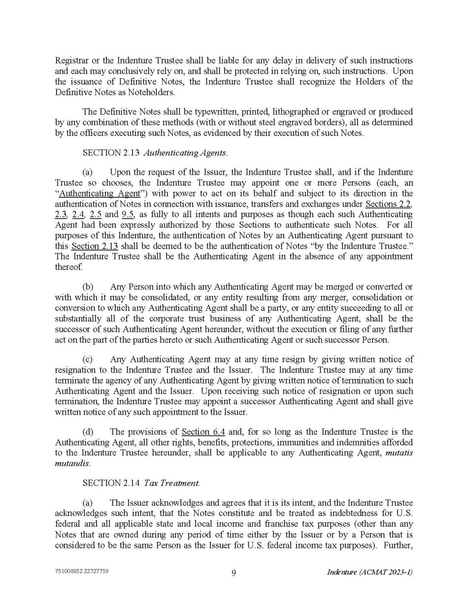 751008852 22727759 9 Indenture (ACMAT 2023 - 1) Registrar or the Indenture Trustee shall be liable for any delay in delivery of such instructions and each may conclusively rely on, and shall be protected in relying on, such instructions . Upon the issuance of Definitive Notes, the Indenture Trustee shall recognize the Holders of the Definitive Notes as Noteholders . The Definitive Notes shall be typewritten, printed, lithographed or engraved or produced by any combination of these methods (with or without steel engraved borders), all as determined by the officers executing such Notes, as evidenced by their execution of such Notes . SECTION 2.13 Authenticating Agents . (a) Upon the request of the Issuer, the Indenture Trustee shall, and if the Indenture Trustee so chooses, the Indenture Trustee may appoint one or more Persons (each, an “ Authenticating Agent ”) with power to act on its behalf and subject to its direction in the authentication of Notes in connection with issuance, transfers and exchanges under Sections 2 . 2 , 2 . 3 , 2 . 4 , 2 . 5 and 9 . 5 , as fully to all intents and purposes as though each such Authenticating Agent had been expressly authorized by those Sections to authenticate such Notes . For all purposes of this Indenture, the authentication of Notes by an Authenticating Agent pursuant to this Section 2 . 13 shall be deemed to be the authentication of Notes “by the Indenture Trustee . ” The Indenture Trustee shall be the Authenticating Agent in the absence of any appointment thereof . (b) Any Person into which any Authenticating Agent may be merged or converted or with which it may be consolidated, or any entity resulting from any merger, consolidation or conversion to which any Authenticating Agent shall be a party, or any entity succeeding to all or substantially all of the corporate trust business of any Authenticating Agent, shall be the successor of such Authenticating Agent hereunder, without the execution or filing of any further act on the part of the parties hereto or such Authenticating Agent or such successor Person . (c) Any Authenticating Agent may at any time resign by giving written notice of resignation to the Indenture Trustee and the Issuer . The Indenture Trustee may at any time terminate the agency of any Authenticating Agent by giving written notice of termination to such Authenticating Agent and the Issuer . Upon receiving such notice of resignation or upon such termination, the Indenture Trustee may appoint a successor Authenticating Agent and shall give written notice of any such appointment to the Issuer . (d) The provisions of Section 6 . 4 and, for so long as the Indenture Trustee is the Authenticating Agent, all other rights, benefits, protections, immunities and indemnities afforded to the Indenture Trustee hereunder, shall be applicable to any Authenticating Agent, mutatis mutandis . SECTION 2.14 Tax Treatment . (a) The Issuer acknowledges and agrees that it is its intent, and the Indenture Trustee acknowledges such intent, that the Notes constitute and be treated as indebtedness for U . S . federal and all applicable state and local income and franchise tax purposes (other than any Notes that are owned during any period of time either by the Issuer or by a Person that is considered to be the same Person as the Issuer for U . S . federal income tax purposes) . Further,