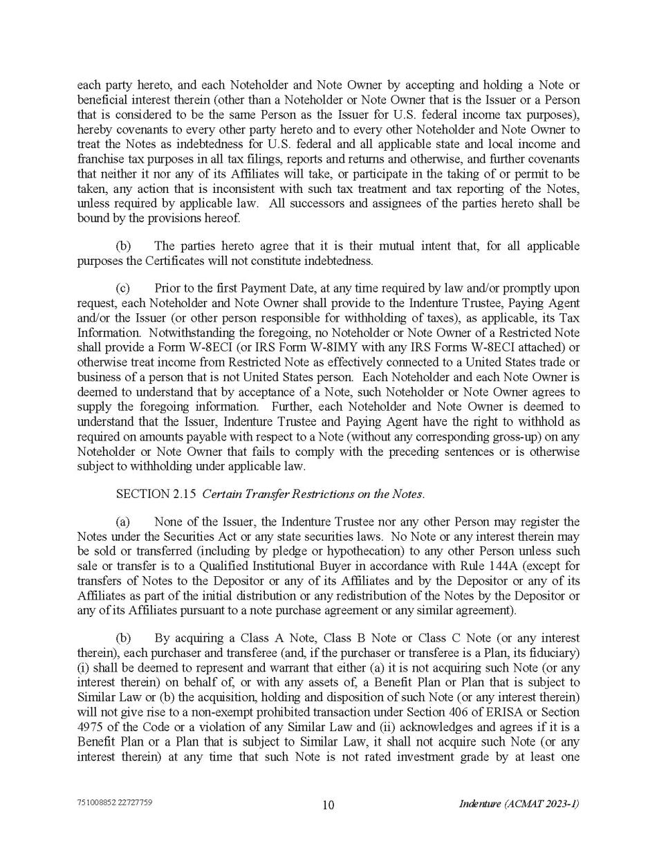 751008852 22727759 10 Indenture (ACMAT 2023 - 1) each party hereto, and each Noteholder and Note Owner by accepting and holding a Note or beneficial interest therein (other than a Noteholder or Note Owner that is the Issuer or a Person that is considered to be the same Person as the Issuer for U . S . federal income tax purposes), hereby covenants to every other party hereto and to every other Noteholder and Note Owner to treat the Notes as indebtedness for U . S . federal and all applicable state and local income and franchise tax purposes in all tax filings, reports and returns and otherwise, and further covenants that neither it nor any of its Affiliates will take, or participate in the taking of or permit to be taken, any action that is inconsistent with such tax treatment and tax reporting of the Notes, unless required by applicable law . All successors and assignees of the parties hereto shall be bound by the provisions hereof . (b) The parties hereto agree that it is their mutual intent that, for all applicable purposes the Certificates will not constitute indebtedness . (c) Prior to the first Payment Date, at any time required by law and/or promptly upon request, each Noteholder and Note Owner shall provide to the Indenture Trustee, Paying Agent and/or the Issuer (or other person responsible for withholding of taxes), as applicable, its Tax Information . Notwithstanding the foregoing, no Noteholder or Note Owner of a Restricted Note shall provide a Form W - 8 ECI (or IRS Form W - 8 IMY with any IRS Forms W - 8 ECI attached) or otherwise treat income from Restricted Note as effectively connected to a United States trade or business of a person that is not United States person . Each Noteholder and each Note Owner is deemed to understand that by acceptance of a Note, such Noteholder or Note Owner agrees to supply the foregoing information . Further, each Noteholder and Note Owner is deemed to understand that the Issuer, Indenture Trustee and Paying Agent have the right to withhold as required on amounts payable with respect to a Note (without any corresponding gross - up) on any Noteholder or Note Owner that fails to comply with the preceding sentences or is otherwise subject to withholding under applicable law . SECTION 2.15 Certain Transfer Restrictions on the Notes . (a) None of the Issuer, the Indenture Trustee nor any other Person may register the Notes under the Securities Act or any state securities laws . No Note or any interest therein may be sold or transferred (including by pledge or hypothecation) to any other Person unless such sale or transfer is to a Qualified Institutional Buyer in accordance with Rule 144 A (except for transfers of Notes to the Depositor or any of its Affiliates and by the Depositor or any of its Affiliates as part of the initial distribution or any redistribution of the Notes by the Depositor or any of its Affiliates pursuant to a note purchase agreement or any similar agreement) . (b) By acquiring a Class A Note, Class B Note or Class C Note (or any interest therein), each purchaser and transferee (and, if the purchaser or transferee is a Plan, its fiduciary) (i) shall be deemed to represent and warrant that either (a) it is not acquiring such Note (or any interest therein) on behalf of, or with any assets of, a Benefit Plan or Plan that is subject to Similar Law or (b) the acquisition, holding and disposition of such Note (or any interest therein) will not give rise to a non - exempt prohibited transaction under Section 406 of ERISA or Section 4975 of the Code or a violation of any Similar Law and (ii) acknowledges and agrees if it is a Benefit Plan or a Plan that is subject to Similar Law, it shall not acquire such Note (or any interest therein) at any time that such Note is not rated investment grade by at least one