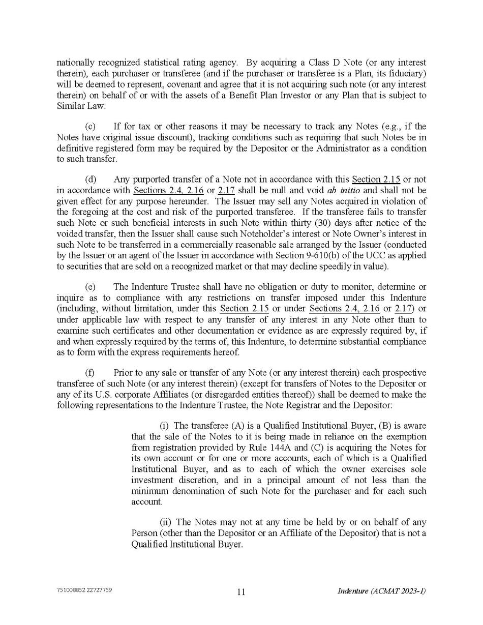 751008852 22727759 11 Indenture (ACMAT 2023 - 1) nationally recognized statistical rating agency . By acquiring a Class D Note (or any interest therein), each purchaser or transferee (and if the purchaser or transferee is a Plan, its fiduciary) will be deemed to represent, covenant and agree that it is not acquiring such note (or any interest therein) on behalf of or with the assets of a Benefit Plan Investor or any Plan that is subject to Similar Law . (c) If for tax or other reasons it may be necessary to track any Notes (e . g . , if the Notes have original issue discount), tracking conditions such as requiring that such Notes be in definitive registered form may be required by the Depositor or the Administrator as a condition to such transfer . (d) Any purported transfer of a Note not in accordance with this Section 2 . 15 or not in accordance with Sections 2 . 4 , 2 . 16 or 2 . 17 shall be null and void ab initio and shall not be given effect for any purpose hereunder . The Issuer may sell any Notes acquired in violation of the foregoing at the cost and risk of the purported transferee . If the transferee fails to transfer such Note or such beneficial interests in such Note within thirty ( 30 ) days after notice of the voided transfer, then the Issuer shall cause such Noteholder’s interest or Note Owner’s interest in such Note to be transferred in a commercially reasonable sale arranged by the Issuer (conducted by the Issuer or an agent of the Issuer in accordance with Section 9 - 610 (b) of the UCC as applied to securities that are sold on a recognized market or that may decline speedily in value) . (e) The Indenture Trustee shall have no obligation or duty to monitor, determine or inquire as to compliance with any restrictions on transfer imposed under this Indenture (including, without limitation, under this Section 2 . 15 or under Sections 2 . 4 , 2 . 16 or 2 . 17 ) or under applicable law with respect to any transfer of any interest in any Note other than to examine such certificates and other documentation or evidence as are expressly required by, if and when expressly required by the terms of, this Indenture, to determine substantial compliance as to form with the express requirements hereof . (f) Prior to any sale or transfer of any Note (or any interest therein) each prospective transferee of such Note (or any interest therein) (except for transfers of Notes to the Depositor or any of its U . S . corporate Affiliates (or disregarded entities thereof)) shall be deemed to make the following representations to the Indenture Trustee, the Note Registrar and the Depositor : (i) The transferee (A) is a Qualified Institutional Buyer, (B) is aware that the sale of the Notes to it is being made in reliance on the exemption from registration provided by Rule 144 A and (C) is acquiring the Notes for its own account or for one or more accounts, each of which is a Qualified Institutional Buyer, and as to each of which the owner exercises sole investment discretion, and in a principal amount of not less than the minimum denomination of such Note for the purchaser and for each such account . (ii) The Notes may not at any time be held by or on behalf of any Person (other than the Depositor or an Affiliate of the Depositor) that is not a Qualified Institutional Buyer .