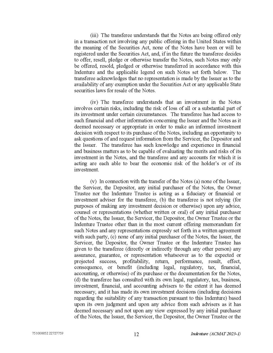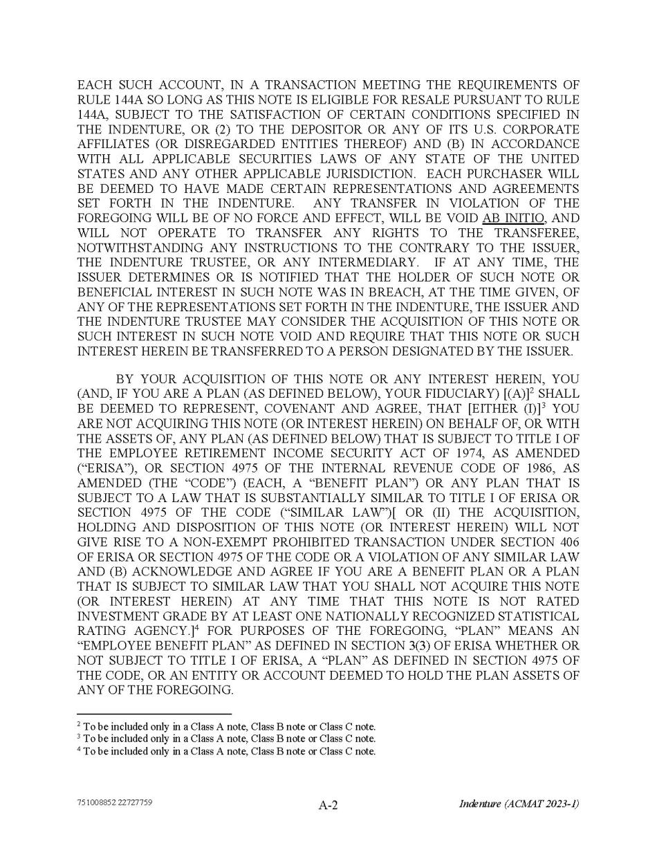 EACH SUCH ACCOUNT, IN A TRANSACTION MEETING THE REQUIREMENTS OF RULE 144 A SO LONG AS THIS NOTE IS ELIGIBLE FOR RESALE PURSUANT TO RULE 144 A, SUBJECT TO THE SATISFACTION OF CERTAIN CONDITIONS SPECIFIED IN THE INDENTURE, OR ( 2 ) TO THE DEPOSITOR OR ANY OF ITS U . S . CORPORATE AFFILIATES (OR DISREGARDED ENTITIES THEREOF) AND (B) IN ACCORDANCE WITH ALL APPLICABLE SECURITIES LAWS OF ANY STATE OF THE UNITED STATES AND ANY OTHER APPLICABLE JURISDICTION . EACH PURCHASER WILL BE DEEMED TO HAVE MADE CERTAIN REPRESENTATIONS AND AGREEMENTS SET FORTH IN THE INDENTURE . ANY TRANSFER IN VIOLATION OF THE FOREGOING WILL BE OF NO FORCE AND EFFECT, WILL BE VOID AB INITIO , AND WILL NOT OPERATE TO TRANSFER ANY RIGHTS TO THE TRANSFEREE, NOTWITHSTANDING ANY INSTRUCTIONS TO THE CONTRARY TO THE ISSUER, THE INDENTURE TRUSTEE, OR ANY INTERMEDIARY . IF AT ANY TIME, THE ISSUER DETERMINES OR IS NOTIFIED THAT THE HOLDER OF SUCH NOTE OR BENEFICIAL INTEREST IN SUCH NOTE WAS IN BREACH, AT THE TIME GIVEN, OF ANY OF THE REPRESENTATIONS SET FORTH IN THE INDENTURE, THE ISSUER AND THE INDENTURE TRUSTEE MAY CONSIDER THE ACQUISITION OF THIS NOTE OR SUCH INTEREST IN SUCH NOTE VOID AND REQUIRE THAT THIS NOTE OR SUCH INTEREST HEREIN BE TRANSFERRED TO A PERSON DESIGNATED BY THE ISSUER . BY YOUR ACQUISITION OF THIS NOTE OR ANY INTEREST HEREIN, YOU (AND, IF YOU ARE A PLAN (AS DEFINED BELOW), YOUR FIDUCIARY) [(A)] 2 SHALL BE DEEMED TO REPRESENT, COVENANT AND AGREE, THAT [EITHER (I)] 3 YOU ARE NOT ACQUIRING THIS NOTE (OR INTEREST HEREIN) ON BEHALF OF, OR WITH THE ASSETS OF, ANY PLAN (AS DEFINED BELOW) THAT IS SUBJECT TO TITLE I OF THE EMPLOYEE RETIREMENT INCOME SECURITY ACT OF 1974 , AS AMENDED (“ERISA”), OR SECTION 4975 OF THE INTERNAL REVENUE CODE OF 1986 , AS AMENDED (THE “CODE”) (EACH, A “BENEFIT PLAN”) OR ANY PLAN THAT IS SUBJECT TO A LAW THAT IS SUBSTANTIALLY SIMILAR TO TITLE I OF ERISA OR SECTION 4975 OF THE CODE (“SIMILAR LAW”)[ OR (II) THE ACQUISITION, HOLDING AND DISPOSITION OF THIS NOTE (OR INTEREST HEREIN) WILL NOT GIVE RISE TO A NON - EXEMPT PROHIBITED TRANSACTION UNDER SECTION 406 OF ERISA OR SECTION 4975 OF THE CODE OR A VIOLATION OF ANY SIMILAR LAW AND (B) ACKNOWLEDGE AND AGREE IF YOU ARE A BENEFIT PLAN OR A PLAN THAT IS SUBJECT TO SIMILAR LAW THAT YOU SHALL NOT ACQUIRE THIS NOTE (OR INTEREST HEREIN) AT ANY TIME THAT THIS NOTE IS NOT RATED INVESTMENT GRADE BY AT LEAST ONE NATIONALLY RECOGNIZED STATISTICAL RATING AGENCY . ] 4 FOR PURPOSES OF THE FOREGOING, “PLAN” MEANS AN “EMPLOYEE BENEFIT PLAN” AS DEFINED IN SECTION 3 ( 3 ) OF ERISA WHETHER OR NOT SUBJECT TO TITLE I OF ERISA, A “PLAN” AS DEFINED IN SECTION 4975 OF THE CODE, OR AN ENTITY OR ACCOUNT DEEMED TO HOLD THE PLAN ASSETS OF ANY OF THE FOREGOING . 2 To be included only in a Class A note, Class B note or Class C note. 3 To be included only in a Class A note, Class B note or Class C note. 4 To be included only in a Class A note, Class B note or Class C note. 751008852 22727759 A - 2 Indenture (ACMAT 2023 - 1)