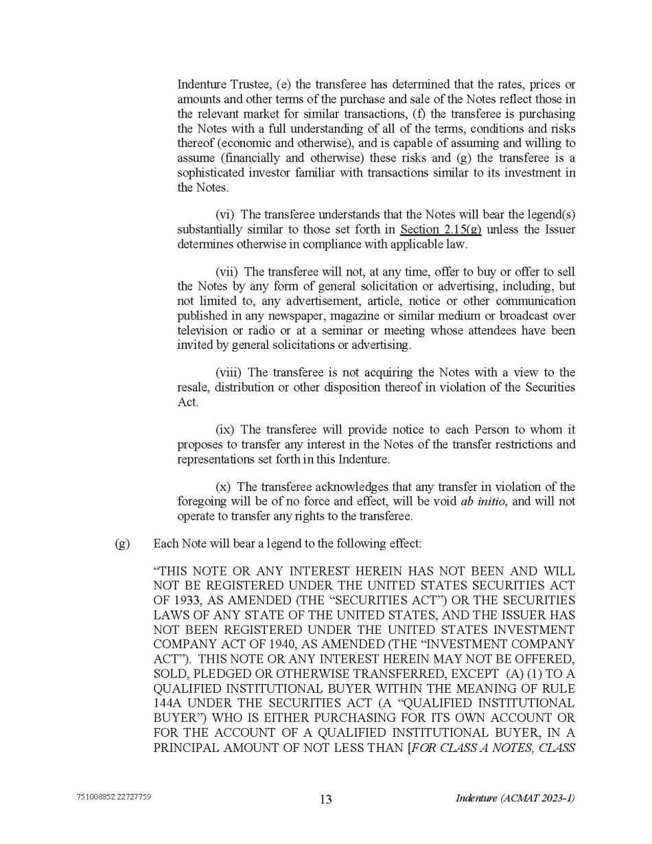 751008852 22727759 13 Indenture (ACMAT 2023 - 1) Indenture Trustee, (e) the transferee has determined that the rates, prices or amounts and other terms of the purchase and sale of the Notes reflect those in the relevant market for similar transactions, (f) the transferee is purchasing the Notes with a full understanding of all of the terms, conditions and risks thereof (economic and otherwise), and is capable of assuming and willing to assume (financially and otherwise) these risks and (g) the transferee is a sophisticated investor familiar with transactions similar to its investment in the Notes . (vi) The transferee understands that the Notes will bear the legend(s) substantially similar to those set forth in Section 2 . 15 (g) unless the Issuer determines otherwise in compliance with applicable law . (vii) The transferee will not, at any time, offer to buy or offer to sell the Notes by any form of general solicitation or advertising, including, but not limited to, any advertisement, article, notice or other communication published in any newspaper, magazine or similar medium or broadcast over television or radio or at a seminar or meeting whose attendees have been invited by general solicitations or advertising . (viii) The transferee is not acquiring the Notes with a view to the resale, distribution or other disposition thereof in violation of the Securities Act . (ix) The transferee will provide notice to each Person to whom it proposes to transfer any interest in the Notes of the transfer restrictions and representations set forth in this Indenture . (x) The transferee acknowledges that any transfer in violation of the foregoing will be of no force and effect, will be void ab initio , and will not operate to transfer any rights to the transferee . (g) Each Note will bear a legend to the following effect: “THIS NOTE OR ANY INTEREST HEREIN HAS NOT BEEN AND WILL NOT BE REGISTERED UNDER THE UNITED STATES SECURITIES ACT OF 1933 , AS AMENDED (THE “SECURITIES ACT”) OR THE SECURITIES LAWS OF ANY STATE OF THE UNITED STATES, AND THE ISSUER HAS NOT BEEN REGISTERED UNDER THE UNITED STATES INVESTMENT COMPANY ACT OF 1940 , AS AMENDED (THE “INVESTMENT COMPANY ACT”) . THIS NOTE OR ANY INTEREST HEREIN MAY NOT BE OFFERED, SOLD, PLEDGED OR OTHERWISE TRANSFERRED, EXCEPT (A) ( 1 ) TO A QUALIFIED INSTITUTIONAL BUYER WITHIN THE MEANING OF RULE 144 A UNDER THE SECURITIES ACT (A “QUALIFIED INSTITUTIONAL BUYER”) WHO IS EITHER PURCHASING FOR ITS OWN ACCOUNT OR FOR THE ACCOUNT OF A QUALIFIED INSTITUTIONAL BUYER, IN A PRINCIPAL AMOUNT OF NOT LESS THAN [ FOR CLASS A NOTES, CLASS