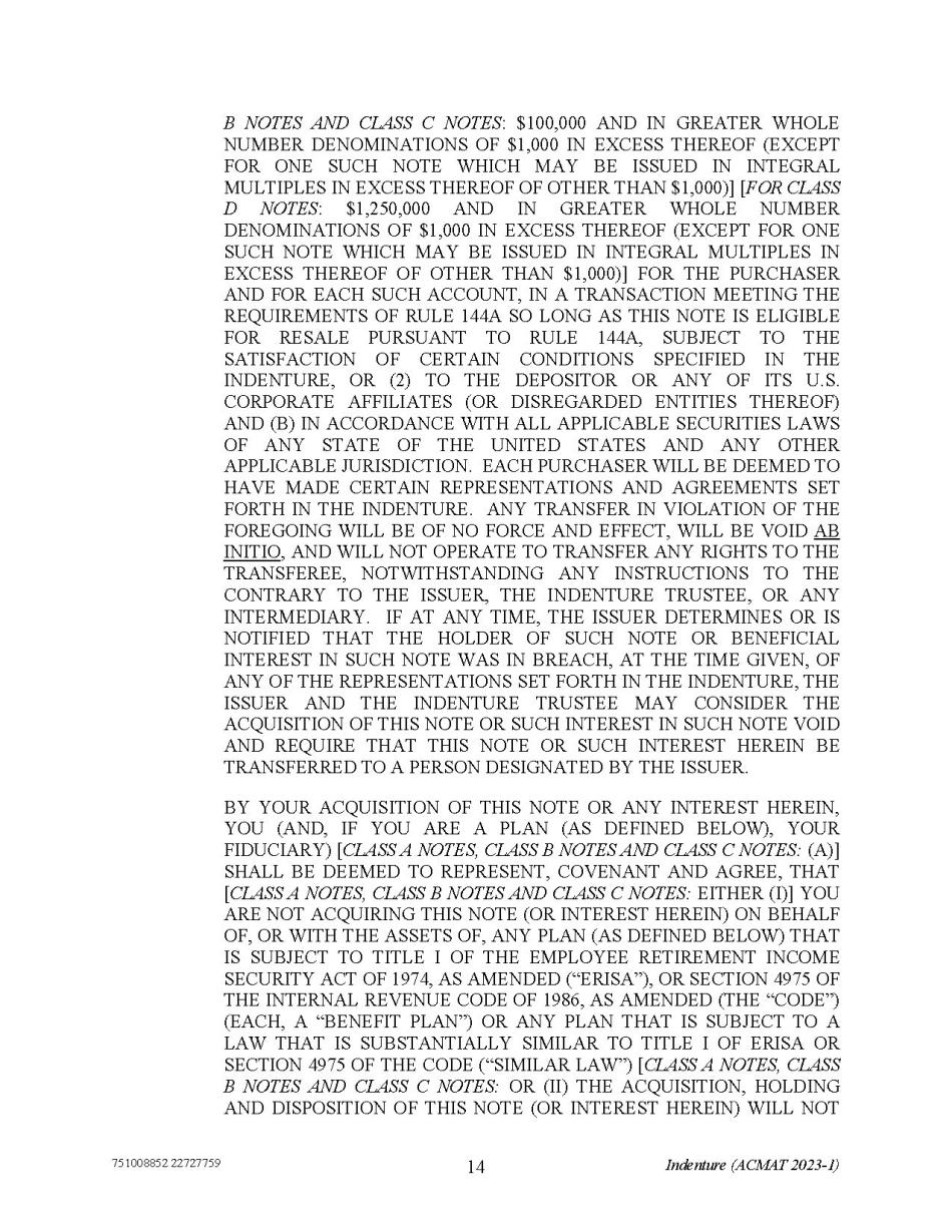 751008852 22727759 14 Indenture (ACMAT 2023 - 1) B NOTES AND CLASS C NOTES : $ 100 , 000 AND IN GREATER WHOLE NUMBER DENOMINATIONS OF $ 1 , 000 IN EXCESS THEREOF (EXCEPT FOR ONE SUCH NOTE WHICH MAY BE ISSUED IN INTEGRAL MULTIPLES IN EXCESS THEREOF OF OTHER THAN $ 1 , 000 )] [ FOR CLASS D NOTES : $ 1 , 250 , 000 AND IN GREATER WHOLE NUMBER DENOMINATIONS OF $ 1 , 000 IN EXCESS THEREOF (EXCEPT FOR ONE SUCH NOTE WHICH MAY BE ISSUED IN INTEGRAL MULTIPLES IN EXCESS THEREOF OF OTHER THAN $ 1 , 000 )] FOR THE PURCHASER AND FOR EACH SUCH ACCOUNT, IN A TRANSACTION MEETING THE REQUIREMENTS OF RULE 144 A SO LONG AS THIS NOTE IS ELIGIBLE FOR RESALE PURSUANT TO RULE 144 A, SUBJECT TO THE SATISFACTION OF CERTAIN CONDITIONS SPECIFIED IN THE INDENTURE, OR (2) TO THE CORPORATE AFFILIATES (OR DEPOSITOR OR ANY OF ITS U.S. DISREGARDED ENTITIES THEREOF) AND (B) IN ACCORDANCE WITH ALL APPLICABLE SECURITIES LAWS OF ANY STATE OF THE UNITED STATES AND ANY OTHER APPLICABLE JURISDICTION . EACH PURCHASER WILL BE DEEMED TO HAVE MADE CERTAIN REPRESENTATIONS AND AGREEMENTS SET FORTH IN THE INDENTURE . ANY TRANSFER IN VIOLATION OF THE FOREGOING WILL BE OF NO FORCE AND EFFECT, WILL BE VOID AB INITIO , AND WILL NOT OPERATE TO TRANSFER ANY RIGHTS TO THE TRANSFEREE, NOTWITHSTANDING ANY INSTRUCTIONS TO THE CONTRARY TO THE ISSUER, THE INDENTURE TRUSTEE, OR ANY INTERMEDIARY . IF AT ANY TIME, THE ISSUER DETERMINES OR IS NOTIFIED THAT THE HOLDER OF SUCH NOTE OR BENEFICIAL INTEREST IN SUCH NOTE WAS IN BREACH, AT THE TIME GIVEN, OF ANY OF THE REPRESENTATIONS SET FORTH IN THE INDENTURE, THE ISSUER AND THE INDENTURE TRUSTEE MAY CONSIDER THE ACQUISITION OF THIS NOTE OR SUCH INTEREST IN SUCH NOTE VOID AND REQUIRE THAT THIS NOTE OR SUCH INTEREST HEREIN BE TRANSFERRED TO A PERSON DESIGNATED BY THE ISSUER . BY YOUR ACQUISITION OF THIS NOTE OR ANY INTEREST HEREIN, YOU (AND, IF YOU ARE A PLAN (AS DEFINED BELOW), YOUR FIDUCIARY) [ CLASS A NOTES, CLASS B NOTES AND CLASS C NOTES : (A)] SHALL BE DEEMED TO REPRESENT, COVENANT AND AGREE, THAT [ CLASS A NOTES, CLASS B NOTES AND CLASS C NOTES : EITHER (I)] YOU ARE NOT ACQUIRING THIS NOTE (OR INTEREST HEREIN) ON BEHALF OF, OR WITH THE ASSETS OF, ANY PLAN (AS DEFINED BELOW) THAT IS SUBJECT TO TITLE I OF THE EMPLOYEE RETIREMENT INCOME SECURITY ACT OF 1974 , AS AMENDED (“ERISA”), OR SECTION 4975 OF THE INTERNAL REVENUE CODE OF 1986 , AS AMENDED (THE “CODE”) (EACH, A “BENEFIT PLAN”) OR ANY PLAN THAT IS SUBJECT TO A LAW THAT IS SUBSTANTIALLY SIMILAR TO TITLE I OF ERISA OR SECTION 4975 OF THE CODE (“SIMILAR LAW”) [ CLASS A NOTES, CLASS B NOTES AND CLASS C NOTES : OR (II) THE ACQUISITION, HOLDING AND DISPOSITION OF THIS NOTE (OR INTEREST HEREIN) WILL NOT