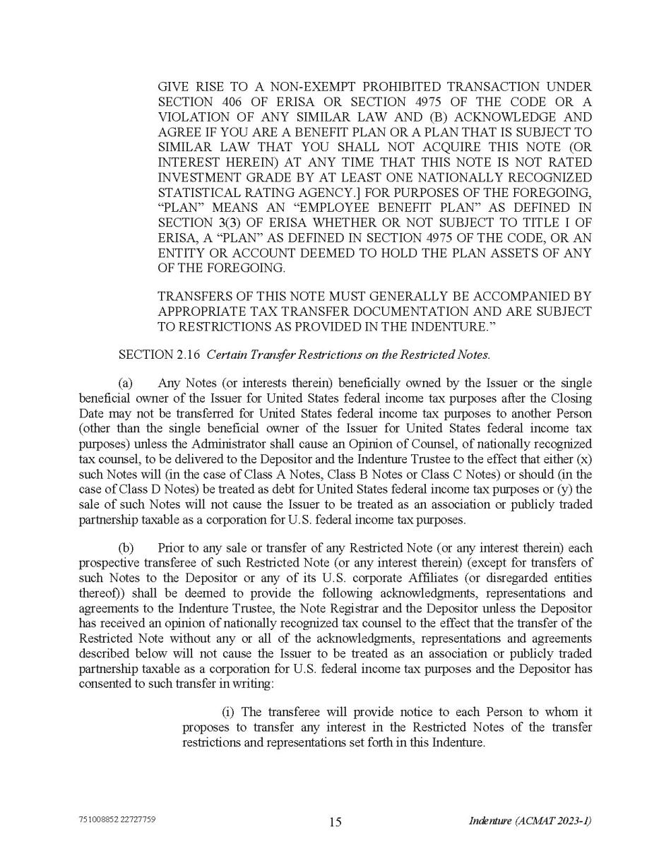 751008852 22727759 15 Indenture (ACMAT 2023 - 1) GIVE RISE TO A NON - EXEMPT PROHIBITED TRANSACTION UNDER SECTION 406 OF ERISA OR SECTION 4975 OF THE CODE OR A VIOLATION OF ANY SIMILAR LAW AND (B) ACKNOWLEDGE AND AGREE IF YOU ARE A BENEFIT PLAN OR A PLAN THAT IS SUBJECT TO SIMILAR LAW THAT YOU SHALL NOT ACQUIRE THIS NOTE (OR INTEREST HEREIN) AT ANY TIME THAT THIS NOTE IS NOT RATED INVESTMENT GRADE BY AT LEAST ONE NATIONALLY RECOGNIZED STATISTICAL RATING AGENCY . ] FOR PURPOSES OF THE FOREGOING, “PLAN” MEANS AN “EMPLOYEE BENEFIT PLAN” AS DEFINED IN SECTION 3 ( 3 ) OF ERISA WHETHER OR NOT SUBJECT TO TITLE I OF ERISA, A “PLAN” AS DEFINED IN SECTION 4975 OF THE CODE, OR AN ENTITY OR ACCOUNT DEEMED TO HOLD THE PLAN ASSETS OF ANY OF THE FOREGOING . TRANSFERS OF THIS NOTE MUST GENERALLY BE ACCOMPANIED BY APPROPRIATE TAX TRANSFER DOCUMENTATION AND ARE SUBJECT TO RESTRICTIONS AS PROVIDED IN THE INDENTURE . ” SECTION 2.16 Certain Transfer Restrictions on the Restricted Notes . (a) Any Notes (or interests therein) beneficially owned by the Issuer or the single beneficial owner of the Issuer for United States federal income tax purposes after the Closing Date may not be transferred for United States federal income tax purposes to another Person (other than the single beneficial owner of the Issuer for United States federal income tax purposes) unless the Administrator shall cause an Opinion of Counsel, of nationally recognized tax counsel, to be delivered to the Depositor and the Indenture Trustee to the effect that either (x) such Notes will (in the case of Class A Notes, Class B Notes or Class C Notes) or should (in the case of Class D Notes) be treated as debt for United States federal income tax purposes or (y) the sale of such Notes will not cause the Issuer to be treated as an association or publicly traded partnership taxable as a corporation for U . S . federal income tax purposes . (b) Prior to any sale or transfer of any Restricted Note (or any interest therein) each prospective transferee of such Restricted Note (or any interest therein) (except for transfers of such Notes to the Depositor or any of its U . S . corporate Affiliates (or disregarded entities thereof)) shall be deemed to provide the following acknowledgments, representations and agreements to the Indenture Trustee, the Note Registrar and the Depositor unless the Depositor has received an opinion of nationally recognized tax counsel to the effect that the transfer of the Restricted Note without any or all of the acknowledgments, representations and agreements described below will not cause the Issuer to be treated as an association or publicly traded partnership taxable as a corporation for U . S . federal income tax purposes and the Depositor has consented to such transfer in writing : (i) The transferee will provide notice to each Person to whom it proposes to transfer any interest in the Restricted Notes of the transfer restrictions and representations set forth in this Indenture .