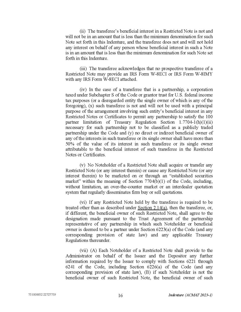 751008852 22727759 16 Indenture (ACMAT 2023 - 1) (ii) The transferee’s beneficial interest in a Restricted Note is not and will not be in an amount that is less than the minimum denomination for such Note set forth in this Indenture, and the transferee does not and will not hold any interest on behalf of any person whose beneficial interest in such a Note is in an amount that is less than the minimum denomination for such Note set forth in this Indenture . (iii) The transferee acknowledges that no prospective transferee of a Restricted Note may provide an IRS Form W - 8 ECI or IRS Form W - 8 IMY with any IRS Form W - 8 ECI attached . (iv) In the case of a transferee that is a partnership, a corporation taxed under Subchapter S of the Code or grantor trust for U . S . federal income tax purposes (or a disregarded entity the single owner of which is any of the foregoing), (x) such transferee is not and will not be used with a principal purpose of the arrangement involving such entity’s beneficial interest in any Restricted Notes or Certificates to permit any partnership to satisfy the 100 partner limitation of Treasury Regulation Section 1 . 7704 - 1 (h)( 1 )(ii) necessary for such partnership not to be classified as a publicly traded partnership under the Code and (y) no direct or indirect beneficial owner of any of the interests in such transferee or its single owner shall have more than 50 % of the value of its interest in such transferee or its single owner attributable to the beneficial interest of such transferee in the Restricted Notes or Certificates . (v) No Noteholder of a Restricted Note shall acquire or transfer any Restricted Note (or any interest therein) or cause any Restricted Note (or any interest therein) to be marketed on or through an “established securities market” within the meaning of Section 7704 (b)( 1 ) of the Code, including, without limitation, an over - the - counter market or an interdealer quotation system that regularly disseminates firm buy or sell quotations . (vi) If any Restricted Note held by the transferee is required to be treated other than as described under Section 2 . 14 (a) , then the transferee, or, if different, the beneficial owner of such Restricted Note, shall agree to the designation made pursuant to the Trust Agreement of the partnership representative of any partnership in which such Noteholder or beneficial owner is deemed to be a partner under Section 6223 (a) of the Code (and any corresponding provision of state law) and any applicable Treasury Regulations thereunder . (vii) (A) Each Noteholder of a Restricted Note shall provide to the Administrator on behalf of the Issuer and the Depositor any further information required by the Issuer to comply with Sections 6221 through 6241 of the Code, including Section 6226 (a) of the Code (and any corresponding provision of state law), (B) if such Noteholder is not the beneficial owner of such Restricted Note, the beneficial owner of such