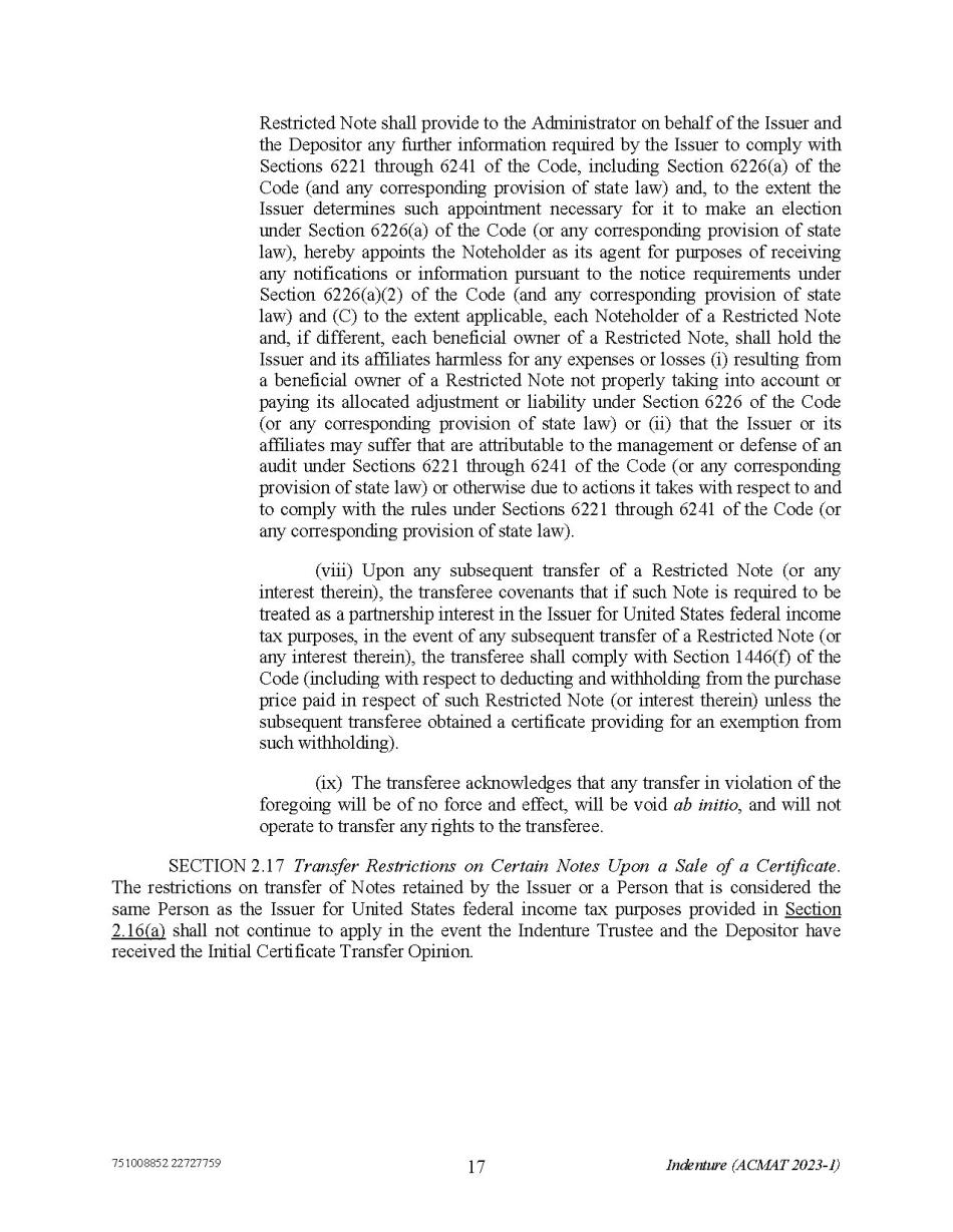 751008852 22727759 17 Indenture (ACMAT 2023 - 1) Restricted Note shall provide to the Administrator on behalf of the Issuer and the Depositor any further information required by the Issuer to comply with Sections 6221 through 6241 of the Code, including Section 6226 (a) of the Code (and any corresponding provision of state law) and, to the extent the Issuer determines such appointment necessary for it to make an election under Section 6226 (a) of the Code (or any corresponding provision of state law), hereby appoints the Noteholder as its agent for purposes of receiving any notifications or information pursuant to the notice requirements under Section 6226 (a)( 2 ) of the Code (and any corresponding provision of state law) and (C) to the extent applicable, each Noteholder of a Restricted Note and, if different, each beneficial owner of a Restricted Note, shall hold the Issuer and its affiliates harmless for any expenses or losses (i) resulting from a beneficial owner of a Restricted Note not properly taking into account or paying its allocated adjustment or liability under Section 6226 of the Code (or any corresponding provision of state law) or (ii) that the Issuer or its affiliates may suffer that are attributable to the management or defense of an audit under Sections 6221 through 6241 of the Code (or any corresponding provision of state law) or otherwise due to actions it takes with respect to and to comply with the rules under Sections 6221 through 6241 of the Code (or any corresponding provision of state law) . (viii) Upon any subsequent transfer of a Restricted Note (or any interest therein), the transferee covenants that if such Note is required to be treated as a partnership interest in the Issuer for United States federal income tax purposes, in the event of any subsequent transfer of a Restricted Note (or any interest therein), the transferee shall comply with Section 1446 (f) of the Code (including with respect to deducting and withholding from the purchase price paid in respect of such Restricted Note (or interest therein) unless the subsequent transferee obtained a certificate providing for an exemption from such withholding) . (ix) The transferee acknowledges that any transfer in violation of the foregoing will be of no force and effect, will be void ab initio , and will not operate to transfer any rights to the transferee . SECTION 2 . 17 Transfer Restrictions on Certain Notes Upon a Sale of a Certificate . The restrictions on transfer of Notes retained by the Issuer or a Person that is considered the same Person as the Issuer for United States federal income tax purposes provided in Section 2 . 16 (a) shall not continue to apply in the event the Indenture Trustee and the Depositor have received the Initial Certificate Transfer Opinion .