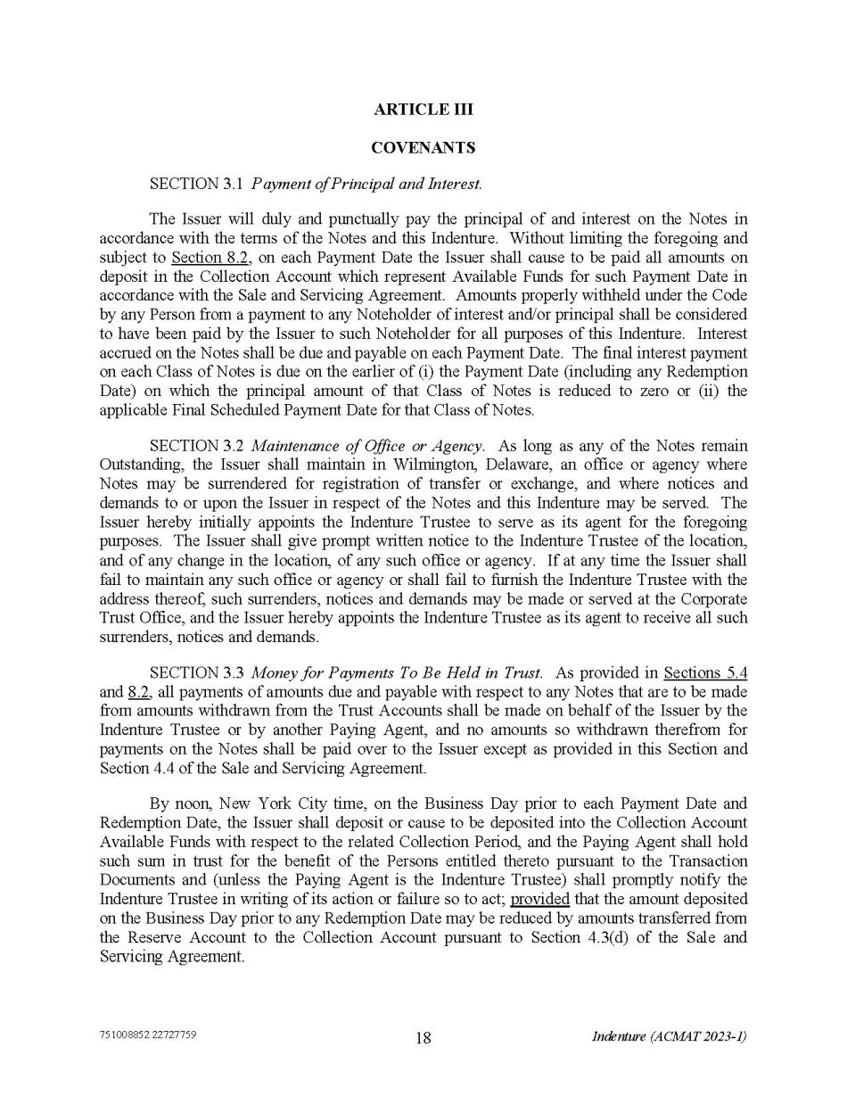 751008852 22727759 18 Indenture (ACMAT 2023 - 1) ARTICLE III COVENANTS SECTION 3.1 Payment of Principal and Interest . The Issuer will duly and punctually pay the principal of and interest on the Notes in accordance with the terms of the Notes and this Indenture . Without limiting the foregoing and subject to Section 8 . 2 , on each Payment Date the Issuer shall cause to be paid all amounts on deposit in the Collection Account which represent Available Funds for such Payment Date in accordance with the Sale and Servicing Agreement . Amounts properly withheld under the Code by any Person from a payment to any Noteholder of interest and/or principal shall be considered to have been paid by the Issuer to such Noteholder for all purposes of this Indenture . Interest accrued on the Notes shall be due and payable on each Payment Date . The final interest payment on each Class of Notes is due on the earlier of (i) the Payment Date (including any Redemption Date) on which the principal amount of that Class of Notes is reduced to zero or (ii) the applicable Final Scheduled Payment Date for that Class of Notes . SECTION 3 . 2 Maintenance of Office or Agency . As long as any of the Notes remain Outstanding, the Issuer shall maintain in Wilmington, Delaware, an office or agency where Notes may be surrendered for registration of transfer or exchange, and where notices and demands to or upon the Issuer in respect of the Notes and this Indenture may be served . The Issuer hereby initially appoints the Indenture Trustee to serve as its agent for the foregoing purposes . The Issuer shall give prompt written notice to the Indenture Trustee of the location, and of any change in the location, of any such office or agency . If at any time the Issuer shall fail to maintain any such office or agency or shall fail to furnish the Indenture Trustee with the address thereof, such surrenders, notices and demands may be made or served at the Corporate Trust Office, and the Issuer hereby appoints the Indenture Trustee as its agent to receive all such surrenders, notices and demands . SECTION 3 . 3 Money for Payments To Be Held in Trust . As provided in Sections 5 . 4 and 8 . 2 , all payments of amounts due and payable with respect to any Notes that are to be made from amounts withdrawn from the Trust Accounts shall be made on behalf of the Issuer by the Indenture Trustee or by another Paying Agent, and no amounts so withdrawn therefrom for payments on the Notes shall be paid over to the Issuer except as provided in this Section and Section 4 . 4 of the Sale and Servicing Agreement . By noon, New York City time, on the Business Day prior to each Payment Date and Redemption Date, the Issuer shall deposit or cause to be deposited into the Collection Account Available Funds with respect to the related Collection Period, and the Paying Agent shall hold such sum in trust for the benefit of the Persons entitled thereto pursuant to the Transaction Documents and (unless the Paying Agent is the Indenture Trustee) shall promptly notify the Indenture Trustee in writing of its action or failure so to act ; provided that the amount deposited on the Business Day prior to any Redemption Date may be reduced by amounts transferred from the Reserve Account to the Collection Account pursuant to Section 4 . 3 (d) of the Sale and Servicing Agreement .