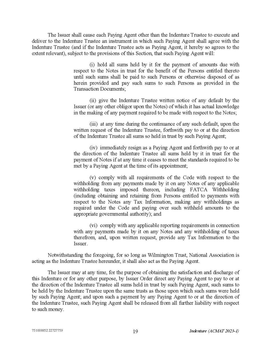 751008852 22727759 19 Indenture (ACMAT 2023 - 1) The Issuer shall cause each Paying Agent other than the Indenture Trustee to execute and deliver to the Indenture Trustee an instrument in which such Paying Agent shall agree with the Indenture Trustee (and if the Indenture Trustee acts as Paying Agent, it hereby so agrees to the extent relevant), subject to the provisions of this Section, that such Paying Agent will : (i) hold all sums held by it for the payment of amounts due with respect to the Notes in trust for the benefit of the Persons entitled thereto until such sums shall be paid to such Persons or otherwise disposed of as herein provided and pay such sums to such Persons as provided in the Transaction Documents ; (ii) give the Indenture Trustee written notice of any default by the Issuer (or any other obligor upon the Notes) of which it has actual knowledge in the making of any payment required to be made with respect to the Notes ; (iii) at any time during the continuance of any such default, upon the written request of the Indenture Trustee, forthwith pay to or at the direction of the Indenture Trustee all sums so held in trust by such Paying Agent ; (iv) immediately resign as a Paying Agent and forthwith pay to or at the direction of the Indenture Trustee all sums held by it in trust for the payment of Notes if at any time it ceases to meet the standards required to be met by a Paying Agent at the time of its appointment ; (v) comply with all requirements of the Code with respect to the withholding from any payments made by it on any Notes of any applicable withholding taxes imposed thereon, including FATCA Withholding (including obtaining and retaining from Persons entitled to payments with respect to the Notes any Tax Information, making any withholdings as required under the Code and paying over such withheld amounts to the appropriate governmental authority) ; and (vi) comply with any applicable reporting requirements in connection with any payments made by it on any Notes and any withholding of taxes therefrom, and, upon written request, provide any Tax Information to the Issuer . Notwithstanding the foregoing, for so long as Wilmington Trust, National Association is acting as the Indenture Trustee hereunder, it shall also act as the Paying Agent . The Issuer may at any time, for the purpose of obtaining the satisfaction and discharge of this Indenture or for any other purpose, by Issuer Order direct any Paying Agent to pay to or at the direction of the Indenture Trustee all sums held in trust by such Paying Agent, such sums to be held by the Indenture Trustee upon the same trusts as those upon which such sums were held by such Paying Agent ; and upon such a payment by any Paying Agent to or at the direction of the Indenture Trustee, such Paying Agent shall be released from all further liability with respect to such money .