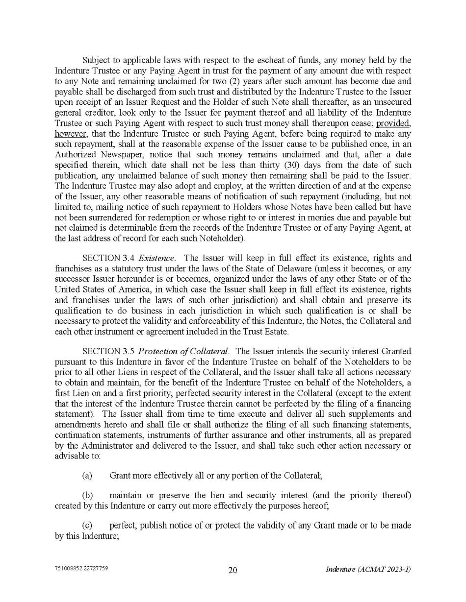 751008852 22727759 20 Indenture (ACMAT 2023 - 1) Subject to applicable laws with respect to the escheat of funds, any money held by the Indenture Trustee or any Paying Agent in trust for the payment of any amount due with respect to any Note and remaining unclaimed for two ( 2 ) years after such amount has become due and payable shall be discharged from such trust and distributed by the Indenture Trustee to the Issuer upon receipt of an Issuer Request and the Holder of such Note shall thereafter, as an unsecured general creditor, look only to the Issuer for payment thereof and all liability of the Indenture Trustee or such Paying Agent with respect to such trust money shall thereupon cease ; provided , however , that the Indenture Trustee or such Paying Agent, before being required to make any such repayment, shall at the reasonable expense of the Issuer cause to be published once, in an Authorized Newspaper, notice that such money remains unclaimed and that, after a date specified therein, which date shall not be less than thirty ( 30 ) days from the date of such publication, any unclaimed balance of such money then remaining shall be paid to the Issuer . The Indenture Trustee may also adopt and employ, at the written direction of and at the expense of the Issuer, any other reasonable means of notification of such repayment (including, but not limited to, mailing notice of such repayment to Holders whose Notes have been called but have not been surrendered for redemption or whose right to or interest in monies due and payable but not claimed is determinable from the records of the Indenture Trustee or of any Paying Agent, at the last address of record for each such Noteholder) . SECTION 3 . 4 Existence . The Issuer will keep in full effect its existence, rights and franchises as a statutory trust under the laws of the State of Delaware (unless it becomes, or any successor Issuer hereunder is or becomes, organized under the laws of any other State or of the United States of America, in which case the Issuer shall keep in full effect its existence, rights and franchises under the laws of such other jurisdiction) and shall obtain and preserve its qualification to do business in each jurisdiction in which such qualification is or shall be necessary to protect the validity and enforceability of this Indenture, the Notes, the Collateral and each other instrument or agreement included in the Trust Estate . SECTION 3 . 5 Protection of Collateral . The Issuer intends the security interest Granted pursuant to this Indenture in favor of the Indenture Trustee on behalf of the Noteholders to be prior to all other Liens in respect of the Collateral, and the Issuer shall take all actions necessary to obtain and maintain, for the benefit of the Indenture Trustee on behalf of the Noteholders, a first Lien on and a first priority, perfected security interest in the Collateral (except to the extent that the interest of the Indenture Trustee therein cannot be perfected by the filing of a financing statement) . The Issuer shall from time to time execute and deliver all such supplements and amendments hereto and shall file or shall authorize the filing of all such financing statements, continuation statements, instruments of further assurance and other instruments, all as prepared by the Administrator and delivered to the Issuer, and shall take such other action necessary or advisable to : (a) Grant more effectively all or any portion of the Collateral; (b) maintain or preserve the lien and security interest (and the priority thereof) created by this Indenture or carry out more effectively the purposes hereof; (c) perfect, publish notice of or protect the validity of any Grant made or to be made by this Indenture;