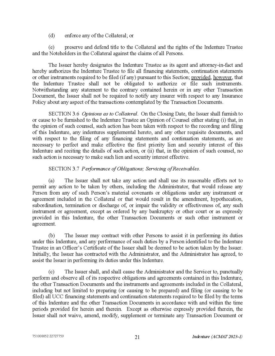 751008852 22727759 21 Indenture (ACMAT 2023 - 1) (d) enforce any of the Collateral; or (e) preserve and defend title to the Collateral and the rights of the Indenture Trustee and the Noteholders in the Collateral against the claims of all Persons . The Issuer hereby designates the Indenture Trustee as its agent and attorney - in - fact and hereby authorizes the Indenture Trustee to file all financing statements, continuation statements or other instruments required to be filed (if any) pursuant to this Section ; provided , however , that the Indenture Trustee shall not be obligated to authorize or file such instruments . Notwithstanding any statement to the contrary contained herein or in any other Transaction Document, the Issuer shall not be required to notify any insurer with respect to any Insurance Policy about any aspect of the transactions contemplated by the Transaction Documents . SECTION 3 . 6 Opinions as to Collateral . On the Closing Date, the Issuer shall furnish to or cause to be furnished to the Indenture Trustee an Opinion of Counsel either stating (i) that, in the opinion of such counsel, such action has been taken with respect to the recording and filing of this Indenture, any indentures supplemental hereto, and any other requisite documents, and with respect to the filing of any financing statements and continuation statements, as are necessary to perfect and make effective the first priority lien and security interest of this Indenture and reciting the details of such action, or (ii) that, in the opinion of such counsel, no such action is necessary to make such lien and security interest effective . SECTION 3.7 Performance of Obligations; Servicing of Receivables . (a) The Issuer shall not take any action and shall use its reasonable efforts not to permit any action to be taken by others, including the Administrator, that would release any Person from any of such Person’s material covenants or obligations under any instrument or agreement included in the Collateral or that would result in the amendment, hypothecation, subordination, termination or discharge of, or impair the validity or effectiveness of, any such instrument or agreement, except as ordered by any bankruptcy or other court or as expressly provided in this Indenture, the other Transaction Documents or such other instrument or agreement . (b) The Issuer may contract with other Persons to assist it in performing its duties under this Indenture, and any performance of such duties by a Person identified to the Indenture Trustee in an Officer’s Certificate of the Issuer shall be deemed to be action taken by the Issuer . Initially, the Issuer has contracted with the Administrator, and the Administrator has agreed, to assist the Issuer in performing its duties under this Indenture . (c) The Issuer shall, and shall cause the Administrator and the Servicer to, punctually perform and observe all of its respective obligations and agreements contained in this Indenture, the other Transaction Documents and the instruments and agreements included in the Collateral, including but not limited to preparing (or causing to be prepared) and filing (or causing to be filed) all UCC financing statements and continuation statements required to be filed by the terms of this Indenture and the other Transaction Documents in accordance with and within the time periods provided for herein and therein . Except as otherwise expressly provided therein, the Issuer shall not waive, amend, modify, supplement or terminate any Transaction Document or