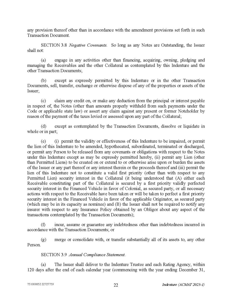 751008852 22727759 22 Indenture (ACMAT 2023 - 1) any provision thereof other than in accordance with the amendment provisions set forth in such Transaction Document. SECTION 3.8 Negative Covenants . So long as any Notes are Outstanding, the Issuer shall not: (a) engage in any activities other than financing, acquiring, owning, pledging and managing the Receivables and the other Collateral as contemplated by this Indenture and the other Transaction Documents ; (b) except as expressly permitted by this Indenture or in the other Transaction Documents, sell, transfer, exchange or otherwise dispose of any of the properties or assets of the Issuer ; (c) claim any credit on, or make any deduction from the principal or interest payable in respect of, the Notes (other than amounts properly withheld from such payments under the Code or applicable state law) or assert any claim against any present or former Noteholder by reason of the payment of the taxes levied or assessed upon any part of the Collateral ; (d) except as contemplated by the Transaction Documents, dissolve or liquidate in whole or in part ; (e) (i) permit the validity or effectiveness of this Indenture to be impaired, or permit the lien of this Indenture to be amended, hypothecated, subordinated, terminated or discharged, or permit any Person to be released from any covenants or obligations with respect to the Notes under this Indenture except as may be expressly permitted hereby, (ii) permit any Lien (other than Permitted Liens) to be created on or extend to or otherwise arise upon or burden the assets of the Issuer or any part thereof or any interest therein or the proceeds thereof and (iii) permit the lien of this Indenture not to constitute a valid first priority (other than with respect to any Permitted Lien) security interest in the Collateral (it being understood that (A) either each Receivable constituting part of the Collateral is secured by a first priority validly perfected security interest in the Financed Vehicle in favor of Colonial, as secured party, or all necessary actions with respect to the Receivable have been taken or will be taken to perfect a first priority security interest in the Financed Vehicle in favor of the applicable Originator, as secured party (which may be in its capacity as nominee) and (B) the Issuer shall not be required to notify any insurer with respect to any Insurance Policy obtained by an Obligor about any aspect of the transactions contemplated by the Transaction Documents) ; (f) incur, assume or guarantee any indebtedness other than indebtedness incurred in accordance with the Transaction Documents ; or (g) merge or consolidate with, or transfer substantially all of its assets to, any other Person. SECTION 3.9 Annual Compliance Statement . (a) The Issuer shall deliver to the Indenture Trustee and each Rating Agency, within 120 days after the end of each calendar year (commencing with the year ending December 31 ,