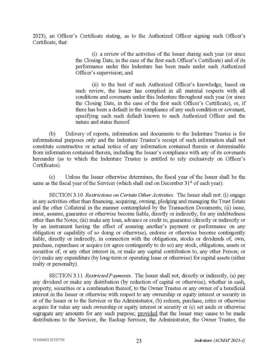 751008852 22727759 23 Indenture (ACMAT 2023 - 1) 2023), an Officer’s Certificate stating, as to the Authorized Officer signing such Officer’s Certificate, that: (i) a review of the activities of the Issuer during such year (or since the Closing Date, in the case of the first such Officer’s Certificate) and of its performance under this Indenture has been made under such Authorized Officer’s supervision ; and (ii) to the best of such Authorized Officer’s knowledge, based on such review, the Issuer has complied in all material respects with all conditions and covenants under this Indenture throughout such year (or since the Closing Date, in the case of the first such Officer’s Certificate), or, if there has been a default in the compliance of any such condition or covenant, specifying each such default known to such Authorized Officer and the nature and status thereof . (b) Delivery of reports, information and documents to the Indenture Trustee is for informational purposes only and the Indenture Trustee’s receipt of such information shall not constitute constructive or actual notice of any information contained therein or determinable from information contained therein, including the Issuer’s compliance with any of its covenants hereunder (as to which the Indenture Trustee is entitled to rely exclusively on Officer’s Certificates) . (c) Unless the Issuer otherwise determines, the fiscal year of the Issuer shall be the same as the fiscal year of the Servicer (which shall end on December 31 st of each year) . SECTION 3 . 10 Restrictions on Certain Other Activities . The Issuer shall not : (i) engage in any activities other than financing, acquiring, owning, pledging and managing the Trust Estate and the other Collateral in the manner contemplated by the Transaction Documents ; (ii) issue, incur, assume, guarantee or otherwise become liable, directly or indirectly, for any indebtedness other than the Notes ; (iii) make any loan, advance or credit to, guarantee (directly or indirectly or by an instrument having the effect of assuring another’s payment or performance on any obligation or capability of so doing or otherwise), endorse or otherwise become contingently liable, directly or indirectly, in connection with the obligations, stocks or dividends of, own, purchase, repurchase or acquire (or agree contingently to do so) any stock, obligations, assets or securities of, or any other interest in, or make any capital contribution to, any other Person ; or (iv) make any expenditure (by long - term or operating lease or otherwise) for capital assets (either realty or personalty) . SECTION 3 . 11 Restricted Payments . The Issuer shall not, directly or indirectly, (a) pay any dividend or make any distribution (by reduction of capital or otherwise), whether in cash, property, securities or a combination thereof, to the Owner Trustee or any owner of a beneficial interest in the Issuer or otherwise with respect to any ownership or equity interest or security in or of the Issuer or to the Servicer or the Administrator, (b) redeem, purchase, retire or otherwise acquire for value any such ownership or equity interest or security or (c) set aside or otherwise segregate any amounts for any such purpose ; provided that the Issuer may cause to be made distributions to the Servicer, the Backup Servicer, the Administrator, the Owner Trustee, the