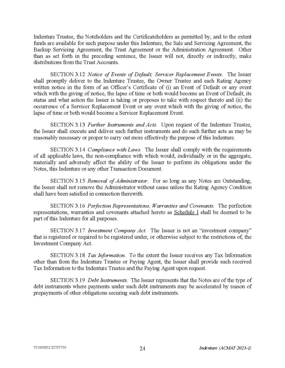 751008852 22727759 24 Indenture (ACMAT 2023 - 1) Indenture Trustee, the Noteholders and the Certificateholders as permitted by, and to the extent funds are available for such purpose under this Indenture, the Sale and Servicing Agreement, the Backup Servicing Agreement, the Trust Agreement or the Administration Agreement . Other than as set forth in the preceding sentence, the Issuer will not, directly or indirectly, make distributions from the Trust Accounts . SECTION 3 . 12 Notice of Events of Default ; Servicer Replacement Events . The Issuer shall promptly deliver to the Indenture Trustee, the Owner Trustee and each Rating Agency written notice in the form of an Officer’s Certificate of (i) an Event of Default or any event which with the giving of notice, the lapse of time or both would become an Event of Default, its status and what action the Issuer is taking or proposes to take with respect thereto and (ii) the occurrence of a Servicer Replacement Event or any event which with the giving of notice, the lapse of time or both would become a Servicer Replacement Event . SECTION 3 . 13 Further Instruments and Acts . Upon request of the Indenture Trustee, the Issuer shall execute and deliver such further instruments and do such further acts as may be reasonably necessary or proper to carry out more effectively the purpose of this Indenture . SECTION 3 . 14 Compliance with Laws . The Issuer shall comply with the requirements of all applicable laws, the non - compliance with which would, individually or in the aggregate, materially and adversely affect the ability of the Issuer to perform its obligations under the Notes, this Indenture or any other Transaction Document . SECTION 3 . 15 Removal of Administrator . For so long as any Notes are Outstanding, the Issuer shall not remove the Administrator without cause unless the Rating Agency Condition shall have been satisfied in connection therewith . SECTION 3 . 16 Perfection Representations, Warranties and Covenants . The perfection representations, warranties and covenants attached hereto as Schedule I shall be deemed to be part of this Indenture for all purposes . SECTION 3 . 17 Investment Company Act . The Issuer is not an “investment company” that is registered or required to be registered under, or otherwise subject to the restrictions of, the Investment Company Act . SECTION 3 . 18 Tax Information . To the extent the Issuer receives any Tax Information other than from the Indenture Trustee or Paying Agent, the Issuer shall provide such received Tax Information to the Indenture Trustee and the Paying Agent upon request . SECTION 3 . 19 Debt Instruments . The Issuer represents that the Notes are of the type of debt instruments where payments under such debt instruments may be accelerated by reason of prepayments of other obligations securing such debt instruments .