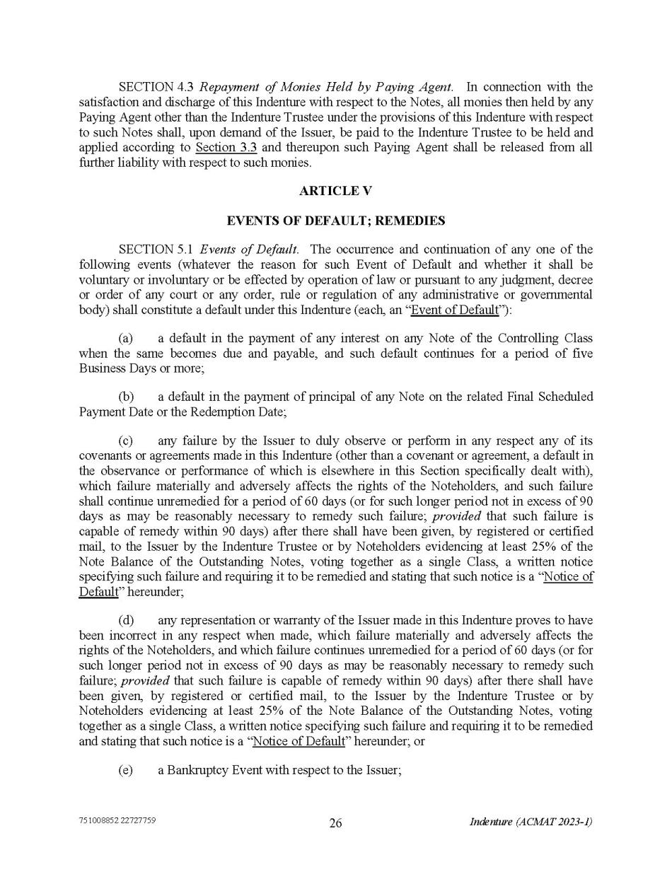 751008852 22727759 26 Indenture (ACMAT 2023 - 1) SECTION 4 . 3 Repayment of Monies Held by Paying Agent . In connection with the satisfaction and discharge of this Indenture with respect to the Notes, all monies then held by any Paying Agent other than the Indenture Trustee under the provisions of this Indenture with respect to such Notes shall, upon demand of the Issuer, be paid to the Indenture Trustee to be held and applied according to Section 3 . 3 and thereupon such Paying Agent shall be released from all further liability with respect to such monies . ARTICLE V EVENTS OF DEFAULT; REMEDIES SECTION 5 . 1 Events of Default . The occurrence and continuation of any one of the following events (whatever the reason for such Event of Default and whether it shall be voluntary or involuntary or be effected by operation of law or pursuant to any judgment, decree or order of any court or any order, rule or regulation of any administrative or governmental body) shall constitute a default under this Indenture (each, an “ Event of Default ”) : (a) a default in the payment of any interest on any Note of the Controlling Class when the same becomes due and payable, and such default continues for a period of five Business Days or more ; (b) a default in the payment of principal of any Note on the related Final Scheduled Payment Date or the Redemption Date ; (c) any failure by the Issuer to duly observe or perform in any respect any of its covenants or agreements made in this Indenture (other than a covenant or agreement, a default in the observance or performance of which is elsewhere in this Section specifically dealt with), which failure materially and adversely affects the rights of the Noteholders, and such failure shall continue unremedied for a period of 60 days (or for such longer period not in excess of 90 days as may be reasonably necessary to remedy such failure ; provided that such failure is capable of remedy within 90 days) after there shall have been given, by registered or certified mail, to the Issuer by the Indenture Trustee or by Noteholders evidencing at least 25 % of the Note Balance of the Outstanding Notes, voting together as a single Class, a written notice specifying such failure and requiring it to be remedied and stating that such notice is a “ Notice of Default ” hereunder ; (d) any representation or warranty of the Issuer made in this Indenture proves to have been incorrect in any respect when made, which failure materially and adversely affects the rights of the Noteholders, and which failure continues unremedied for a period of 60 days (or for such longer period not in excess of 90 days as may be reasonably necessary to remedy such failure ; provided that such failure is capable of remedy within 90 days) after there shall have been given, by registered or certified mail, to the Issuer by the Indenture Trustee or by Noteholders evidencing at least 25 % of the Note Balance of the Outstanding Notes, voting together as a single Class, a written notice specifying such failure and requiring it to be remedied and stating that such notice is a “ Notice of Default ” hereunder ; or (e) a Bankruptcy Event with respect to the Issuer;