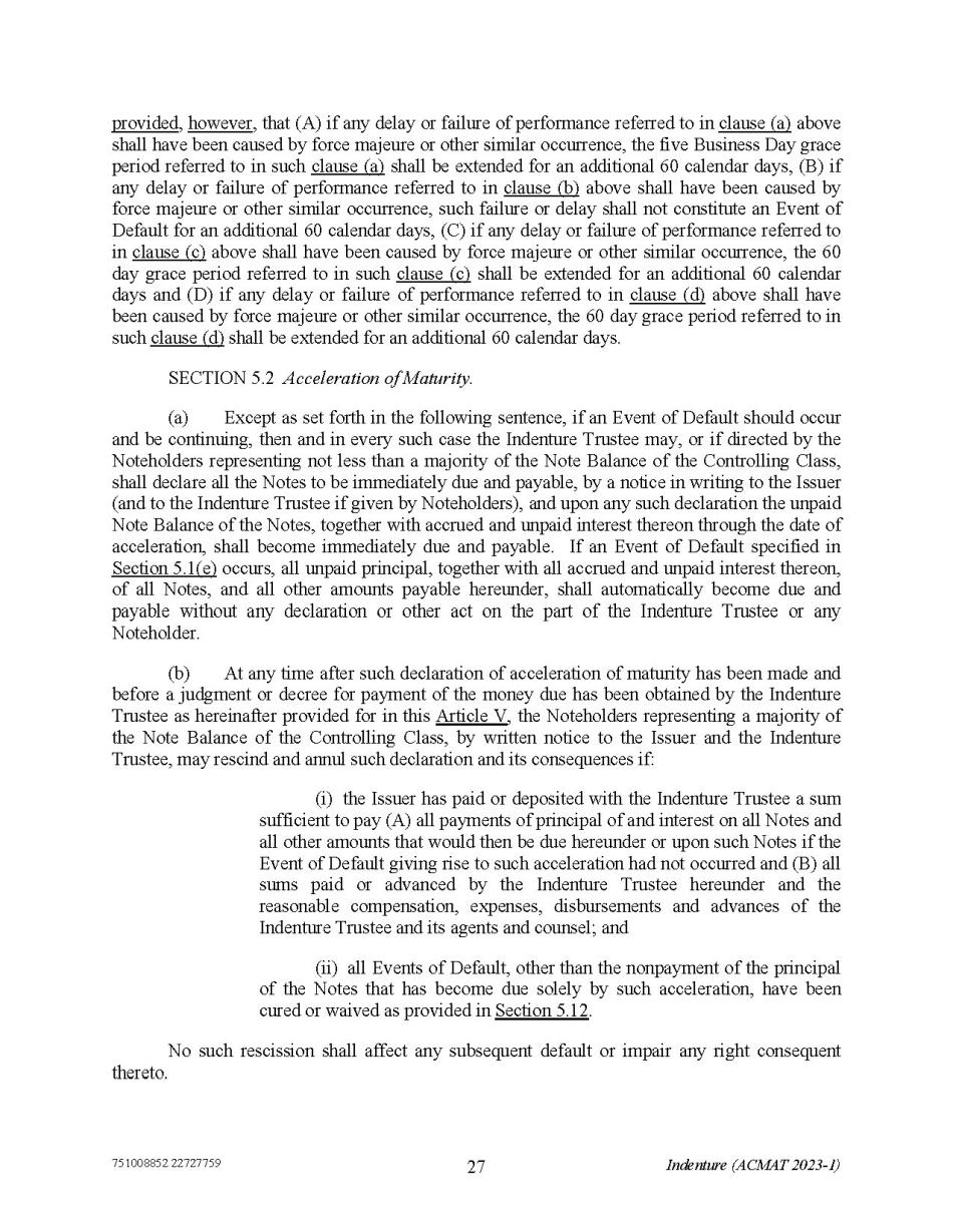 751008852 22727759 27 Indenture (ACMAT 2023 - 1) provided , however , that (A) if any delay or failure of performance referred to in clause (a) above shall have been caused by force majeure or other similar occurrence, the five Business Day grace period referred to in such clause (a) shall be extended for an additional 60 calendar days, (B) if any delay or failure of performance referred to in clause (b) above shall have been caused by force majeure or other similar occurrence, such failure or delay shall not constitute an Event of Default for an additional 60 calendar days, (C) if any delay or failure of performance referred to in clause (c) above shall have been caused by force majeure or other similar occurrence, the 60 day grace period referred to in such clause (c) shall be extended for an additional 60 calendar days and (D) if any delay or failure of performance referred to in clause (d) above shall have been caused by force majeure or other similar occurrence, the 60 day grace period referred to in such clause (d) shall be extended for an additional 60 calendar days . SECTION 5.2 Acceleration of Maturity . (a) Except as set forth in the following sentence, if an Event of Default should occur and be continuing, then and in every such case the Indenture Trustee may, or if directed by the Noteholders representing not less than a majority of the Note Balance of the Controlling Class, shall declare all the Notes to be immediately due and payable, by a notice in writing to the Issuer (and to the Indenture Trustee if given by Noteholders), and upon any such declaration the unpaid Note Balance of the Notes, together with accrued and unpaid interest thereon through the date of acceleration, shall become immediately due and payable . If an Event of Default specified in Section 5 . 1 (e) occurs, all unpaid principal, together with all accrued and unpaid interest thereon, of all Notes, and all other amounts payable hereunder, shall automatically become due and payable without any declaration or other act on the part of the Indenture Trustee or any Noteholder . (b) At any time after such declaration of acceleration of maturity has been made and before a judgment or decree for payment of the money due has been obtained by the Indenture Trustee as hereinafter provided for in this Article V , the Noteholders representing a majority of the Note Balance of the Controlling Class, by written notice to the Issuer and the Indenture Trustee, may rescind and annul such declaration and its consequences if : (i) the Issuer has paid or deposited with the Indenture Trustee a sum sufficient to pay (A) all payments of principal of and interest on all Notes and all other amounts that would then be due hereunder or upon such Notes if the Event of Default giving rise to such acceleration had not occurred and (B) all sums paid or advanced by the Indenture Trustee hereunder and the reasonable compensation, expenses, disbursements and advances of the Indenture Trustee and its agents and counsel ; and (ii) all Events of Default, other than the nonpayment of the principal of the Notes that has become due solely by such acceleration, have been cured or waived as provided in Section 5 . 12 . No such rescission shall affect any subsequent default or impair any right consequent thereto.