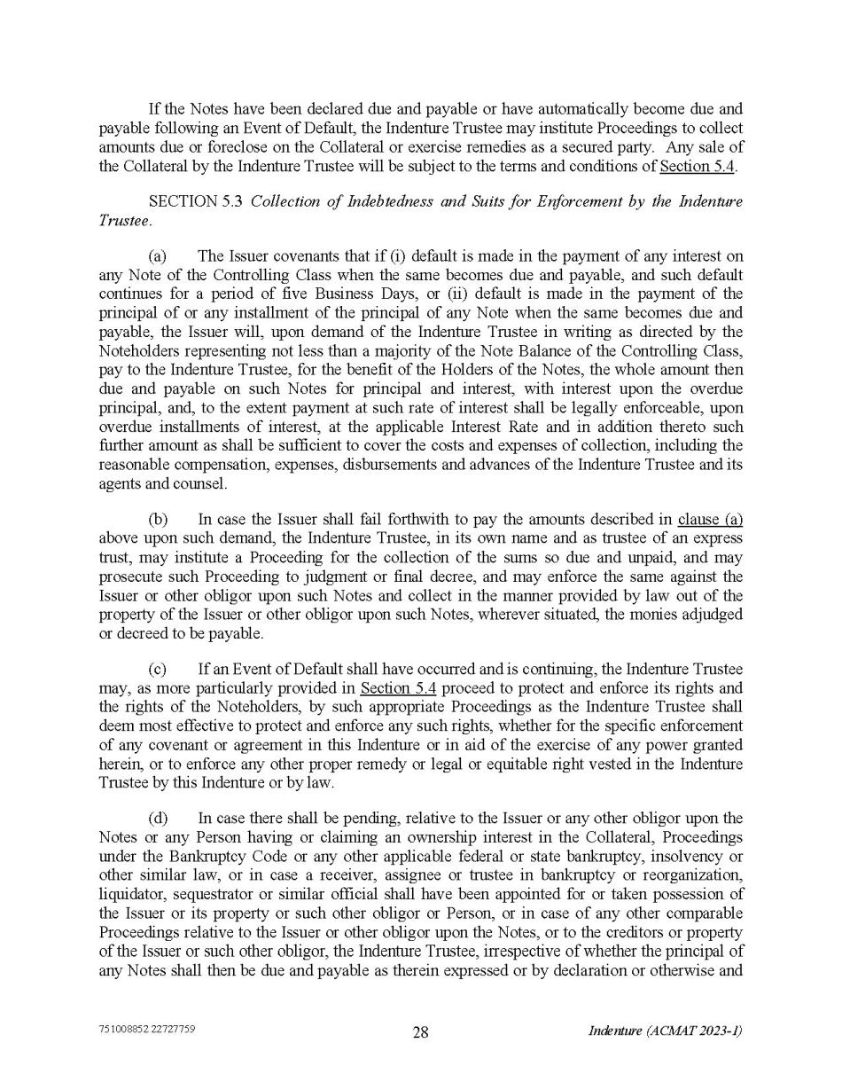 751008852 22727759 28 Indenture (ACMAT 2023 - 1) If the Notes have been declared due and payable or have automatically become due and payable following an Event of Default, the Indenture Trustee may institute Proceedings to collect amounts due or foreclose on the Collateral or exercise remedies as a secured party . Any sale of the Collateral by the Indenture Trustee will be subject to the terms and conditions of Section 5 . 4 . SECTION 5 . 3 Collection of Indebtedness and Suits for Enforcement by the Indenture Trustee . (a) The Issuer covenants that if (i) default is made in the payment of any interest on any Note of the Controlling Class when the same becomes due and payable, and such default continues for a period of five Business Days, or (ii) default is made in the payment of the principal of or any installment of the principal of any Note when the same becomes due and payable, the Issuer will, upon demand of the Indenture Trustee in writing as directed by the Noteholders representing not less than a majority of the Note Balance of the Controlling Class, pay to the Indenture Trustee, for the benefit of the Holders of the Notes, the whole amount then due and payable on such Notes for principal and interest, with interest upon the overdue principal, and, to the extent payment at such rate of interest shall be legally enforceable, upon overdue installments of interest, at the applicable Interest Rate and in addition thereto such further amount as shall be sufficient to cover the costs and expenses of collection, including the reasonable compensation, expenses, disbursements and advances of the Indenture Trustee and its agents and counsel . (b) In case the Issuer shall fail forthwith to pay the amounts described in clause (a) above upon such demand, the Indenture Trustee, in its own name and as trustee of an express trust, may institute a Proceeding for the collection of the sums so due and unpaid, and may prosecute such Proceeding to judgment or final decree, and may enforce the same against the Issuer or other obligor upon such Notes and collect in the manner provided by law out of the property of the Issuer or other obligor upon such Notes, wherever situated, the monies adjudged or decreed to be payable . (c) If an Event of Default shall have occurred and is continuing, the Indenture Trustee may, as more particularly provided in Section 5 . 4 proceed to protect and enforce its rights and the rights of the Noteholders, by such appropriate Proceedings as the Indenture Trustee shall deem most effective to protect and enforce any such rights, whether for the specific enforcement of any covenant or agreement in this Indenture or in aid of the exercise of any power granted herein, or to enforce any other proper remedy or legal or equitable right vested in the Indenture Trustee by this Indenture or by law . (d) In case there shall be pending, relative to the Issuer or any other obligor upon the Notes or any Person having or claiming an ownership interest in the Collateral, Proceedings under the Bankruptcy Code or any other applicable federal or state bankruptcy, insolvency or other similar law, or in case a receiver, assignee or trustee in bankruptcy or reorganization, liquidator, sequestrator or similar official shall have been appointed for or taken possession of the Issuer or its property or such other obligor or Person, or in case of any other comparable Proceedings relative to the Issuer or other obligor upon the Notes, or to the creditors or property of the Issuer or such other obligor, the Indenture Trustee, irrespective of whether the principal of any Notes shall then be due and payable as therein expressed or by declaration or otherwise and
