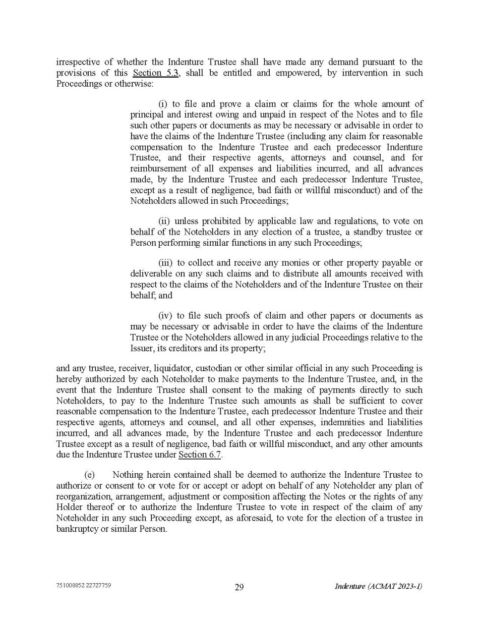 751008852 22727759 29 Indenture (ACMAT 2023 - 1) irrespective of whether the Indenture Trustee shall have made any demand pursuant to the provisions of this Section 5 . 3 , shall be entitled and empowered, by intervention in such Proceedings or otherwise : (i) to file and prove a claim or claims for the whole amount of principal and interest owing and unpaid in respect of the Notes and to file such other papers or documents as may be necessary or advisable in order to have the claims of the Indenture Trustee (including any claim for reasonable compensation to the Indenture Trustee and each predecessor Indenture Trustee, and their respective agents, attorneys and counsel, and for reimbursement of all expenses and liabilities incurred, and all advances made, by the Indenture Trustee and each predecessor Indenture Trustee, except as a result of negligence, bad faith or willful misconduct) and of the Noteholders allowed in such Proceedings ; (ii) unless prohibited by applicable law and regulations, to vote on behalf of the Noteholders in any election of a trustee, a standby trustee or Person performing similar functions in any such Proceedings ; (iii) to collect and receive any monies or other property payable or deliverable on any such claims and to distribute all amounts received with respect to the claims of the Noteholders and of the Indenture Trustee on their behalf ; and (iv) to file such proofs of claim and other papers or documents as may be necessary or advisable in order to have the claims of the Indenture Trustee or the Noteholders allowed in any judicial Proceedings relative to the Issuer, its creditors and its property ; and any trustee, receiver, liquidator, custodian or other similar official in any such Proceeding is hereby authorized by each Noteholder to make payments to the Indenture Trustee, and, in the event that the Indenture Trustee shall consent to the making of payments directly to such Noteholders, to pay to the Indenture Trustee such amounts as shall be sufficient to cover reasonable compensation to the Indenture Trustee, each predecessor Indenture Trustee and their respective agents, attorneys and counsel, and all other expenses, indemnities and liabilities incurred, and all advances made, by the Indenture Trustee and each predecessor Indenture Trustee except as a result of negligence, bad faith or willful misconduct, and any other amounts due the Indenture Trustee under Section 6 . 7 . (e) Nothing herein contained shall be deemed to authorize the Indenture Trustee to authorize or consent to or vote for or accept or adopt on behalf of any Noteholder any plan of reorganization, arrangement, adjustment or composition affecting the Notes or the rights of any Holder thereof or to authorize the Indenture Trustee to vote in respect of the claim of any Noteholder in any such Proceeding except, as aforesaid, to vote for the election of a trustee in bankruptcy or similar Person .