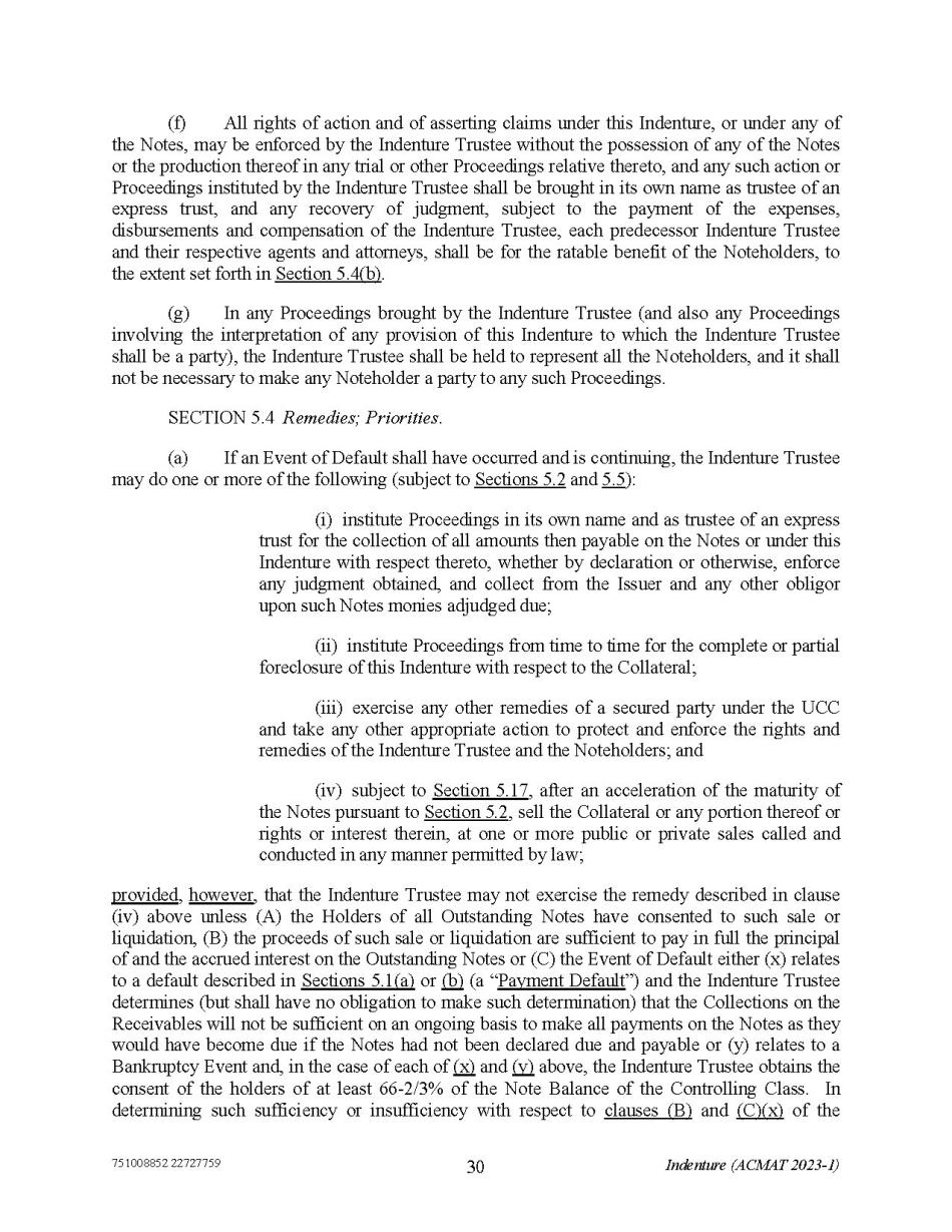 751008852 22727759 30 Indenture (ACMAT 2023 - 1) (f) All rights of action and of asserting claims under this Indenture, or under any of the Notes, may be enforced by the Indenture Trustee without the possession of any of the Notes or the production thereof in any trial or other Proceedings relative thereto, and any such action or Proceedings instituted by the Indenture Trustee shall be brought in its own name as trustee of an express trust, and any recovery of judgment, subject to the payment of the expenses, disbursements and compensation of the Indenture Trustee, each predecessor Indenture Trustee and their respective agents and attorneys, shall be for the ratable benefit of the Noteholders, to the extent set forth in Section 5 . 4 (b) . (g) In any Proceedings brought by the Indenture Trustee (and also any Proceedings involving the interpretation of any provision of this Indenture to which the Indenture Trustee shall be a party), the Indenture Trustee shall be held to represent all the Noteholders, and it shall not be necessary to make any Noteholder a party to any such Proceedings . SECTION 5.4 Remedies; Priorities . (a) If an Event of Default shall have occurred and is continuing, the Indenture Trustee may do one or more of the following (subject to Sections 5 . 2 and 5 . 5 ) : (i) institute Proceedings in its own name and as trustee of an express trust for the collection of all amounts then payable on the Notes or under this Indenture with respect thereto, whether by declaration or otherwise, enforce any judgment obtained, and collect from the Issuer and any other obligor upon such Notes monies adjudged due ; (ii) institute Proceedings from time to time for the complete or partial foreclosure of this Indenture with respect to the Collateral ; (iii) exercise any other remedies of a secured party under the UCC and take any other appropriate action to protect and enforce the rights and remedies of the Indenture Trustee and the Noteholders ; and (iv) subject to Section 5 . 17 , after an acceleration of the maturity of the Notes pursuant to Section 5 . 2 , sell the Collateral or any portion thereof or rights or interest therein, at one or more public or private sales called and conducted in any manner permitted by law ; provided , however , that the Indenture Trustee may not exercise the remedy described in clause (iv) above unless (A) the Holders of all Outstanding Notes have consented to such sale or liquidation, (B) the proceeds of such sale or liquidation are sufficient to pay in full the principal of and the accrued interest on the Outstanding Notes or (C) the Event of Default either (x) relates to a default described in Sections 5 . 1 (a) or (b) (a “ Payment Default ”) and the Indenture Trustee determines (but shall have no obligation to make such determination) that the Collections on the Receivables will not be sufficient on an ongoing basis to make all payments on the Notes as they would have become due if the Notes had not been declared due and payable or (y) relates to a Bankruptcy Event and, in the case of each of (x) and (y) above, the Indenture Trustee obtains the consent of the holders of at least 66 - 2 / 3 % of the Note Balance of the Controlling Class . In determining such sufficiency or insufficiency with respect to clauses (B) and (C)(x) of the