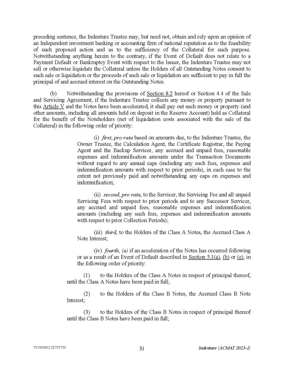 751008852 22727759 31 Indenture (ACMAT 2023 - 1) preceding sentence, the Indenture Trustee may, but need not, obtain and rely upon an opinion of an Independent investment banking or accounting firm of national reputation as to the feasibility of such proposed action and as to the sufficiency of the Collateral for such purpose . Notwithstanding anything herein to the contrary, if the Event of Default does not relate to a Payment Default or Bankruptcy Event with respect to the Issuer, the Indenture Trustee may not sell or otherwise liquidate the Collateral unless the Holders of all Outstanding Notes consent to such sale or liquidation or the proceeds of such sale or liquidation are sufficient to pay in full the principal of and accrued interest on the Outstanding Notes . (b) Notwithstanding the provisions of Section 8 . 2 hereof or Section 4 . 4 of the Sale and Servicing Agreement, if the Indenture Trustee collects any money or property pursuant to this Article V and the Notes have been accelerated, it shall pay out such money or property (and other amounts, including all amounts held on deposit in the Reserve Account) held as Collateral for the benefit of the Noteholders (net of liquidation costs associated with the sale of the Collateral) in the following order of priority : (i) first , pro rata based on amounts due, to the Indenture Trustee, the Owner Trustee, the Calculation Agent, the Certificate Registrar, the Paying Agent and the Backup Servicer, any accrued and unpaid fees, reasonable expenses and indemnification amounts under the Transaction Documents without regard to any annual caps (including any such fees, expenses and indemnification amounts with respect to prior periods), in each case to the extent not previously paid and notwithstanding any caps on expenses and indemnification ; (ii) second , pro rata , to the Servicer, the Servicing Fee and all unpaid Servicing Fees with respect to prior periods and to any Successor Servicer, any accrued and unpaid fees, reasonable expenses and indemnification amounts (including any such fees, expenses and indemnification amounts with respect to prior Collection Periods) ; (iii) third , to the Holders of the Class A Notes, the Accrued Class A Note Interest ; (iv) fourth , (a) if an acceleration of the Notes has occurred following or as a result of an Event of Default described in Section 5 . 1 (a) , (b) or (e) , in the following order of priority : (1) to the Holders of the Class A Notes in respect of principal thereof, until the Class A Notes have been paid in full; (2) to the Holders of the Class B Notes, the Accrued Class B Note Interest; (3) to the Holders of the Class B Notes in respect of principal thereof until the Class B Notes have been paid in full;