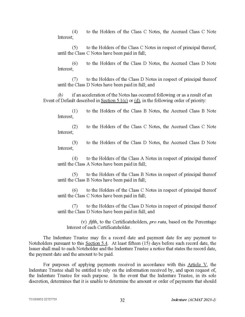 751008852 22727759 32 Indenture (ACMAT 2023 - 1) (4) Interest; to the Holders of the Class C Notes, the Accrued Class C Note (5) to the Holders of the Class C Notes in respect of principal thereof, until the Class C Notes have been paid in full; (6) to the Holders of the Class D Notes, the Accrued Class D Note Interest; (7) to the Holders of the Class D Notes in respect of principal thereof until the Class D Notes have been paid in full; and (b) if an acceleration of the Notes has occurred following or as a result of an Event of Default described in Section 5.1(c) or (d) , in the following order of priority: (1) to the Holders of the Class B Notes, the Accrued Class B Note Interest; (2) to the Holders of the Class C Notes, the Accrued Class C Note Interest; (3) to the Holders of the Class D Notes, the Accrued Class D Note Interest; (4) to the Holders of the Class A Notes in respect of principal thereof until the Class A Notes have been paid in full; (5) to the Holders of the Class B Notes in respect of principal thereof until the Class B Notes have been paid in full; (6) to the Holders of the Class C Notes in respect of principal thereof until the Class C Notes have been paid in full; (7) to the Holders of the Class D Notes in respect of principal thereof until the Class D Notes have been paid in full; and (v) fifth , to the Certificateholders, pro rata , based on the Percentage Interest of each Certificateholder. The Indenture Trustee may fix a record date and payment date for any payment to Noteholders pursuant to this Section 5 . 4 . At least fifteen ( 15 ) days before such record date, the Issuer shall mail to each Noteholder and the Indenture Trustee a notice that states the record date, the payment date and the amount to be paid . For purposes of applying payments received in accordance with this Article V , the Indenture Trustee shall be entitled to rely on the information received by, and upon request of, the Indenture Trustee for such purpose . In the event that the Indenture Trustee, in its sole discretion, determines that it is unable to determine the amount or order of payments that should