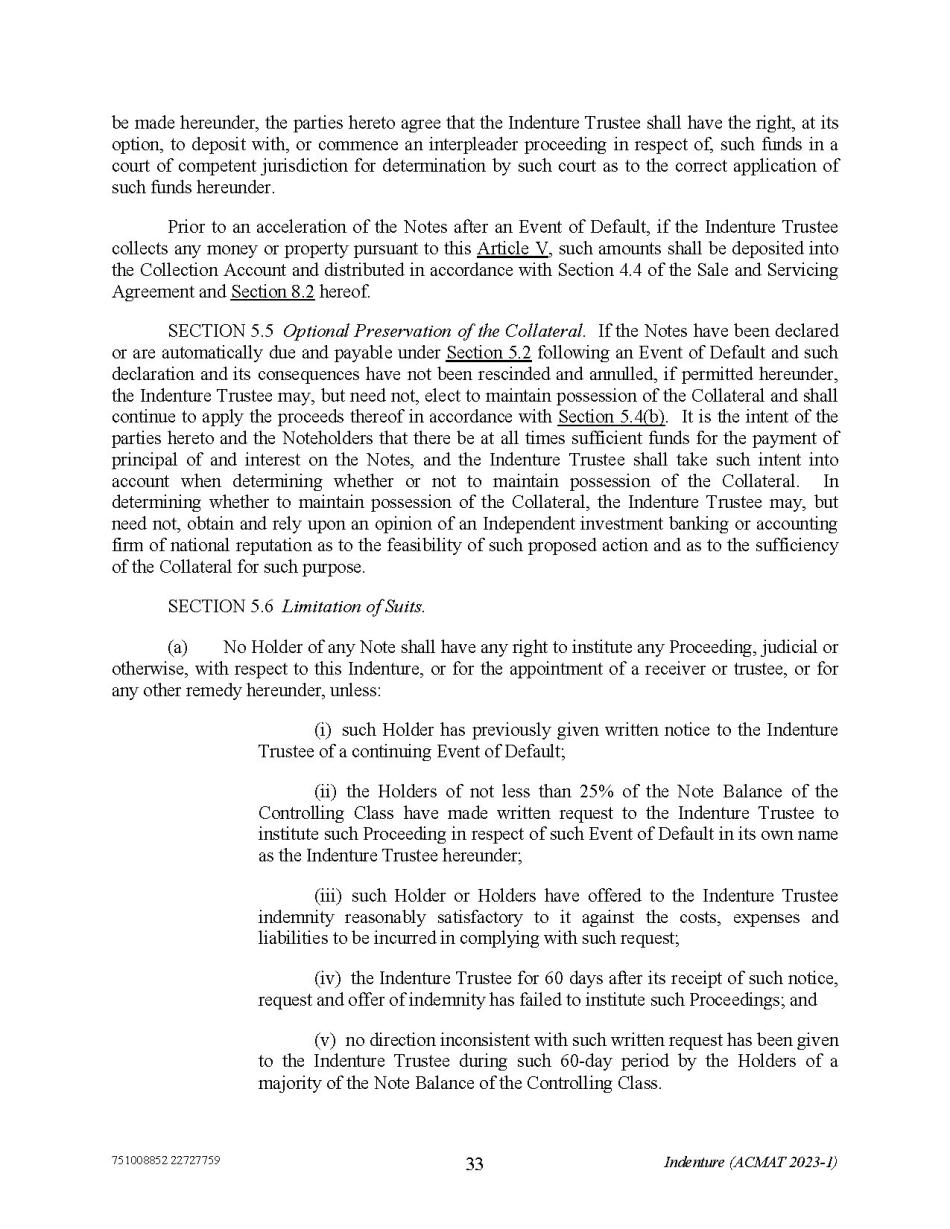 751008852 22727759 33 Indenture (ACMAT 2023 - 1) be made hereunder, the parties hereto agree that the Indenture Trustee shall have the right, at its option, to deposit with, or commence an interpleader proceeding in respect of, such funds in a court of competent jurisdiction for determination by such court as to the correct application of such funds hereunder . Prior to an acceleration of the Notes after an Event of Default, if the Indenture Trustee collects any money or property pursuant to this Article V , such amounts shall be deposited into the Collection Account and distributed in accordance with Section 4 . 4 of the Sale and Servicing Agreement and Section 8 . 2 hereof . SECTION 5 . 5 Optional Preservation of the Collateral . If the Notes have been declared or are automatically due and payable under Section 5 . 2 following an Event of Default and such declaration and its consequences have not been rescinded and annulled, if permitted hereunder, the Indenture Trustee may, but need not, elect to maintain possession of the Collateral and shall continue to apply the proceeds thereof in accordance with Section 5 . 4 (b) . It is the intent of the parties hereto and the Noteholders that there be at all times sufficient funds for the payment of principal of and interest on the Notes, and the Indenture Trustee shall take such intent into account when determining whether or not to maintain possession of the Collateral . In determining whether to maintain possession of the Collateral, the Indenture Trustee may, but need not, obtain and rely upon an opinion of an Independent investment banking or accounting firm of national reputation as to the feasibility of such proposed action and as to the sufficiency of the Collateral for such purpose . SECTION 5.6 Limitation of Suits . (a) No Holder of any Note shall have any right to institute any Proceeding, judicial or otherwise, with respect to this Indenture, or for the appointment of a receiver or trustee, or for any other remedy hereunder, unless : (i) such Holder has previously given written notice to the Indenture Trustee of a continuing Event of Default ; (ii) the Holders of not less than 25 % of the Note Balance of the Controlling Class have made written request to the Indenture Trustee to institute such Proceeding in respect of such Event of Default in its own name as the Indenture Trustee hereunder ; (iii) such Holder or Holders have offered to the Indenture Trustee indemnity reasonably satisfactory to it against the costs, expenses and liabilities to be incurred in complying with such request ; (iv) the Indenture Trustee for 60 days after its receipt of such notice, request and offer of indemnity has failed to institute such Proceedings ; and (v) no direction inconsistent with such written request has been given to the Indenture Trustee during such 60 - day period by the Holders of a majority of the Note Balance of the Controlling Class .