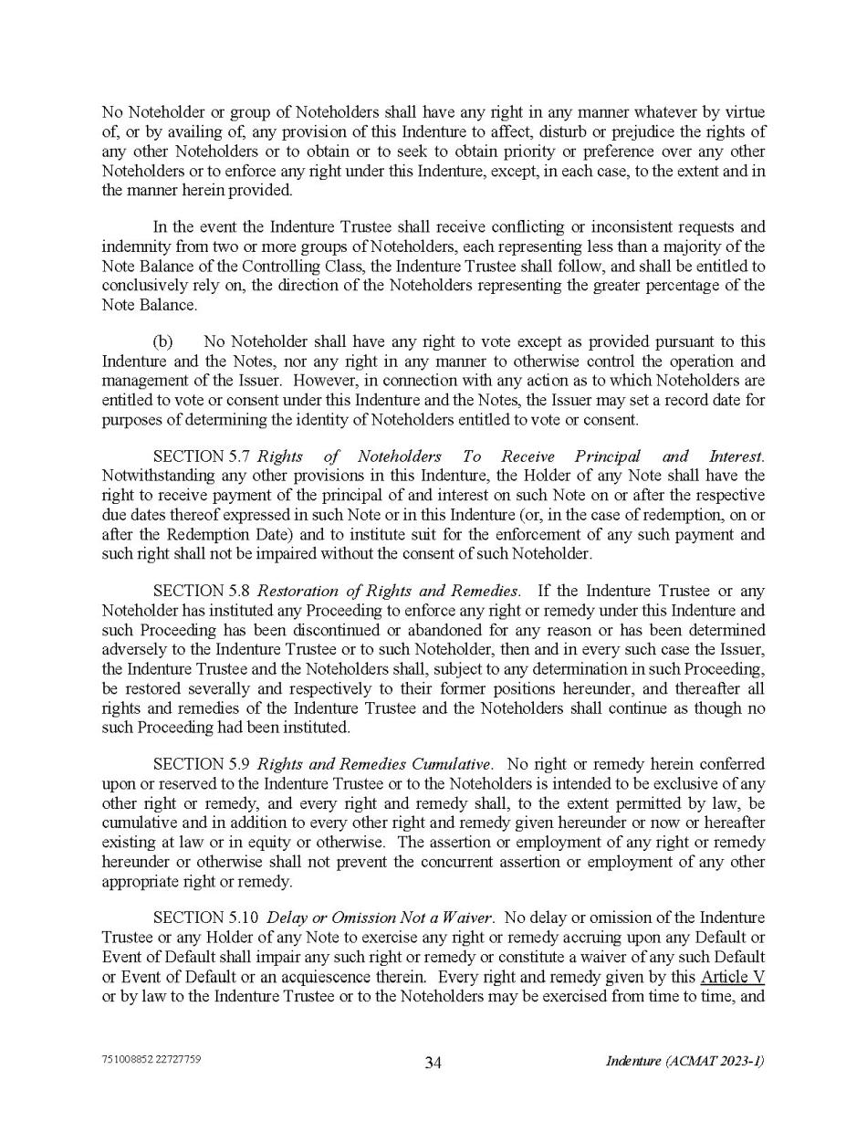 751008852 22727759 34 Indenture (ACMAT 2023 - 1) No Noteholder or group of Noteholders shall have any right in any manner whatever by virtue of, or by availing of, any provision of this Indenture to affect, disturb or prejudice the rights of any other Noteholders or to obtain or to seek to obtain priority or preference over any other Noteholders or to enforce any right under this Indenture, except, in each case, to the extent and in the manner herein provided . In the event the Indenture Trustee shall receive conflicting or inconsistent requests and indemnity from two or more groups of Noteholders, each representing less than a majority of the Note Balance of the Controlling Class, the Indenture Trustee shall follow, and shall be entitled to conclusively rely on, the direction of the Noteholders representing the greater percentage of the Note Balance . (b) No Noteholder shall have any right to vote except as provided pursuant to this Indenture and the Notes, nor any right in any manner to otherwise control the operation and management of the Issuer . However, in connection with any action as to which Noteholders are entitled to vote or consent under this Indenture and the Notes, the Issuer may set a record date for purposes of determining the identity of Noteholders entitled to vote or consent . SECTION 5 . 7 Rights of Noteholders To Receive Principal and Interest . Notwithstanding any other provisions in this Indenture, the Holder of any Note shall have the right to receive payment of the principal of and interest on such Note on or after the respective due dates thereof expressed in such Note or in this Indenture (or, in the case of redemption, on or after the Redemption Date) and to institute suit for the enforcement of any such payment and such right shall not be impaired without the consent of such Noteholder . SECTION 5 . 8 Restoration of Rights and Remedies . If the Indenture Trustee or any Noteholder has instituted any Proceeding to enforce any right or remedy under this Indenture and such Proceeding has been discontinued or abandoned for any reason or has been determined adversely to the Indenture Trustee or to such Noteholder, then and in every such case the Issuer, the Indenture Trustee and the Noteholders shall, subject to any determination in such Proceeding, be restored severally and respectively to their former positions hereunder, and thereafter all rights and remedies of the Indenture Trustee and the Noteholders shall continue as though no such Proceeding had been instituted . SECTION 5 . 9 Rights and Remedies Cumulative . No right or remedy herein conferred upon or reserved to the Indenture Trustee or to the Noteholders is intended to be exclusive of any other right or remedy, and every right and remedy shall, to the extent permitted by law, be cumulative and in addition to every other right and remedy given hereunder or now or hereafter existing at law or in equity or otherwise . The assertion or employment of any right or remedy hereunder or otherwise shall not prevent the concurrent assertion or employment of any other appropriate right or remedy . SECTION 5 . 10 Delay or Omission Not a Waiver . No delay or omission of the Indenture Trustee or any Holder of any Note to exercise any right or remedy accruing upon any Default or Event of Default shall impair any such right or remedy or constitute a waiver of any such Default or Event of Default or an acquiescence therein . Every right and remedy given by this Article V or by law to the Indenture Trustee or to the Noteholders may be exercised from time to time, and