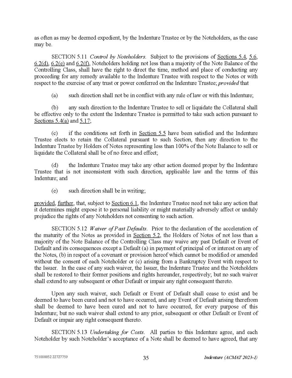 751008852 22727759 35 Indenture (ACMAT 2023 - 1) as often as may be deemed expedient, by the Indenture Trustee or by the Noteholders, as the case may be . SECTION 5 . 11 Control by Noteholders . Subject to the provisions of Sections 5 . 4 , 5 . 6 , 6 . 2 (d) , 6 . 2 (e) and 6 . 2 (f) , Noteholders holding not less than a majority of the Note Balance of the Controlling Class, shall have the right to direct the time, method and place of conducting any proceeding for any remedy available to the Indenture Trustee with respect to the Notes or with respect to the exercise of any trust or power conferred on the Indenture Trustee ; provided that (a) such direction shall not be in conflict with any rule of law or with this Indenture; (b) any such direction to the Indenture Trustee to sell or liquidate the Collateral shall be effective only to the extent the Indenture Trustee is permitted to take such action pursuant to Sections 5 . 4 (a) and 5 . 17 ; (c) if the conditions set forth in Section 5 . 5 have been satisfied and the Indenture Trustee elects to retain the Collateral pursuant to such Section, then any direction to the Indenture Trustee by Holders of Notes representing less than 100 % of the Note Balance to sell or liquidate the Collateral shall be of no force and effect ; (d) the Indenture Trustee may take any other action deemed proper by the Indenture Trustee that is not inconsistent with such direction, applicable law and the terms of this Indenture ; and (e) such direction shall be in writing; provided , further , that, subject to Section 6 . 1 , the Indenture Trustee need not take any action that it determines might expose it to personal liability or might materially adversely affect or unduly prejudice the rights of any Noteholders not consenting to such action . SECTION 5 . 12 Waiver of Past Defaults . Prior to the declaration of the acceleration of the maturity of the Notes as provided in Section 5 . 2 , the Holders of Notes of not less than a majority of the Note Balance of the Controlling Class may waive any past Default or Event of Default and its consequences except a Default (a) in payment of principal of or interest on any of the Notes, (b) in respect of a covenant or provision hereof which cannot be modified or amended without the consent of each Noteholder or (c) arising from a Bankruptcy Event with respect to the Issuer . In the case of any such waiver, the Issuer, the Indenture Trustee and the Noteholders shall be restored to their former positions and rights hereunder, respectively ; but no such waiver shall extend to any subsequent or other Default or impair any right consequent thereto . Upon any such waiver, such Default or Event of Default shall cease to exist and be deemed to have been cured and not to have occurred, and any Event of Default arising therefrom shall be deemed to have been cured and not to have occurred, for every purpose of this Indenture ; but no such waiver shall extend to any prior, subsequent or other Default or Event of Default or impair any right consequent thereto . SECTION 5 . 13 Undertaking for Costs . All parties to this Indenture agree, and each Noteholder by such Noteholder’s acceptance of a Note shall be deemed to have agreed, that any