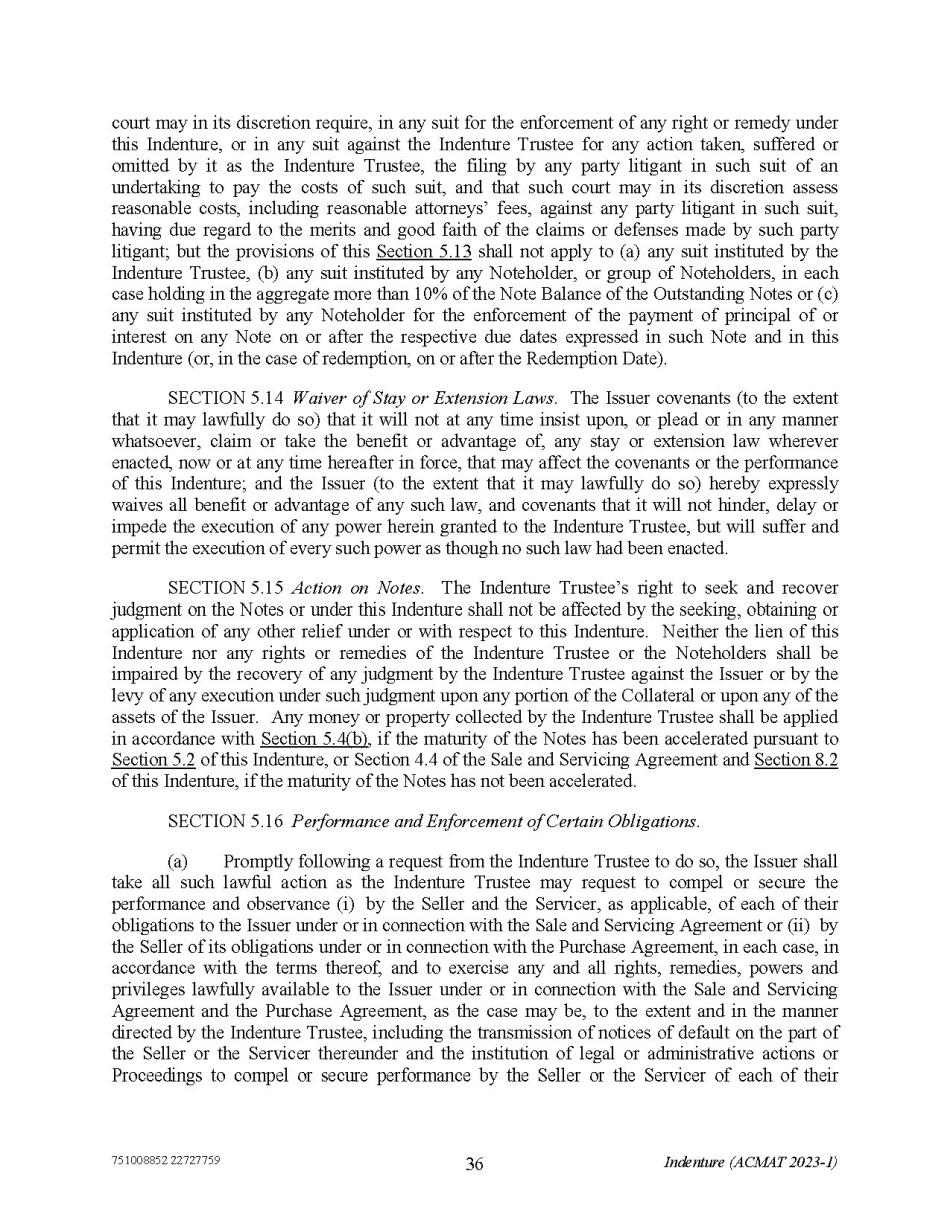 751008852 22727759 36 Indenture (ACMAT 2023 - 1) court may in its discretion require, in any suit for the enforcement of any right or remedy under this Indenture, or in any suit against the Indenture Trustee for any action taken, suffered or omitted by it as the Indenture Trustee, the filing by any party litigant in such suit of an undertaking to pay the costs of such suit, and that such court may in its discretion assess reasonable costs, including reasonable attorneys’ fees, against any party litigant in such suit, having due regard to the merits and good faith of the claims or defenses made by such party litigant ; but the provisions of this Section 5 . 13 shall not apply to (a) any suit instituted by the Indenture Trustee, (b) any suit instituted by any Noteholder, or group of Noteholders, in each case holding in the aggregate more than 10 % of the Note Balance of the Outstanding Notes or (c) any suit instituted by any Noteholder for the enforcement of the payment of principal of or interest on any Note on or after the respective due dates expressed in such Note and in this Indenture (or, in the case of redemption, on or after the Redemption Date) . SECTION 5 . 14 Waiver of Stay or Extension Laws . The Issuer covenants (to the extent that it may lawfully do so) that it will not at any time insist upon, or plead or in any manner whatsoever, claim or take the benefit or advantage of, any stay or extension law wherever enacted, now or at any time hereafter in force, that may affect the covenants or the performance of this Indenture ; and the Issuer (to the extent that it may lawfully do so) hereby expressly waives all benefit or advantage of any such law, and covenants that it will not hinder, delay or impede the execution of any power herein granted to the Indenture Trustee, but will suffer and permit the execution of every such power as though no such law had been enacted . SECTION 5 . 15 Action on Notes . The Indenture Trustee’s right to seek and recover judgment on the Notes or under this Indenture shall not be affected by the seeking, obtaining or application of any other relief under or with respect to this Indenture . Neither the lien of this Indenture nor any rights or remedies of the Indenture Trustee or the Noteholders shall be impaired by the recovery of any judgment by the Indenture Trustee against the Issuer or by the levy of any execution under such judgment upon any portion of the Collateral or upon any of the assets of the Issuer . Any money or property collected by the Indenture Trustee shall be applied in accordance with Section 5 . 4 (b) , if the maturity of the Notes has been accelerated pursuant to Section 5 . 2 of this Indenture, or Section 4 . 4 of the Sale and Servicing Agreement and Section 8 . 2 of this Indenture, if the maturity of the Notes has not been accelerated . SECTION 5.16 Performance and Enforcement of Certain Obligations . (a) Promptly following a request from the Indenture Trustee to do so, the Issuer shall take all such lawful action as the Indenture Trustee may request to compel or secure the performance and observance (i) by the Seller and the Servicer, as applicable, of each of their obligations to the Issuer under or in connection with the Sale and Servicing Agreement or (ii) by the Seller of its obligations under or in connection with the Purchase Agreement, in each case, in accordance with the terms thereof, and to exercise any and all rights, remedies, powers and privileges lawfully available to the Issuer under or in connection with the Sale and Servicing Agreement and the Purchase Agreement, as the case may be, to the extent and in the manner directed by the Indenture Trustee, including the transmission of notices of default on the part of the Seller or the Servicer thereunder and the institution of legal or administrative actions or Proceedings to compel or secure performance by the Seller or the Servicer of each of their