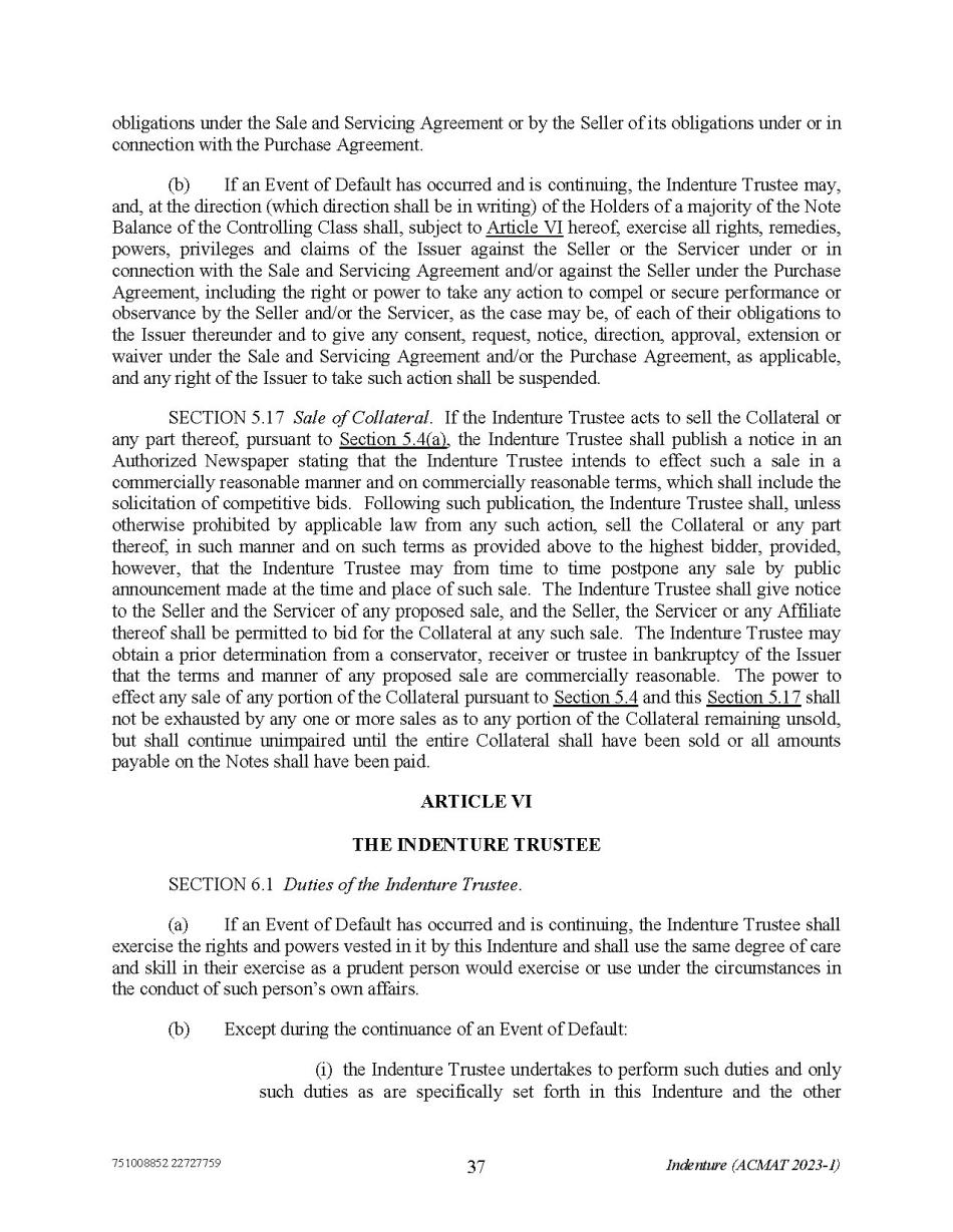 751008852 22727759 37 Indenture (ACMAT 2023 - 1) obligations under the Sale and Servicing Agreement or by the Seller of its obligations under or in connection with the Purchase Agreement. (b) If an Event of Default has occurred and is continuing, the Indenture Trustee may, and, at the direction (which direction shall be in writing) of the Holders of a majority of the Note Balance of the Controlling Class shall, subject to Article VI hereof, exercise all rights, remedies, powers, privileges and claims of the Issuer against the Seller or the Servicer under or in connection with the Sale and Servicing Agreement and/or against the Seller under the Purchase Agreement, including the right or power to take any action to compel or secure performance or observance by the Seller and/or the Servicer, as the case may be, of each of their obligations to the Issuer thereunder and to give any consent, request, notice, direction, approval, extension or waiver under the Sale and Servicing Agreement and/or the Purchase Agreement, as applicable, and any right of the Issuer to take such action shall be suspended . SECTION 5 . 17 Sale of Collateral . If the Indenture Trustee acts to sell the Collateral or any part thereof, pursuant to Section 5 . 4 (a) , the Indenture Trustee shall publish a notice in an Authorized Newspaper stating that the Indenture Trustee intends to effect such a sale in a commercially reasonable manner and on commercially reasonable terms, which shall include the solicitation of competitive bids . Following such publication, the Indenture Trustee shall, unless otherwise prohibited by applicable law from any such action, sell the Collateral or any part thereof, in such manner and on such terms as provided above to the highest bidder, provided, however, that the Indenture Trustee may from time to time postpone any sale by public announcement made at the time and place of such sale . The Indenture Trustee shall give notice to the Seller and the Servicer of any proposed sale, and the Seller, the Servicer or any Affiliate thereof shall be permitted to bid for the Collateral at any such sale . The Indenture Trustee may obtain a prior determination from a conservator, receiver or trustee in bankruptcy of the Issuer that the terms and manner of any proposed sale are commercially reasonable . The power to effect any sale of any portion of the Collateral pursuant to Section 5 . 4 and this Section 5 . 17 shall not be exhausted by any one or more sales as to any portion of the Collateral remaining unsold, but shall continue unimpaired until the entire Collateral shall have been sold or all amounts payable on the Notes shall have been paid . ARTICLE VI THE INDENTURE TRUSTEE SECTION 6.1 Duties of the Indenture Trustee . (a) If an Event of Default has occurred and is continuing, the Indenture Trustee shall exercise the rights and powers vested in it by this Indenture and shall use the same degree of care and skill in their exercise as a prudent person would exercise or use under the circumstances in the conduct of such person’s own affairs . (b) Except during the continuance of an Event of Default: (i) the Indenture Trustee undertakes to perform such duties and only such duties as are specifically set forth in this Indenture and the other