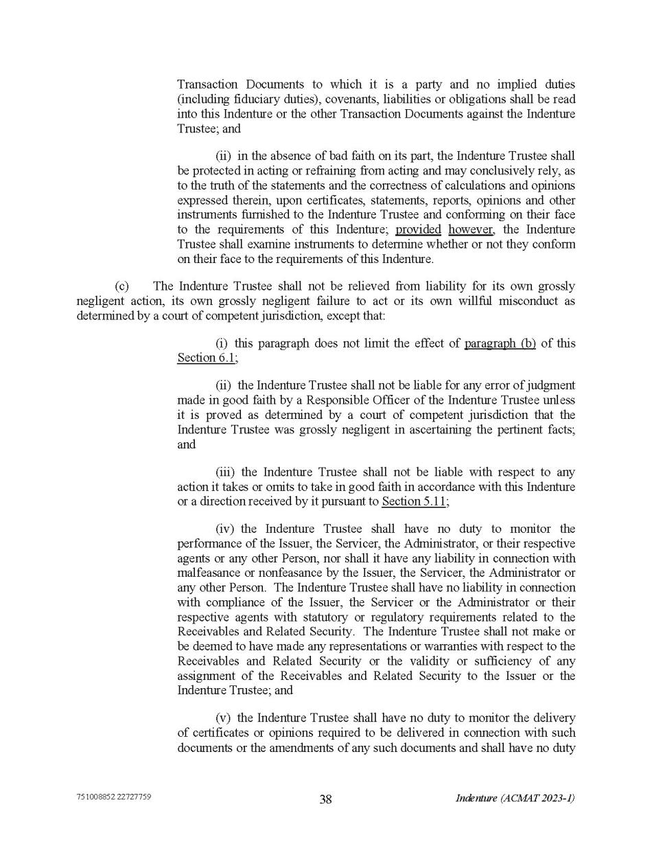 751008852 22727759 38 Indenture (ACMAT 2023 - 1) Transaction Documents to which it is a party and no implied duties (including fiduciary duties), covenants, liabilities or obligations shall be read into this Indenture or the other Transaction Documents against the Indenture Trustee ; and (ii) in the absence of bad faith on its part, the Indenture Trustee shall be protected in acting or refraining from acting and may conclusively rely, as to the truth of the statements and the correctness of calculations and opinions expressed therein, upon certificates, statements, reports, opinions and other instruments furnished to the Indenture Trustee and conforming on their face to the requirements of this Indenture ; provided however , the Indenture Trustee shall examine instruments to determine whether or not they conform on their face to the requirements of this Indenture . (c) The Indenture Trustee shall not be relieved from liability for its own grossly negligent action, its own grossly negligent failure to act or its own willful misconduct as determined by a court of competent jurisdiction, except that : (i) this paragraph does not limit the effect of paragraph (b) of this Section 6 . 1 ; (ii) the Indenture Trustee shall not be liable for any error of judgment made in good faith by a Responsible Officer of the Indenture Trustee unless it is proved as determined by a court of competent jurisdiction that the Indenture Trustee was grossly negligent in ascertaining the pertinent facts ; and (iii) the Indenture Trustee shall not be liable with respect to any action it takes or omits to take in good faith in accordance with this Indenture or a direction received by it pursuant to Section 5 . 11 ; (iv) the Indenture Trustee shall have no duty to monitor the performance of the Issuer, the Servicer, the Administrator, or their respective agents or any other Person, nor shall it have any liability in connection with malfeasance or nonfeasance by the Issuer, the Servicer, the Administrator or any other Person . The Indenture Trustee shall have no liability in connection with compliance of the Issuer, the Servicer or the Administrator or their respective agents with statutory or regulatory requirements related to the Receivables and Related Security . The Indenture Trustee shall not make or be deemed to have made any representations or warranties with respect to the Receivables and Related Security or the validity or sufficiency of any assignment of the Receivables and Related Security to the Issuer or the Indenture Trustee ; and (v) the Indenture Trustee shall have no duty to monitor the delivery of certificates or opinions required to be delivered in connection with such documents or the amendments of any such documents and shall have no duty