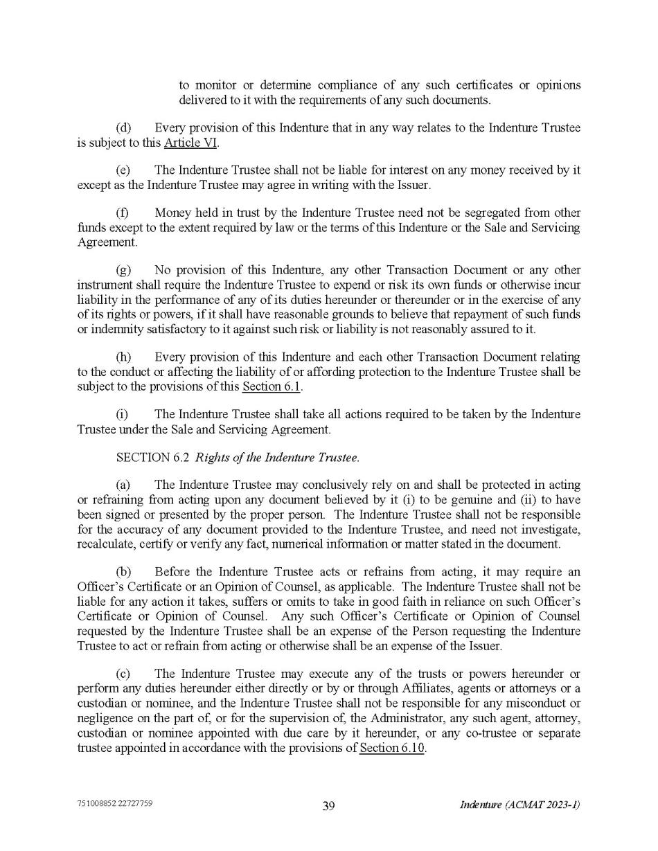 751008852 22727759 39 Indenture (ACMAT 2023 - 1) to monitor or determine compliance of any such certificates or opinions delivered to it with the requirements of any such documents. (d) Every provision of this Indenture that in any way relates to the Indenture Trustee is subject to this Article VI . (e) The Indenture Trustee shall not be liable for interest on any money received by it except as the Indenture Trustee may agree in writing with the Issuer . (f) Money held in trust by the Indenture Trustee need not be segregated from other funds except to the extent required by law or the terms of this Indenture or the Sale and Servicing Agreement . (g) No provision of this Indenture, any other Transaction Document or any other instrument shall require the Indenture Trustee to expend or risk its own funds or otherwise incur liability in the performance of any of its duties hereunder or thereunder or in the exercise of any of its rights or powers, if it shall have reasonable grounds to believe that repayment of such funds or indemnity satisfactory to it against such risk or liability is not reasonably assured to it . (h) Every provision of this Indenture and each other Transaction Document relating to the conduct or affecting the liability of or affording protection to the Indenture Trustee shall be subject to the provisions of this Section 6 . 1 . (i) The Indenture Trustee shall take all actions required to be taken by the Indenture Trustee under the Sale and Servicing Agreement . SECTION 6.2 Rights of the Indenture Trustee . (a) The Indenture Trustee may conclusively rely on and shall be protected in acting or refraining from acting upon any document believed by it (i) to be genuine and (ii) to have been signed or presented by the proper person . The Indenture Trustee shall not be responsible for the accuracy of any document provided to the Indenture Trustee, and need not investigate, recalculate, certify or verify any fact, numerical information or matter stated in the document . (b) Before the Indenture Trustee acts or refrains from acting, it may require an Officer’s Certificate or an Opinion of Counsel, as applicable . The Indenture Trustee shall not be liable for any action it takes, suffers or omits to take in good faith in reliance on such Officer’s Certificate or Opinion of Counsel . Any such Officer’s Certificate or Opinion of Counsel requested by the Indenture Trustee shall be an expense of the Person requesting the Indenture Trustee to act or refrain from acting or otherwise shall be an expense of the Issuer . (c) The Indenture Trustee may execute any of the trusts or powers hereunder or perform any duties hereunder either directly or by or through Affiliates, agents or attorneys or a custodian or nominee, and the Indenture Trustee shall not be responsible for any misconduct or negligence on the part of, or for the supervision of, the Administrator, any such agent, attorney, custodian or nominee appointed with due care by it hereunder, or any co - trustee or separate trustee appointed in accordance with the provisions of Section 6 . 10 .