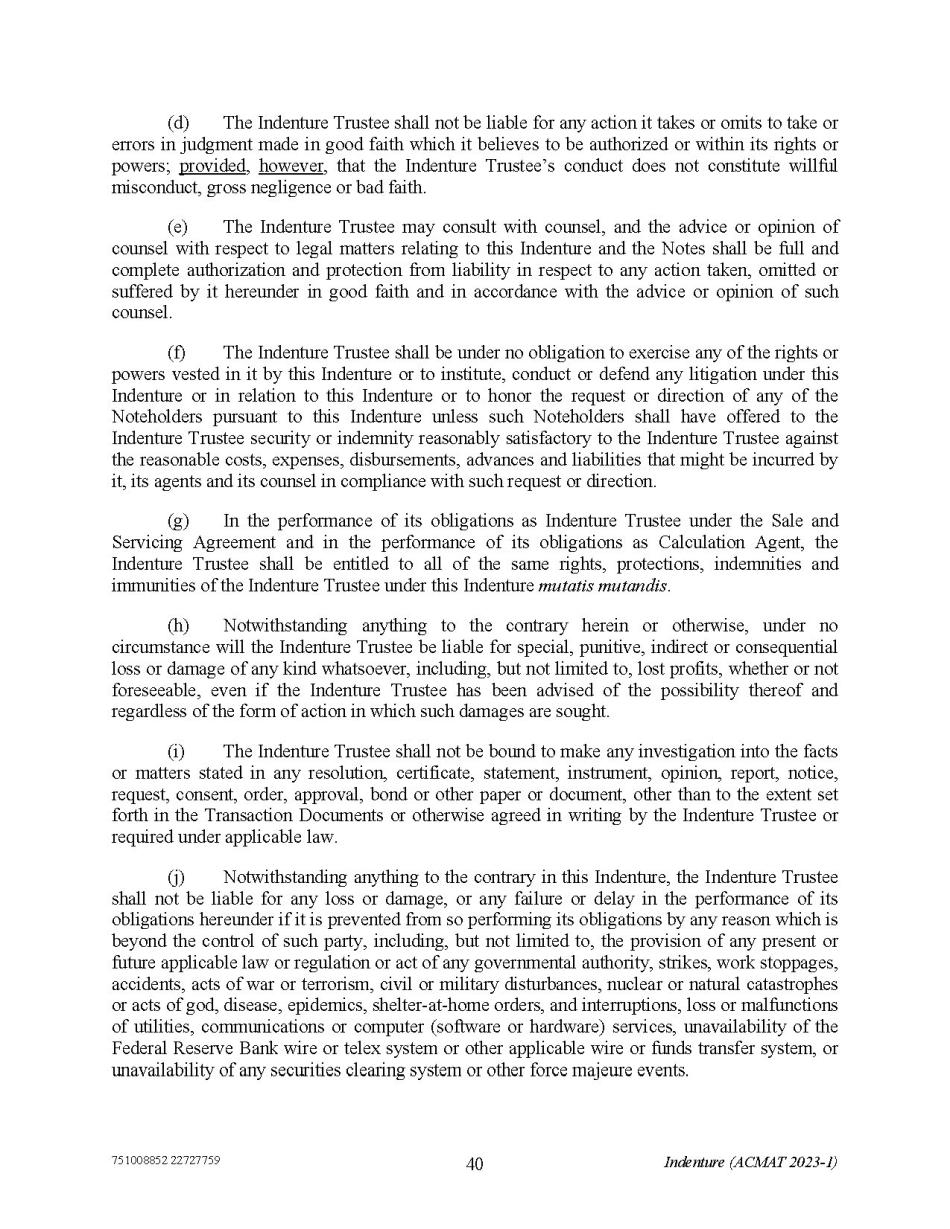 751008852 22727759 40 Indenture (ACMAT 2023 - 1) (d) The Indenture Trustee shall not be liable for any action it takes or omits to take or errors in judgment made in good faith which it believes to be authorized or within its rights or powers ; provided , however , that the Indenture Trustee’s conduct does not constitute willful misconduct, gross negligence or bad faith . (e) The Indenture Trustee may consult with counsel, and the advice or opinion of counsel with respect to legal matters relating to this Indenture and the Notes shall be full and complete authorization and protection from liability in respect to any action taken, omitted or suffered by it hereunder in good faith and in accordance with the advice or opinion of such counsel . (f) The Indenture Trustee shall be under no obligation to exercise any of the rights or powers vested in it by this Indenture or to institute, conduct or defend any litigation under this Indenture or in relation to this Indenture or to honor the request or direction of any of the Noteholders pursuant to this Indenture unless such Noteholders shall have offered to the Indenture Trustee security or indemnity reasonably satisfactory to the Indenture Trustee against the reasonable costs, expenses, disbursements, advances and liabilities that might be incurred by it, its agents and its counsel in compliance with such request or direction . (g) In the performance of its obligations as Indenture Trustee under the Sale and Servicing Agreement and in the performance of its obligations as Calculation Agent, the Indenture Trustee shall be entitled to all of the same rights, protections, indemnities and immunities of the Indenture Trustee under this Indenture mutatis mutandis . (h) Notwithstanding anything to the contrary herein or otherwise, under no circumstance will the Indenture Trustee be liable for special, punitive, indirect or consequential loss or damage of any kind whatsoever, including, but not limited to, lost profits, whether or not foreseeable, even if the Indenture Trustee has been advised of the possibility thereof and regardless of the form of action in which such damages are sought . (i) The Indenture Trustee shall not be bound to make any investigation into the facts or matters stated in any resolution, certificate, statement, instrument, opinion, report, notice, request, consent, order, approval, bond or other paper or document, other than to the extent set forth in the Transaction Documents or otherwise agreed in writing by the Indenture Trustee or required under applicable law . (j) Notwithstanding anything to the contrary in this Indenture, the Indenture Trustee shall not be liable for any loss or damage, or any failure or delay in the performance of its obligations hereunder if it is prevented from so performing its obligations by any reason which is beyond the control of such party, including, but not limited to, the provision of any present or future applicable law or regulation or act of any governmental authority, strikes, work stoppages, accidents, acts of war or terrorism, civil or military disturbances, nuclear or natural catastrophes or acts of god, disease, epidemics, shelter - at - home orders, and interruptions, loss or malfunctions of utilities, communications or computer (software or hardware) services, unavailability of the Federal Reserve Bank wire or telex system or other applicable wire or funds transfer system, or unavailability of any securities clearing system or other force majeure events .