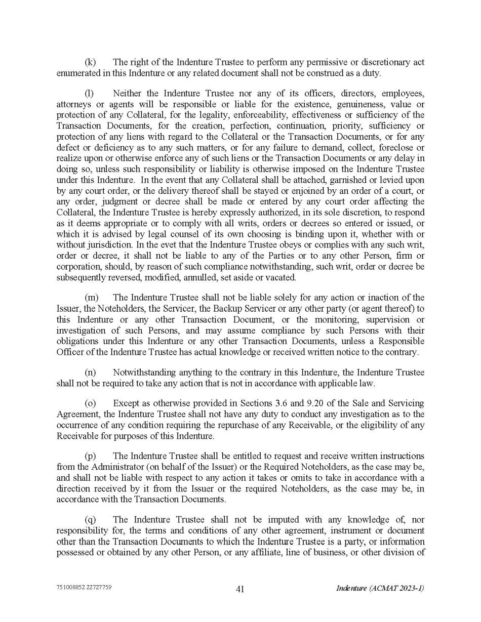 751008852 22727759 41 Indenture (ACMAT 2023 - 1) (k) The right of the Indenture Trustee to perform any permissive or discretionary act enumerated in this Indenture or any related document shall not be construed as a duty . (l) Neither the Indenture Trustee nor any of its officers, directors, employees, attorneys or agents will be responsible or liable for the existence, genuineness, value or protection of any Collateral, for the legality, enforceability, effectiveness or sufficiency of the Transaction Documents, for the creation, perfection, continuation, priority, sufficiency or protection of any liens with regard to the Collateral or the Transaction Documents, or for any defect or deficiency as to any such matters, or for any failure to demand, collect, foreclose or realize upon or otherwise enforce any of such liens or the Transaction Documents or any delay in doing so, unless such responsibility or liability is otherwise imposed on the Indenture Trustee under this Indenture . In the event that any Collateral shall be attached, garnished or levied upon by any court order, or the delivery thereof shall be stayed or enjoined by an order of a court, or any order, judgment or decree shall be made or entered by any court order affecting the Collateral, the Indenture Trustee is hereby expressly authorized, in its sole discretion, to respond as it deems appropriate or to comply with all writs, orders or decrees so entered or issued, or which it is advised by legal counsel of its own choosing is binding upon it, whether with or without jurisdiction . In the evet that the Indenture Trustee obeys or complies with any such writ, order or decree, it shall not be liable to any of the Parties or to any other Person, firm or corporation, should, by reason of such compliance notwithstanding, such writ, order or decree be subsequently reversed, modified, annulled, set aside or vacated . (m) The Indenture Trustee shall not be liable solely for any action or inaction of the Issuer, the Noteholders, the Servicer, the Backup Servicer or any other party (or agent thereof) to this Indenture or any other Transaction Document, or the monitoring, supervision or investigation of such Persons, and may assume compliance by such Persons with their obligations under this Indenture or any other Transaction Documents, unless a Responsible Officer of the Indenture Trustee has actual knowledge or received written notice to the contrary . (n) Notwithstanding anything to the contrary in this Indenture, the Indenture Trustee shall not be required to take any action that is not in accordance with applicable law . (o) Except as otherwise provided in Sections 3 . 6 and 9 . 20 of the Sale and Servicing Agreement, the Indenture Trustee shall not have any duty to conduct any investigation as to the occurrence of any condition requiring the repurchase of any Receivable, or the eligibility of any Receivable for purposes of this Indenture . (p) The Indenture Trustee shall be entitled to request and receive written instructions from the Administrator (on behalf of the Issuer) or the Required Noteholders, as the case may be, and shall not be liable with respect to any action it takes or omits to take in accordance with a direction received by it from the Issuer or the required Noteholders, as the case may be, in accordance with the Transaction Documents . (q) The Indenture Trustee shall not be imputed with any knowledge of, nor responsibility for, the terms and conditions of any other agreement, instrument or document other than the Transaction Documents to which the Indenture Trustee is a party, or information possessed or obtained by any other Person, or any affiliate, line of business, or other division of