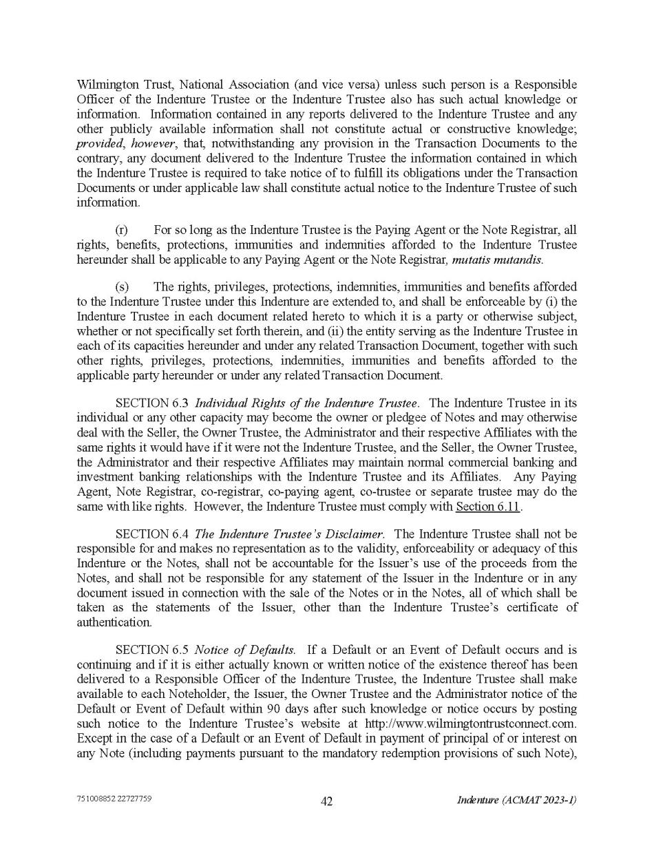 751008852 22727759 42 Indenture (ACMAT 2023 - 1) Wilmington Trust, National Association (and vice versa) unless such person is a Responsible Officer of the Indenture Trustee or the Indenture Trustee also has such actual knowledge or information . Information contained in any reports delivered to the Indenture Trustee and any other publicly available information shall not constitute actual or constructive knowledge ; provided , however , that, notwithstanding any provision in the Transaction Documents to the contrary, any document delivered to the Indenture Trustee the information contained in which the Indenture Trustee is required to take notice of to fulfill its obligations under the Transaction Documents or under applicable law shall constitute actual notice to the Indenture Trustee of such information . (r) For so long as the Indenture Trustee is the Paying Agent or the Note Registrar, all rights, benefits, protections, immunities and indemnities afforded to the Indenture Trustee hereunder shall be applicable to any Paying Agent or the Note Registrar , mutatis mutandis . (s) The rights, privileges, protections, indemnities, immunities and benefits afforded to the Indenture Trustee under this Indenture are extended to, and shall be enforceable by (i) the Indenture Trustee in each document related hereto to which it is a party or otherwise subject, whether or not specifically set forth therein, and (ii) the entity serving as the Indenture Trustee in each of its capacities hereunder and under any related Transaction Document, together with such other rights, privileges, protections, indemnities, immunities and benefits afforded to the applicable party hereunder or under any related Transaction Document . SECTION 6 . 3 Individual Rights of the Indenture Trustee . The Indenture Trustee in its individual or any other capacity may become the owner or pledgee of Notes and may otherwise deal with the Seller, the Owner Trustee, the Administrator and their respective Affiliates with the same rights it would have if it were not the Indenture Trustee, and the Seller, the Owner Trustee, the Administrator and their respective Affiliates may maintain normal commercial banking and investment banking relationships with the Indenture Trustee and its Affiliates . Any Paying Agent, Note Registrar, co - registrar, co - paying agent, co - trustee or separate trustee may do the same with like rights . However, the Indenture Trustee must comply with Section 6 . 11 . SECTION 6 . 4 The Indenture Trustee’s Disclaimer . The Indenture Trustee shall not be responsible for and makes no representation as to the validity, enforceability or adequacy of this Indenture or the Notes, shall not be accountable for the Issuer’s use of the proceeds from the Notes, and shall not be responsible for any statement of the Issuer in the Indenture or in any document issued in connection with the sale of the Notes or in the Notes, all of which shall be taken as the statements of the Issuer, other than the Indenture Trustee’s certificate of authentication . SECTION 6 . 5 Notice of Defaults . If a Default or an Event of Default occurs and is continuing and if it is either actually known or written notice of the existence thereof has been delivered to a Responsible Officer of the Indenture Trustee, the Indenture Trustee shall make available to each Noteholder, the Issuer, the Owner Trustee and the Administrator notice of the Default or Event of Default within 90 days after such knowledge or notice occurs by posting such notice to the Indenture Trustee’s website at http : //www . wilmingtontrustconnect . com . Except in the case of a Default or an Event of Default in payment of principal of or interest on any Note (including payments pursuant to the mandatory redemption provisions of such Note),