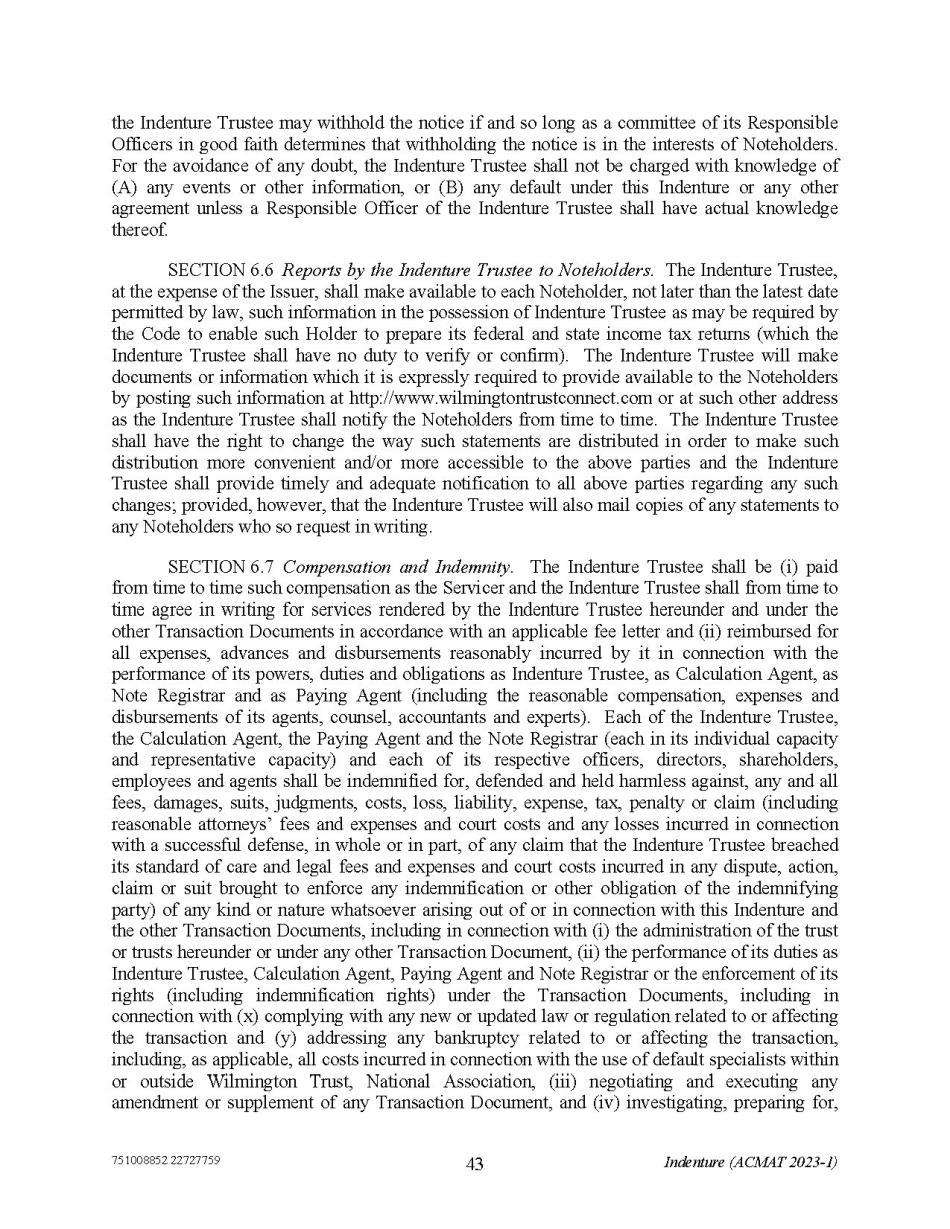751008852 22727759 43 Indenture (ACMAT 2023 - 1) the Indenture Trustee may withhold the notice if and so long as a committee of its Responsible Officers in good faith determines that withholding the notice is in the interests of Noteholders . For the avoidance of any doubt, the Indenture Trustee shall not be charged with knowledge of (A) any events or other information, or (B) any default under this Indenture or any other agreement unless a Responsible Officer of the Indenture Trustee shall have actual knowledge thereof . SECTION 6 . 6 Reports by the Indenture Trustee to Noteholders . The Indenture Trustee, at the expense of the Issuer, shall make available to each Noteholder, not later than the latest date permitted by law, such information in the possession of Indenture Trustee as may be required by the Code to enable such Holder to prepare its federal and state income tax returns (which the Indenture Trustee shall have no duty to verify or confirm) . The Indenture Trustee will make documents or information which it is expressly required to provide available to the Noteholders by posting such information at http : //www . wilmingtontrustconnect . com or at such other address as the Indenture Trustee shall notify the Noteholders from time to time . The Indenture Trustee shall have the right to change the way such statements are distributed in order to make such distribution more convenient and/or more accessible to the above parties and the Indenture Trustee shall provide timely and adequate notification to all above parties regarding any such changes ; provided, however, that the Indenture Trustee will also mail copies of any statements to any Noteholders who so request in writing . SECTION 6 . 7 Compensation and Indemnity . The Indenture Trustee shall be (i) paid from time to time such compensation as the Servicer and the Indenture Trustee shall from time to time agree in writing for services rendered by the Indenture Trustee hereunder and under the other Transaction Documents in accordance with an applicable fee letter and (ii) reimbursed for all expenses, advances and disbursements reasonably incurred by it in connection with the performance of its powers, duties and obligations as Indenture Trustee, as Calculation Agent, as Note Registrar and as Paying Agent (including the reasonable compensation, expenses and disbursements of its agents, counsel, accountants and experts) . Each of the Indenture Trustee, the Calculation Agent, the Paying Agent and the Note Registrar (each in its individual capacity and representative capacity) and each of its respective officers, directors, shareholders, employees and agents shall be indemnified for, defended and held harmless against, any and all fees, damages, suits, judgments, costs, loss, liability, expense, tax, penalty or claim (including reasonable attorneys’ fees and expenses and court costs and any losses incurred in connection with a successful defense, in whole or in part, of any claim that the Indenture Trustee breached its standard of care and legal fees and expenses and court costs incurred in any dispute, action, claim or suit brought to enforce any indemnification or other obligation of the indemnifying party) of any kind or nature whatsoever arising out of or in connection with this Indenture and the other Transaction Documents, including in connection with (i) the administration of the trust or trusts hereunder or under any other Transaction Document, (ii) the performance of its duties as Indenture Trustee, Calculation Agent, Paying Agent and Note Registrar or the enforcement of its rights (including indemnification rights) under the Transaction Documents, including in connection with (x) complying with any new or updated law or regulation related to or affecting the transaction and (y) addressing any bankruptcy related to or affecting the transaction, including, as applicable, all costs incurred in connection with the use of default specialists within or outside Wilmington Trust, National Association, (iii) negotiating and executing any amendment or supplement of any Transaction Document, and (iv) investigating, preparing for,