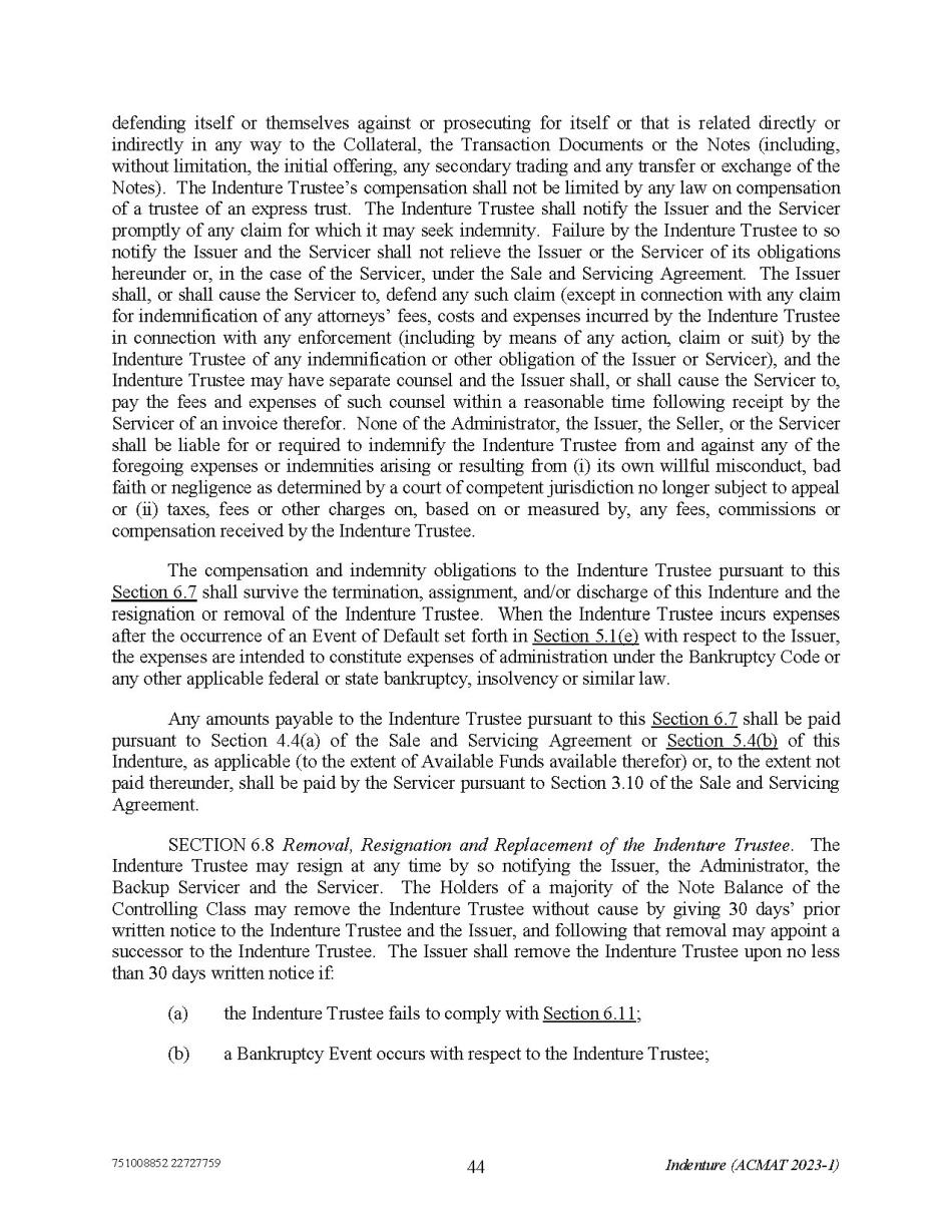 751008852 22727759 44 Indenture (ACMAT 2023 - 1) defending itself or themselves against or prosecuting for itself or that is related directly or indirectly in any way to the Collateral, the Transaction Documents or the Notes (including, without limitation, the initial offering, any secondary trading and any transfer or exchange of the Notes) . The Indenture Trustee’s compensation shall not be limited by any law on compensation of a trustee of an express trust . The Indenture Trustee shall notify the Issuer and the Servicer promptly of any claim for which it may seek indemnity . Failure by the Indenture Trustee to so notify the Issuer and the Servicer shall not relieve the Issuer or the Servicer of its obligations hereunder or, in the case of the Servicer, under the Sale and Servicing Agreement . The Issuer shall, or shall cause the Servicer to, defend any such claim (except in connection with any claim for indemnification of any attorneys’ fees, costs and expenses incurred by the Indenture Trustee in connection with any enforcement (including by means of any action, claim or suit) by the Indenture Trustee of any indemnification or other obligation of the Issuer or Servicer), and the Indenture Trustee may have separate counsel and the Issuer shall, or shall cause the Servicer to, pay the fees and expenses of such counsel within a reasonable time following receipt by the Servicer of an invoice therefor . None of the Administrator, the Issuer, the Seller, or the Servicer shall be liable for or required to indemnify the Indenture Trustee from and against any of the foregoing expenses or indemnities arising or resulting from (i) its own willful misconduct, bad faith or negligence as determined by a court of competent jurisdiction no longer subject to appeal or (ii) taxes, fees or other charges on, based on or measured by, any fees, commissions or compensation received by the Indenture Trustee . The compensation and indemnity obligations to the Indenture Trustee pursuant to this Section 6 . 7 shall survive the termination, assignment, and/or discharge of this Indenture and the resignation or removal of the Indenture Trustee . When the Indenture Trustee incurs expenses after the occurrence of an Event of Default set forth in Section 5 . 1 (e) with respect to the Issuer, the expenses are intended to constitute expenses of administration under the Bankruptcy Code or any other applicable federal or state bankruptcy, insolvency or similar law . Any amounts payable to the Indenture Trustee pursuant to this Section 6 . 7 shall be paid pursuant to Section 4 . 4 (a) of the Sale and Servicing Agreement or Section 5 . 4 (b) of this Indenture, as applicable (to the extent of Available Funds available therefor) or, to the extent not paid thereunder, shall be paid by the Servicer pursuant to Section 3 . 10 of the Sale and Servicing Agreement . SECTION 6 . 8 Removal, Resignation and Replacement of the Indenture Trustee . The Indenture Trustee may resign at any time by so notifying the Issuer, the Administrator, the Backup Servicer and the Servicer . The Holders of a majority of the Note Balance of the Controlling Class may remove the Indenture Trustee without cause by giving 30 days’ prior written notice to the Indenture Trustee and the Issuer, and following that removal may appoint a successor to the Indenture Trustee . The Issuer shall remove the Indenture Trustee upon no less than 30 days written notice if : (a) the Indenture Trustee fails to comply with Section 6.11 ; (b) a Bankruptcy Event occurs with respect to the Indenture Trustee;