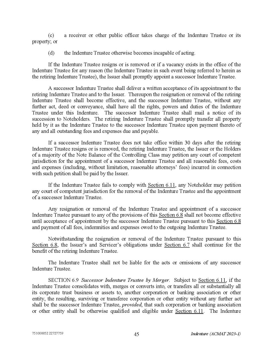 751008852 22727759 45 Indenture (ACMAT 2023 - 1) (c) property; or a receiver or other public officer takes charge of the Indenture Trustee or its (d) the Indenture Trustee otherwise becomes incapable of acting. If the Indenture Trustee resigns or is removed or if a vacancy exists in the office of the Indenture Trustee for any reason (the Indenture Trustee in such event being referred to herein as the retiring Indenture Trustee), the Issuer shall promptly appoint a successor Indenture Trustee . A successor Indenture Trustee shall deliver a written acceptance of its appointment to the retiring Indenture Trustee and to the Issuer . Thereupon the resignation or removal of the retiring Indenture Trustee shall become effective, and the successor Indenture Trustee, without any further act, deed or conveyance, shall have all the rights, powers and duties of the Indenture Trustee under this Indenture . The successor Indenture Trustee shall mail a notice of its succession to Noteholders . The retiring Indenture Trustee shall promptly transfer all property held by it as the Indenture Trustee to the successor Indenture Trustee upon payment thereto of any and all outstanding fees and expenses due and payable . If a successor Indenture Trustee does not take office within 30 days after the retiring Indenture Trustee resigns or is removed, the retiring Indenture Trustee, the Issuer or the Holders of a majority of the Note Balance of the Controlling Class may petition any court of competent jurisdiction for the appointment of a successor Indenture Trustee and all reasonable fees, costs and expenses (including, without limitation, reasonable attorneys’ fees) incurred in connection with such petition shall be paid by the Issuer . If the Indenture Trustee fails to comply with Section 6 . 11 , any Noteholder may petition any court of competent jurisdiction for the removal of the Indenture Trustee and the appointment of a successor Indenture Trustee . Any resignation or removal of the Indenture Trustee and appointment of a successor Indenture Trustee pursuant to any of the provisions of this Section 6 . 8 shall not become effective until acceptance of appointment by the successor Indenture Trustee pursuant to this Section 6 . 8 and payment of all fees, indemnities and expenses owed to the outgoing Indenture Trustee . Notwithstanding the resignation or removal of the Indenture Trustee pursuant to this Section 6 . 8 , the Issuer’s and Servicer’s obligations under Section 6 . 7 shall continue for the benefit of the retiring Indenture Trustee . The Indenture Trustee shall not be liable for the acts or omissions of any successor Indenture Trustee . SECTION 6 . 9 Successor Indenture Trustee by Merger . Subject to Section 6 . 11 , if the Indenture Trustee consolidates with, merges or converts into, or transfers all or substantially all its corporate trust business or assets to, another corporation or banking association or other entity, the resulting, surviving or transferee corporation or other entity without any further act shall be the successor Indenture Trustee, provided , that such corporation or banking association or other entity shall be otherwise qualified and eligible under Section 6 . 11 . The Indenture