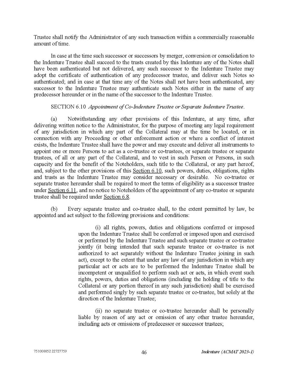 751008852 22727759 46 Indenture (ACMAT 2023 - 1) Trustee shall notify the Administrator of any such transaction within a commercially reasonable amount of time. In case at the time such successor or successors by merger, conversion or consolidation to the Indenture Trustee shall succeed to the trusts created by this Indenture any of the Notes shall have been authenticated but not delivered, any such successor to the Indenture Trustee may adopt the certificate of authentication of any predecessor trustee, and deliver such Notes so authenticated ; and in case at that time any of the Notes shall not have been authenticated, any successor to the Indenture Trustee may authenticate such Notes either in the name of any predecessor hereunder or in the name of the successor to the Indenture Trustee . SECTION 6.10 Appointment of Co - Indenture Trustee or Separate Indenture Trustee . (a) Notwithstanding any other provisions of this Indenture, at any time, after delivering written notice to the Administrator, for the purpose of meeting any legal requirement of any jurisdiction in which any part of the Collateral may at the time be located, or in connection with any Proceeding or other enforcement action or where a conflict of interest exists, the Indenture Trustee shall have the power and may execute and deliver all instruments to appoint one or more Persons to act as a co - trustee or co - trustees, or separate trustee or separate trustees, of all or any part of the Collateral, and to vest in such Person or Persons, in such capacity and for the benefit of the Noteholders, such title to the Collateral, or any part hereof, and, subject to the other provisions of this Section 6 . 10 , such powers, duties, obligations, rights and trusts as the Indenture Trustee may consider necessary or desirable . No co - trustee or separate trustee hereunder shall be required to meet the terms of eligibility as a successor trustee under Section 6 . 11 , and no notice to Noteholders of the appointment of any co - trustee or separate trustee shall be required under Section 6 . 8 . (b) Every separate trustee and co - trustee shall, to the extent permitted by law, be appointed and act subject to the following provisions and conditions : (i) all rights, powers, duties and obligations conferred or imposed upon the Indenture Trustee shall be conferred or imposed upon and exercised or performed by the Indenture Trustee and such separate trustee or co - trustee jointly (it being intended that such separate trustee or co - trustee is not authorized to act separately without the Indenture Trustee joining in such act), except to the extent that under any law of any jurisdiction in which any particular act or acts are to be performed the Indenture Trustee shall be incompetent or unqualified to perform such act or acts, in which event such rights, powers, duties and obligations (including the holding of title to the Collateral or any portion thereof in any such jurisdiction) shall be exercised and performed singly by such separate trustee or co - trustee, but solely at the direction of the Indenture Trustee ; (ii) no separate trustee or co - trustee hereunder shall be personally liable by reason of any act or omission of any other trustee hereunder, including acts or omissions of predecessor or successor trustees ;