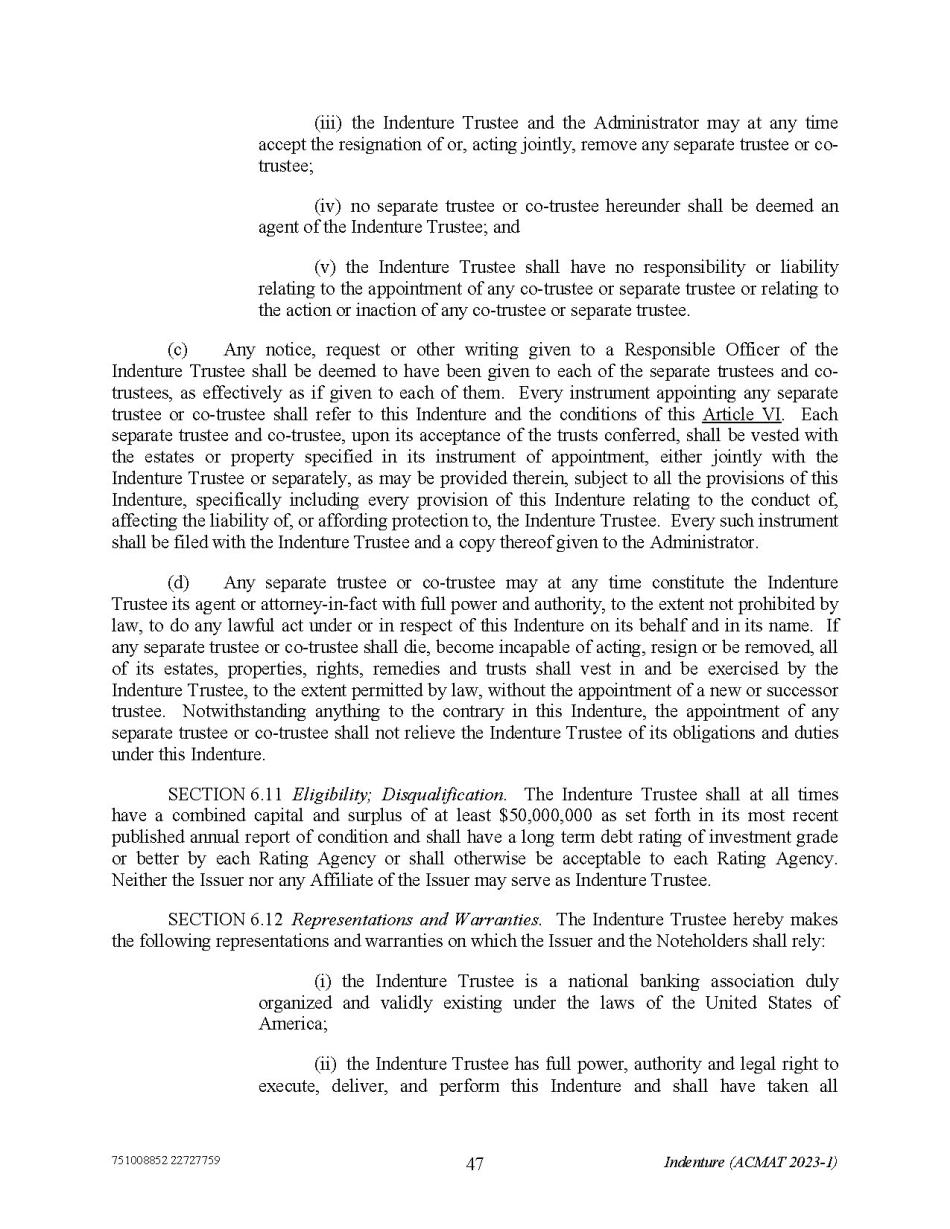 751008852 22727759 47 Indenture (ACMAT 2023 - 1) (iii) the Indenture Trustee and the Administrator may at any time accept the resignation of or, acting jointly, remove any separate trustee or co - trustee ; (iv) no separate trustee or co - trustee hereunder shall be deemed an agent of the Indenture Trustee ; and (v) the Indenture Trustee shall have no responsibility or liability relating to the appointment of any co - trustee or separate trustee or relating to the action or inaction of any co - trustee or separate trustee . (c) Any notice, request or other writing given to a Responsible Officer of the Indenture Trustee shall be deemed to have been given to each of the separate trustees and co - trustees, as effectively as if given to each of them . Every instrument appointing any separate trustee or co - trustee shall refer to this Indenture and the conditions of this Article VI . Each separate trustee and co - trustee, upon its acceptance of the trusts conferred, shall be vested with the estates or property specified in its instrument of appointment, either jointly with the Indenture Trustee or separately, as may be provided therein, subject to all the provisions of this Indenture, specifically including every provision of this Indenture relating to the conduct of, affecting the liability of, or affording protection to, the Indenture Trustee . Every such instrument shall be filed with the Indenture Trustee and a copy thereof given to the Administrator . (d) Any separate trustee or co - trustee may at any time constitute the Indenture Trustee its agent or attorney - in - fact with full power and authority, to the extent not prohibited by law, to do any lawful act under or in respect of this Indenture on its behalf and in its name . If any separate trustee or co - trustee shall die, become incapable of acting, resign or be removed, all of its estates, properties, rights, remedies and trusts shall vest in and be exercised by the Indenture Trustee, to the extent permitted by law, without the appointment of a new or successor trustee . Notwithstanding anything to the contrary in this Indenture, the appointment of any separate trustee or co - trustee shall not relieve the Indenture Trustee of its obligations and duties under this Indenture . SECTION 6 . 11 Eligibility ; Disqualification . The Indenture Trustee shall at all times have a combined capital and surplus of at least $ 50 , 000 , 000 as set forth in its most recent published annual report of condition and shall have a long term debt rating of investment grade or better by each Rating Agency or shall otherwise be acceptable to each Rating Agency . Neither the Issuer nor any Affiliate of the Issuer may serve as Indenture Trustee . SECTION 6 . 12 Representations and Warranties . The Indenture Trustee hereby makes the following representations and warranties on which the Issuer and the Noteholders shall rely : (i) the Indenture Trustee is a national banking association duly organized and validly existing under the laws of the United States of America ; (ii) the Indenture Trustee has full power, authority and legal right to execute, deliver, and perform this Indenture and shall have taken all