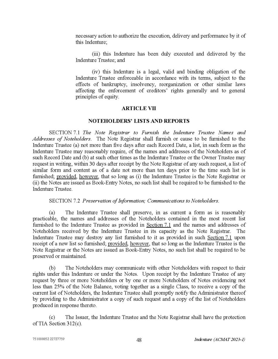 751008852 22727759 48 Indenture (ACMAT 2023 - 1) necessary action to authorize the execution, delivery and performance by it of this Indenture; (iii) this Indenture has been duly executed and delivered by the Indenture Trustee ; and (iv) this Indenture is a legal, valid and binding obligation of the Indenture Trustee enforceable in accordance with its terms, subject to the effects of bankruptcy, insolvency, reorganization or other similar laws affecting the enforcement of creditors’ rights generally and to general principles of equity . ARTICLE VII NOTEHOLDERS’ LISTS AND REPORTS SECTION 7 . 1 The Note Registrar to Furnish the Indenture Trustee Names and Addresses of Noteholders . The Note Registrar shall furnish or cause to be furnished to the Indenture Trustee (a) not more than five days after each Record Date, a list, in such form as the Indenture Trustee may reasonably require, of the names and addresses of the Noteholders as of such Record Date and (b) at such other times as the Indenture Trustee or the Owner Trustee may request in writing, within 30 days after receipt by the Note Registrar of any such request, a list of similar form and content as of a date not more than ten days prior to the time such list is furnished ; provided , however , that so long as (i) the Indenture Trustee is the Note Registrar or (ii) the Notes are issued as Book - Entry Notes, no such list shall be required to be furnished to the Indenture Trustee . SECTION 7.2 Preservation of Information; Communications to Noteholders . (a) The Indenture Trustee shall preserve, in as current a form as is reasonably practicable, the names and addresses of the Noteholders contained in the most recent list furnished to the Indenture Trustee as provided in Section 7 . 1 and the names and addresses of Noteholders received by the Indenture Trustee in its capacity as the Note Registrar . The Indenture Trustee may destroy any list furnished to it as provided in such Section 7 . 1 upon receipt of a new list so furnished ; provided , however , that so long as the Indenture Trustee is the Note Registrar or the Notes are issued as Book - Entry Notes, no such list shall be required to be preserved or maintained . (b) The Noteholders may communicate with other Noteholders with respect to their rights under this Indenture or under the Notes . Upon receipt by the Indenture Trustee of any request by three or more Noteholders or by one or more Noteholders of Notes evidencing not less than 25 % of the Note Balance, voting together as a single Class, to receive a copy of the current list of Noteholders, the Indenture Trustee shall promptly notify the Administrator thereof by providing to the Administrator a copy of such request and a copy of the list of Noteholders produced in response thereto . (c) The Issuer, the Indenture Trustee and the Note Registrar shall have the protection of TIA Section 312 (c) .