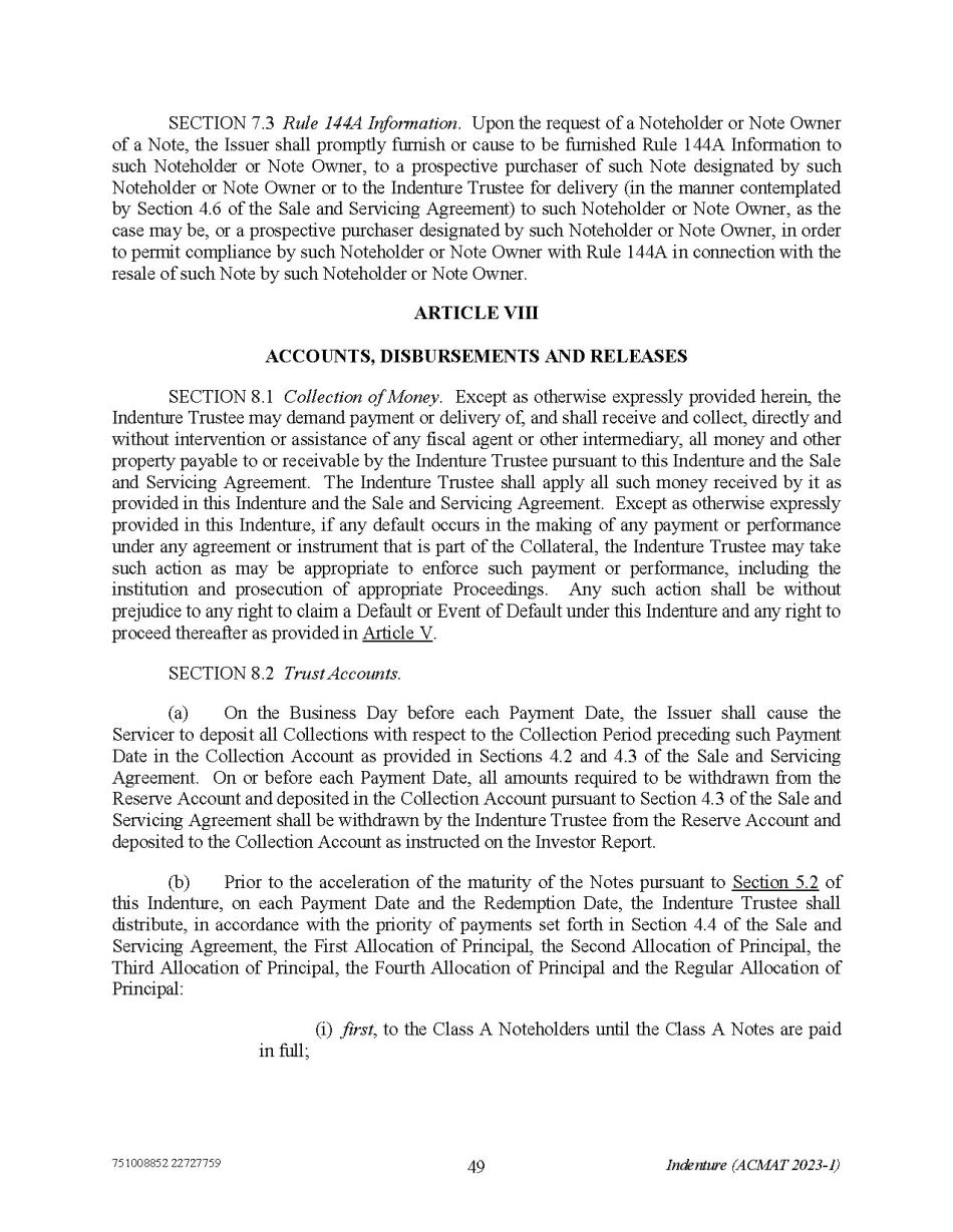 751008852 22727759 49 Indenture (ACMAT 2023 - 1) SECTION 7 . 3 Rule 144 A Information . Upon the request of a Noteholder or Note Owner of a Note, the Issuer shall promptly furnish or cause to be furnished Rule 144 A Information to such Noteholder or Note Owner, to a prospective purchaser of such Note designated by such Noteholder or Note Owner or to the Indenture Trustee for delivery (in the manner contemplated by Section 4 . 6 of the Sale and Servicing Agreement) to such Noteholder or Note Owner, as the case may be, or a prospective purchaser designated by such Noteholder or Note Owner, in order to permit compliance by such Noteholder or Note Owner with Rule 144 A in connection with the resale of such Note by such Noteholder or Note Owner . ARTICLE VIII ACCOUNTS, DISBURSEMENTS AND RELEASES SECTION 8 . 1 Collection of Money . Except as otherwise expressly provided herein, the Indenture Trustee may demand payment or delivery of, and shall receive and collect, directly and without intervention or assistance of any fiscal agent or other intermediary, all money and other property payable to or receivable by the Indenture Trustee pursuant to this Indenture and the Sale and Servicing Agreement . The Indenture Trustee shall apply all such money received by it as provided in this Indenture and the Sale and Servicing Agreement . Except as otherwise expressly provided in this Indenture, if any default occurs in the making of any payment or performance under any agreement or instrument that is part of the Collateral, the Indenture Trustee may take such action as may be appropriate to enforce such payment or performance, including the institution and prosecution of appropriate Proceedings . Any such action shall be without prejudice to any right to claim a Default or Event of Default under this Indenture and any right to proceed thereafter as provided in Article V . SECTION 8.2 Trust Accounts . (a) On the Business Day before each Payment Date, the Issuer shall cause the Servicer to deposit all Collections with respect to the Collection Period preceding such Payment Date in the Collection Account as provided in Sections 4 . 2 and 4 . 3 of the Sale and Servicing Agreement . On or before each Payment Date, all amounts required to be withdrawn from the Reserve Account and deposited in the Collection Account pursuant to Section 4 . 3 of the Sale and Servicing Agreement shall be withdrawn by the Indenture Trustee from the Reserve Account and deposited to the Collection Account as instructed on the Investor Report . (b) Prior to the acceleration of the maturity of the Notes pursuant to Section 5 . 2 of this Indenture, on each Payment Date and the Redemption Date, the Indenture Trustee shall distribute, in accordance with the priority of payments set forth in Section 4 . 4 of the Sale and Servicing Agreement, the First Allocation of Principal, the Second Allocation of Principal, the Third Allocation of Principal, the Fourth Allocation of Principal and the Regular Allocation of Principal : (i) first , to the Class A Noteholders until the Class A Notes are paid in full;