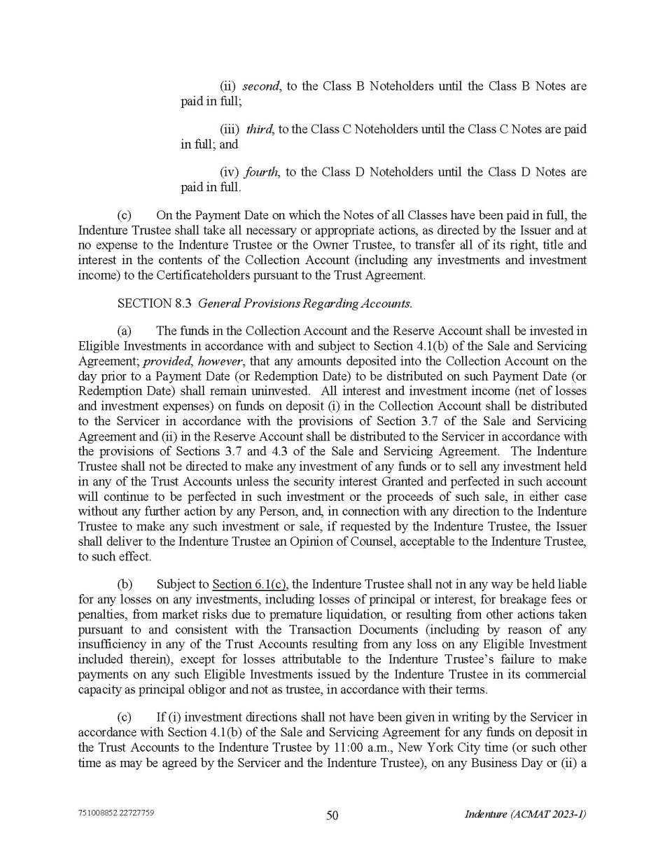 751008852 22727759 50 Indenture (ACMAT 2023 - 1) (ii) second , to the Class B Noteholders until the Class B Notes are paid in full; (iii) third , to the Class C Noteholders until the Class C Notes are paid in full; and (iv) fourth , to the Class D Noteholders until the Class D Notes are paid in full. (c) On the Payment Date on which the Notes of all Classes have been paid in full, the Indenture Trustee shall take all necessary or appropriate actions, as directed by the Issuer and at no expense to the Indenture Trustee or the Owner Trustee, to transfer all of its right, title and interest in the contents of the Collection Account (including any investments and investment income) to the Certificateholders pursuant to the Trust Agreement . SECTION 8.3 General Provisions Regarding Accounts . (a) The funds in the Collection Account and the Reserve Account shall be invested in Eligible Investments in accordance with and subject to Section 4 . 1 (b) of the Sale and Servicing Agreement ; provided , however , that any amounts deposited into the Collection Account on the day prior to a Payment Date (or Redemption Date) to be distributed on such Payment Date (or Redemption Date) shall remain uninvested . All interest and investment income (net of losses and investment expenses) on funds on deposit (i) in the Collection Account shall be distributed to the Servicer in accordance with the provisions of Section 3 . 7 of the Sale and Servicing Agreement and (ii) in the Reserve Account shall be distributed to the Servicer in accordance with the provisions of Sections 3 . 7 and 4 . 3 of the Sale and Servicing Agreement . The Indenture Trustee shall not be directed to make any investment of any funds or to sell any investment held in any of the Trust Accounts unless the security interest Granted and perfected in such account will continue to be perfected in such investment or the proceeds of such sale, in either case without any further action by any Person, and, in connection with any direction to the Indenture Trustee to make any such investment or sale, if requested by the Indenture Trustee, the Issuer shall deliver to the Indenture Trustee an Opinion of Counsel, acceptable to the Indenture Trustee, to such effect . (b) Subject to Section 6 . 1 (c) , the Indenture Trustee shall not in any way be held liable for any losses on any investments, including losses of principal or interest, for breakage fees or penalties, from market risks due to premature liquidation, or resulting from other actions taken pursuant to and consistent with the Transaction Documents (including by reason of any insufficiency in any of the Trust Accounts resulting from any loss on any Eligible Investment included therein), except for losses attributable to the Indenture Trustee’s failure to make payments on any such Eligible Investments issued by the Indenture Trustee in its commercial capacity as principal obligor and not as trustee, in accordance with their terms . (c) If (i) investment directions shall not have been given in writing by the Servicer in accordance with Section 4 . 1 (b) of the Sale and Servicing Agreement for any funds on deposit in the Trust Accounts to the Indenture Trustee by 11 : 00 a . m . , New York City time (or such other time as may be agreed by the Servicer and the Indenture Trustee), on any Business Day or (ii) a