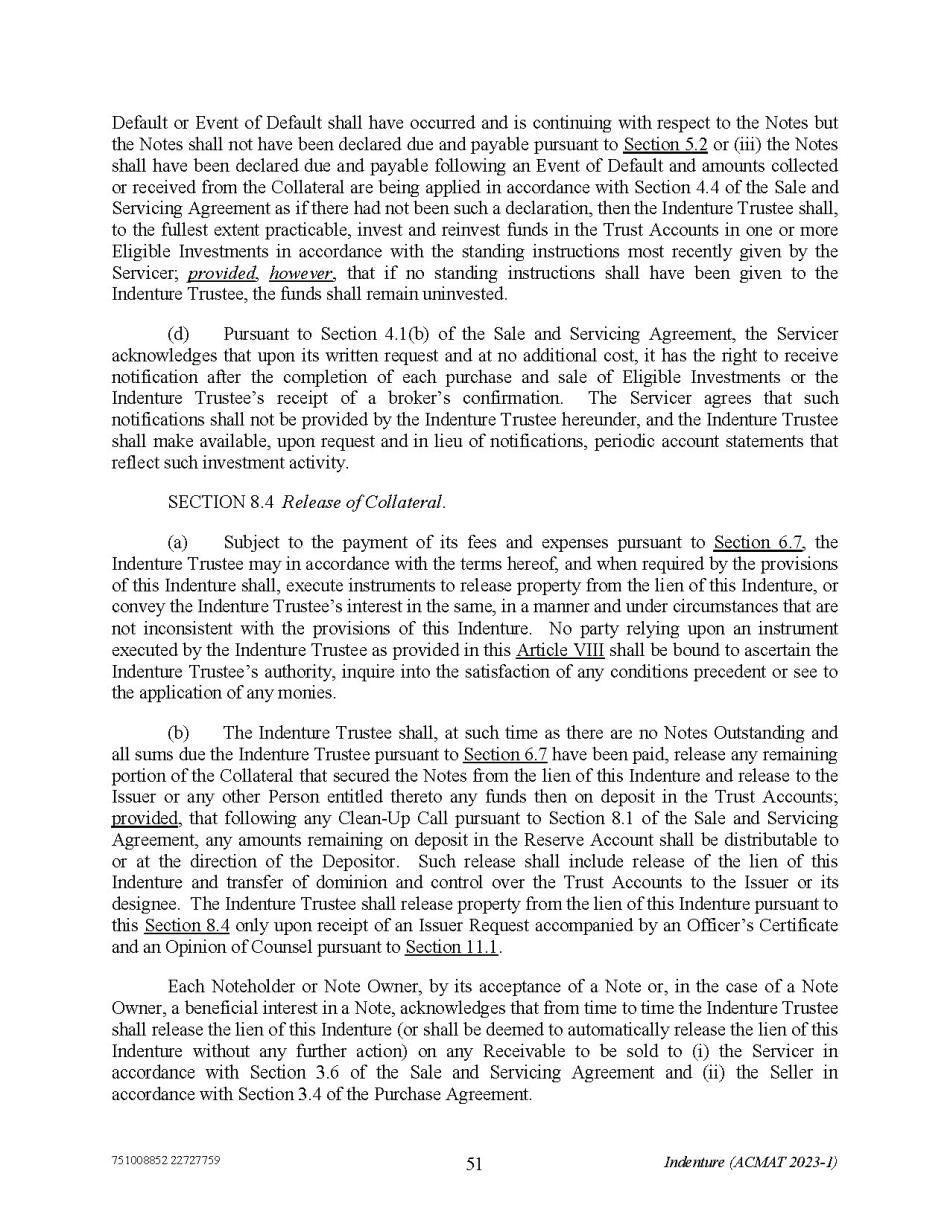 751008852 22727759 51 Indenture (ACMAT 2023 - 1) Default or Event of Default shall have occurred and is continuing with respect to the Notes but the Notes shall not have been declared due and payable pursuant to Section 5 . 2 or (iii) the Notes shall have been declared due and payable following an Event of Default and amounts collected or received from the Collateral are being applied in accordance with Section 4 . 4 of the Sale and Servicing Agreement as if there had not been such a declaration, then the Indenture Trustee shall, to the fullest extent practicable, invest and reinvest funds in the Trust Accounts in one or more Eligible Investments in accordance with the standing instructions most recently given by the Servicer ; provided , however , that if no standing instructions shall have been given to the Indenture Trustee, the funds shall remain uninvested . (d) Pursuant to Section 4 . 1 (b) of the Sale and Servicing Agreement, the Servicer acknowledges that upon its written request and at no additional cost, it has the right to receive notification after the completion of each purchase and sale of Eligible Investments or the Indenture Trustee’s receipt of a broker’s confirmation . The Servicer agrees that such notifications shall not be provided by the Indenture Trustee hereunder, and the Indenture Trustee shall make available, upon request and in lieu of notifications, periodic account statements that reflect such investment activity . SECTION 8.4 Release of Collateral . (a) Subject to the payment of its fees and expenses pursuant to Section 6 . 7 , the Indenture Trustee may in accordance with the terms hereof, and when required by the provisions of this Indenture shall, execute instruments to release property from the lien of this Indenture, or convey the Indenture Trustee’s interest in the same, in a manner and under circumstances that are not inconsistent with the provisions of this Indenture . No party relying upon an instrument executed by the Indenture Trustee as provided in this Article VIII shall be bound to ascertain the Indenture Trustee’s authority, inquire into the satisfaction of any conditions precedent or see to the application of any monies . (b) The Indenture Trustee shall, at such time as there are no Notes Outstanding and all sums due the Indenture Trustee pursuant to Section 6 . 7 have been paid, release any remaining portion of the Collateral that secured the Notes from the lien of this Indenture and release to the Issuer or any other Person entitled thereto any funds then on deposit in the Trust Accounts ; provided , that following any Clean - Up Call pursuant to Section 8 . 1 of the Sale and Servicing Agreement, any amounts remaining on deposit in the Reserve Account shall be distributable to or at the direction of the Depositor . Such release shall include release of the lien of this Indenture and transfer of dominion and control over the Trust Accounts to the Issuer or its designee . The Indenture Trustee shall release property from the lien of this Indenture pursuant to this Section 8 . 4 only upon receipt of an Issuer Request accompanied by an Officer’s Certificate and an Opinion of Counsel pursuant to Section 11 . 1 . Each Noteholder or Note Owner, by its acceptance of a Note or, in the case of a Note Owner, a beneficial interest in a Note, acknowledges that from time to time the Indenture Trustee shall release the lien of this Indenture (or shall be deemed to automatically release the lien of this Indenture without any further action) on any Receivable to be sold to (i) the Servicer in accordance with Section 3 . 6 of the Sale and Servicing Agreement and (ii) the Seller in accordance with Section 3 . 4 of the Purchase Agreement .