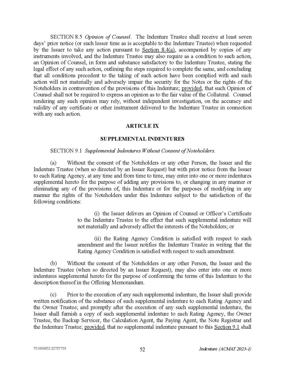 751008852 22727759 52 Indenture (ACMAT 2023 - 1) SECTION 8 . 5 Opinion of Counsel . The Indenture Trustee shall receive at least seven days’ prior notice (or such lesser time as is acceptable to the Indenture Trustee) when requested by the Issuer to take any action pursuant to Section 8 . 4 (a) , accompanied by copies of any instruments involved, and the Indenture Trustee may also require as a condition to such action, an Opinion of Counsel, in form and substance satisfactory to the Indenture Trustee, stating the legal effect of any such action, outlining the steps required to complete the same, and concluding that all conditions precedent to the taking of such action have been complied with and such action will not materially and adversely impair the security for the Notes or the rights of the Noteholders in contravention of the provisions of this Indenture ; provided , that such Opinion of Counsel shall not be required to express an opinion as to the fair value of the Collateral . Counsel rendering any such opinion may rely, without independent investigation, on the accuracy and validity of any certificate or other instrument delivered to the Indenture Trustee in connection with any such action . ARTICLE IX SUPPLEMENTAL INDENTURES SECTION 9.1 Supplemental Indentures Without Consent of Noteholders . (a) Without the consent of the Noteholders or any other Person, the Issuer and the Indenture Trustee (when so directed by an Issuer Request) but with prior notice from the Issuer to each Rating Agency, at any time and from time to time, may enter into one or more indentures supplemental hereto for the purpose of adding any provisions to, or changing in any manner or eliminating any of the provisions of, this Indenture or for the purposes of modifying in any manner the rights of the Noteholders under this Indenture subject to the satisfaction of the following conditions : (i) the Issuer delivers an Opinion of Counsel or Officer’s Certificate to the Indenture Trustee to the effect that such supplemental indenture will not materially and adversely affect the interests of the Noteholders ; or (ii) the Rating Agency Condition is satisfied with respect to such amendment and the Issuer notifies the Indenture Trustee in writing that the Rating Agency Condition is satisfied with respect to such amendment . (b) Without the consent of the Noteholders or any other Person, the Issuer and the Indenture Trustee (when so directed by an Issuer Request), may also enter into one or more indentures supplemental hereto for the purpose of conforming the terms of this Indenture to the description thereof in the Offering Memorandum . (c) Prior to the execution of any such supplemental indenture, the Issuer shall provide written notification of the substance of such supplemental indenture to each Rating Agency and the Owner Trustee ; and promptly after the execution of any such supplemental indenture, the Issuer shall furnish a copy of such supplemental indenture to each Rating Agency, the Owner Trustee, the Backup Servicer, the Calculation Agent, the Paying Agent, the Note Registrar and the Indenture Trustee ; provided , that no supplemental indenture pursuant to this Section 9 . 1 shall