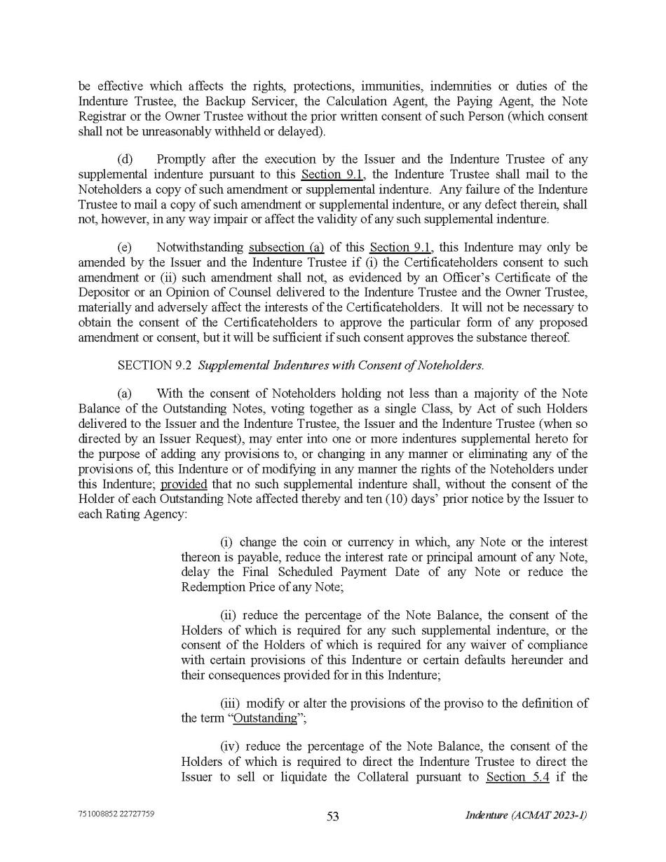 751008852 22727759 53 Indenture (ACMAT 2023 - 1) be effective which affects the rights, protections, immunities, indemnities or duties of the Indenture Trustee, the Backup Servicer, the Calculation Agent, the Paying Agent, the Note Registrar or the Owner Trustee without the prior written consent of such Person (which consent shall not be unreasonably withheld or delayed) . (d) Promptly after the execution by the Issuer and the Indenture Trustee of any supplemental indenture pursuant to this Section 9 . 1 , the Indenture Trustee shall mail to the Noteholders a copy of such amendment or supplemental indenture . Any failure of the Indenture Trustee to mail a copy of such amendment or supplemental indenture, or any defect therein, shall not, however, in any way impair or affect the validity of any such supplemental indenture . (e) Notwithstanding subsection (a) of this Section 9 . 1 , this Indenture may only be amended by the Issuer and the Indenture Trustee if (i) the Certificateholders consent to such amendment or (ii) such amendment shall not, as evidenced by an Officer’s Certificate of the Depositor or an Opinion of Counsel delivered to the Indenture Trustee and the Owner Trustee, materially and adversely affect the interests of the Certificateholders . It will not be necessary to obtain the consent of the Certificateholders to approve the particular form of any proposed amendment or consent, but it will be sufficient if such consent approves the substance thereof . SECTION 9.2 Supplemental Indentures with Consent of Noteholders . (a) With the consent of Noteholders holding not less than a majority of the Note Balance of the Outstanding Notes, voting together as a single Class, by Act of such Holders delivered to the Issuer and the Indenture Trustee, the Issuer and the Indenture Trustee (when so directed by an Issuer Request), may enter into one or more indentures supplemental hereto for the purpose of adding any provisions to, or changing in any manner or eliminating any of the provisions of, this Indenture or of modifying in any manner the rights of the Noteholders under this Indenture ; provided that no such supplemental indenture shall, without the consent of the Holder of each Outstanding Note affected thereby and ten ( 10 ) days’ prior notice by the Issuer to each Rating Agency : (i) change the coin or currency in which, any Note or the interest thereon is payable, reduce the interest rate or principal amount of any Note, delay the Final Scheduled Payment Date of any Note or reduce the Redemption Price of any Note ; (ii) reduce the percentage of the Note Balance, the consent of the Holders of which is required for any such supplemental indenture, or the consent of the Holders of which is required for any waiver of compliance with certain provisions of this Indenture or certain defaults hereunder and their consequences provided for in this Indenture ; (iii) modify or alter the provisions of the proviso to the definition of the term “ Outstanding ” ; (iv) reduce the percentage of the Note Balance, the consent of the Holders of which is required to direct the Indenture Trustee to direct the Issuer to sell or liquidate the Collateral pursuant to Section 5 . 4 if the