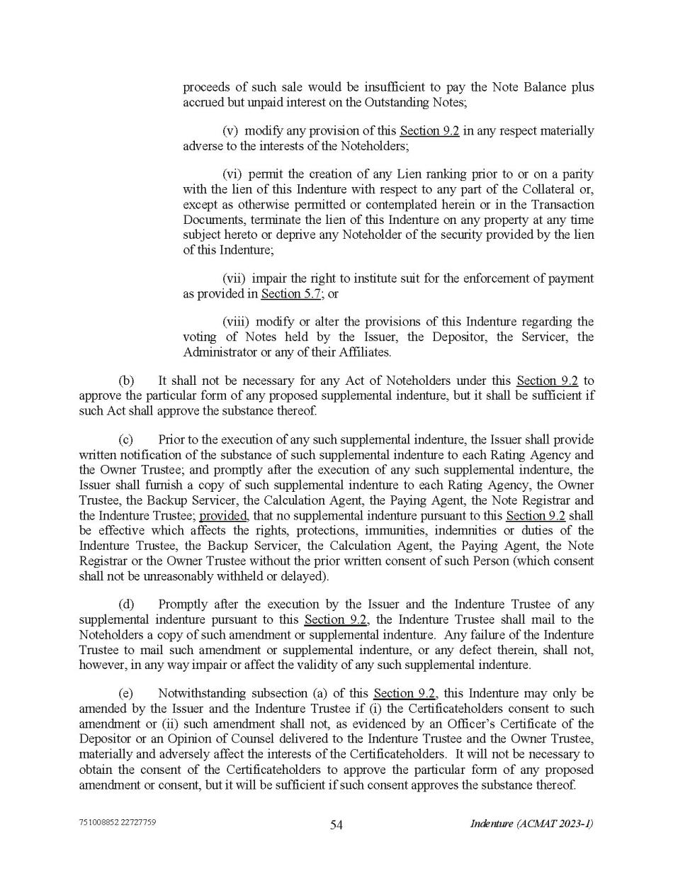 751008852 22727759 54 Indenture (ACMAT 2023 - 1) proceeds of such sale would be insufficient to pay the Note Balance plus accrued but unpaid interest on the Outstanding Notes; (v) modify any provision of this Section 9 . 2 in any respect materially adverse to the interests of the Noteholders ; (vi) permit the creation of any Lien ranking prior to or on a parity with the lien of this Indenture with respect to any part of the Collateral or, except as otherwise permitted or contemplated herein or in the Transaction Documents, terminate the lien of this Indenture on any property at any time subject hereto or deprive any Noteholder of the security provided by the lien of this Indenture ; (vii) impair the right to institute suit for the enforcement of payment as provided in Section 5 . 7 ; or (viii) modify or alter the provisions of this Indenture regarding the voting of Notes held by the Issuer, the Depositor, the Servicer, the Administrator or any of their Affiliates . (b) It shall not be necessary for any Act of Noteholders under this Section 9 . 2 to approve the particular form of any proposed supplemental indenture, but it shall be sufficient if such Act shall approve the substance thereof . (c) Prior to the execution of any such supplemental indenture, the Issuer shall provide written notification of the substance of such supplemental indenture to each Rating Agency and the Owner Trustee ; and promptly after the execution of any such supplemental indenture, the Issuer shall furnish a copy of such supplemental indenture to each Rating Agency, the Owner Trustee, the Backup Servicer, the Calculation Agent, the Paying Agent, the Note Registrar and the Indenture Trustee ; provided , that no supplemental indenture pursuant to this Section 9 . 2 shall be effective which affects the rights, protections, immunities, indemnities or duties of the Indenture Trustee, the Backup Servicer, the Calculation Agent, the Paying Agent, the Note Registrar or the Owner Trustee without the prior written consent of such Person (which consent shall not be unreasonably withheld or delayed) . (d) Promptly after the execution by the Issuer and the Indenture Trustee of any supplemental indenture pursuant to this Section 9 . 2 , the Indenture Trustee shall mail to the Noteholders a copy of such amendment or supplemental indenture . Any failure of the Indenture Trustee to mail such amendment or supplemental indenture, or any defect therein, shall not, however, in any way impair or affect the validity of any such supplemental indenture . (e) Notwithstanding subsection (a) of this Section 9 . 2 , this Indenture may only be amended by the Issuer and the Indenture Trustee if (i) the Certificateholders consent to such amendment or (ii) such amendment shall not, as evidenced by an Officer’s Certificate of the Depositor or an Opinion of Counsel delivered to the Indenture Trustee and the Owner Trustee, materially and adversely affect the interests of the Certificateholders . It will not be necessary to obtain the consent of the Certificateholders to approve the particular form of any proposed amendment or consent, but it will be sufficient if such consent approves the substance thereof .