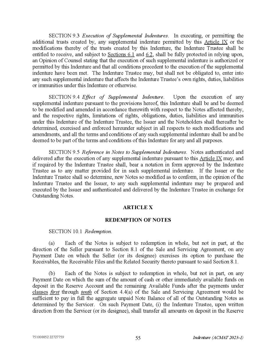 751008852 22727759 55 Indenture (ACMAT 2023 - 1) SECTION 9 . 3 Execution of Supplemental Indentures . In executing, or permitting the additional trusts created by, any supplemental indenture permitted by this Article IX or the modifications thereby of the trusts created by this Indenture, the Indenture Trustee shall be entitled to receive, and subject to Sections 6 . 1 and 6 . 2 , shall be fully protected in relying upon, an Opinion of Counsel stating that the execution of such supplemental indenture is authorized or permitted by this Indenture and that all conditions precedent to the execution of the supplemental indenture have been met . The Indenture Trustee may, but shall not be obligated to, enter into any such supplemental indenture that affects the Indenture Trustee’s own rights, duties, liabilities or immunities under this Indenture or otherwise . SECTION 9 . 4 Effect of Supplemental Indenture . Upon the execution of any supplemental indenture pursuant to the provisions hereof, this Indenture shall be and be deemed to be modified and amended in accordance therewith with respect to the Notes affected thereby, and the respective rights, limitations of rights, obligations, duties, liabilities and immunities under this Indenture of the Indenture Trustee, the Issuer and the Noteholders shall thereafter be determined, exercised and enforced hereunder subject in all respects to such modifications and amendments, and all the terms and conditions of any such supplemental indenture shall be and be deemed to be part of the terms and conditions of this Indenture for any and all purposes . SECTION 9 . 5 Reference in Notes to Supplemental Indentures . Notes authenticated and delivered after the execution of any supplemental indenture pursuant to this Article IX may, and if required by the Indenture Trustee shall, bear a notation in form approved by the Indenture Trustee as to any matter provided for in such supplemental indenture . If the Issuer or the Indenture Trustee shall so determine, new Notes so modified as to conform, in the opinion of the Indenture Trustee and the Issuer, to any such supplemental indenture may be prepared and executed by the Issuer and authenticated and delivered by the Indenture Trustee in exchange for Outstanding Notes . ARTICLE X REDEMPTION OF NOTES SECTION 10.1 Redemption . (a) Each of the Notes is subject to redemption in whole, but not in part, at the direction of the Seller pursuant to Section 8 . 1 of the Sale and Servicing Agreement, on any Payment Date on which the Seller (or its designee) exercises its option to purchase the Receivables, the Receivable Files and the Related Security thereto pursuant to said Section 8 . 1 . (b) Each of the Notes is subject to redemption in whole, but not in part, on any Payment Date on which the sum of the amount of cash or other immediately available funds on deposit in the Reserve Account and the remaining Available Funds after the payments under clauses first through tenth of Section 4 . 4 (a) of the Sale and Servicing Agreement would be sufficient to pay in full the aggregate unpaid Note Balance of all of the Outstanding Notes as determined by the Servicer . On such Payment Date, (i) the Indenture Trustee, upon written direction from the Servicer (or its designee), shall transfer all amounts on deposit in the Reserve