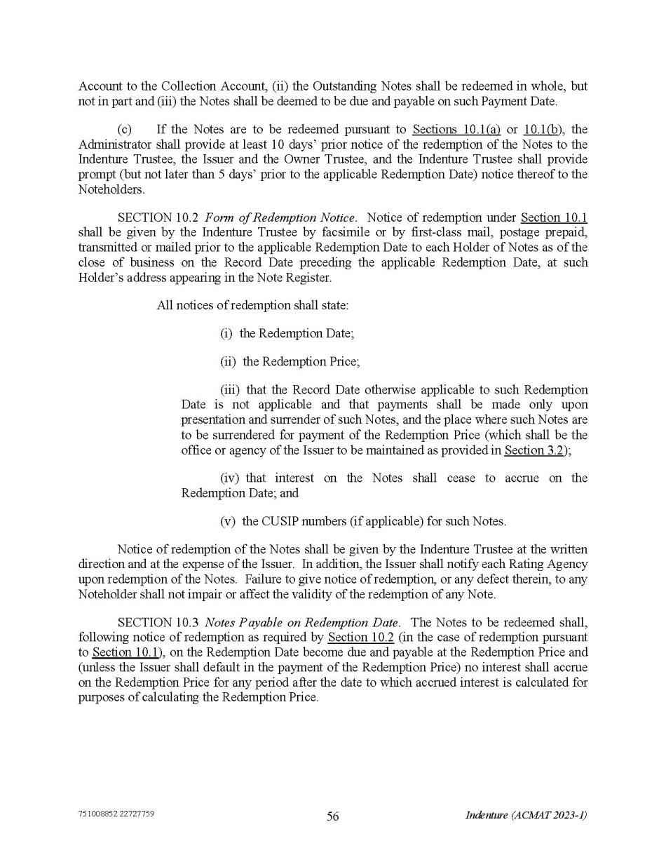 751008852 22727759 56 Indenture (ACMAT 2023 - 1) Account to the Collection Account, (ii) the Outstanding Notes shall be redeemed in whole, but not in part and (iii) the Notes shall be deemed to be due and payable on such Payment Date. (c) If the Notes are to be redeemed pursuant to Sections 10 . 1 (a) or 10 . 1 (b ), the Administrator shall provide at least 10 days’ prior notice of the redemption of the Notes to the Indenture Trustee, the Issuer and the Owner Trustee, and the Indenture Trustee shall provide prompt (but not later than 5 days’ prior to the applicable Redemption Date) notice thereof to the Noteholders . SECTION 10 . 2 Form of Redemption Notice . Notice of redemption under Section 10 . 1 shall be given by the Indenture Trustee by facsimile or by first - class mail, postage prepaid, transmitted or mailed prior to the applicable Redemption Date to each Holder of Notes as of the close of business on the Record Date preceding the applicable Redemption Date, at such Holder’s address appearing in the Note Register . All notices of redemption shall state: (i) the Redemption Date; (ii) the Redemption Price; (iii) that the Record Date otherwise applicable to such Redemption Date is not applicable and that payments shall be made only upon presentation and surrender of such Notes, and the place where such Notes are to be surrendered for payment of the Redemption Price (which shall be the office or agency of the Issuer to be maintained as provided in Section 3 . 2 ) ; (iv) that interest on the Notes shall cease to accrue on the Redemption Date ; and (v) the CUSIP numbers (if applicable) for such Notes. Notice of redemption of the Notes shall be given by the Indenture Trustee at the written direction and at the expense of the Issuer . In addition, the Issuer shall notify each Rating Agency upon redemption of the Notes . Failure to give notice of redemption, or any defect therein, to any Noteholder shall not impair or affect the validity of the redemption of any Note . SECTION 10 . 3 Notes Payable on Redemption Date . The Notes to be redeemed shall, following notice of redemption as required by Section 10 . 2 (in the case of redemption pursuant to Section 10 . 1 ), on the Redemption Date become due and payable at the Redemption Price and (unless the Issuer shall default in the payment of the Redemption Price) no interest shall accrue on the Redemption Price for any period after the date to which accrued interest is calculated for purposes of calculating the Redemption Price .