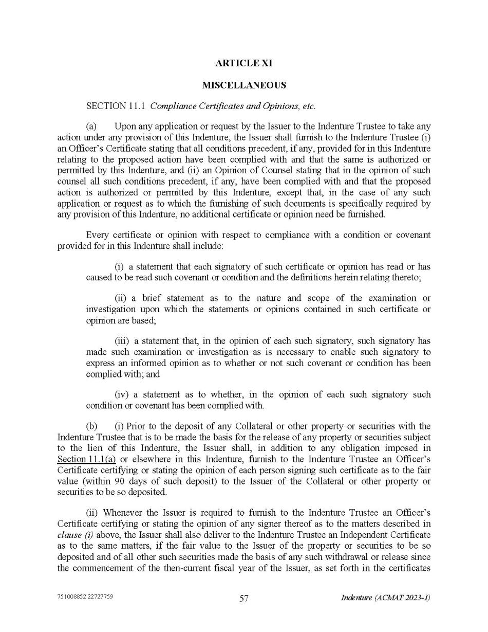 751008852 22727759 57 Indenture (ACMAT 2023 - 1) ARTICLE XI MISCELLANEOUS SECTION 11.1 Compliance Certificates and Opinions, etc. (a) Upon any application or request by the Issuer to the Indenture Trustee to take any action under any provision of this Indenture, the Issuer shall furnish to the Indenture Trustee (i) an Officer’s Certificate stating that all conditions precedent, if any, provided for in this Indenture relating to the proposed action have been complied with and that the same is authorized or permitted by this Indenture, and (ii) an Opinion of Counsel stating that in the opinion of such counsel all such conditions precedent, if any, have been complied with and that the proposed action is authorized or permitted by this Indenture, except that, in the case of any such application or request as to which the furnishing of such documents is specifically required by any provision of this Indenture, no additional certificate or opinion need be furnished . Every certificate or opinion with respect to compliance with a condition or covenant provided for in this Indenture shall include: (i) a statement that each signatory of such certificate or opinion has read or has caused to be read such covenant or condition and the definitions herein relating thereto ; (ii) a brief statement as to the nature and scope of the examination or investigation upon which the statements or opinions contained in such certificate or opinion are based ; (iii) a statement that, in the opinion of each such signatory, such signatory has made such examination or investigation as is necessary to enable such signatory to express an informed opinion as to whether or not such covenant or condition has been complied with ; and (iv) a statement as to whether, in the opinion of each such signatory such condition or covenant has been complied with . (b) (i) Prior to the deposit of any Collateral or other property or securities with the Indenture Trustee that is to be made the basis for the release of any property or securities subject to the lien of this Indenture, the Issuer shall, in addition to any obligation imposed in Section 11 . 1 (a) or elsewhere in this Indenture, furnish to the Indenture Trustee an Officer’s Certificate certifying or stating the opinion of each person signing such certificate as to the fair value (within 90 days of such deposit) to the Issuer of the Collateral or other property or securities to be so deposited . (ii) Whenever the Issuer is required to furnish to the Indenture Trustee an Officer’s Certificate certifying or stating the opinion of any signer thereof as to the matters described in clause (i) above, the Issuer shall also deliver to the Indenture Trustee an Independent Certificate as to the same matters, if the fair value to the Issuer of the property or securities to be so deposited and of all other such securities made the basis of any such withdrawal or release since the commencement of the then - current fiscal year of the Issuer, as set forth in the certificates