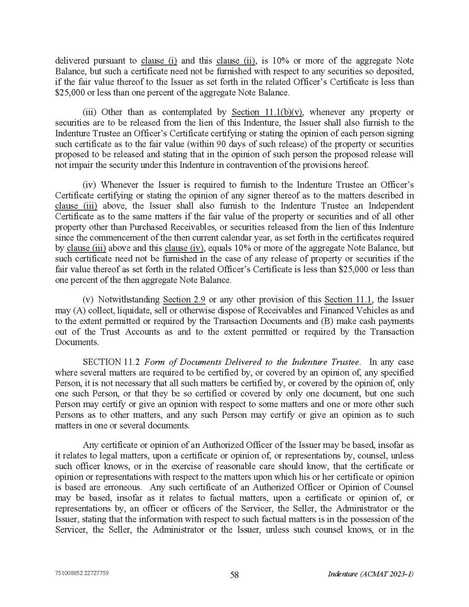 751008852 22727759 58 Indenture (ACMAT 2023 - 1) delivered pursuant to clause (i) and this clause (ii) , is 10 % or more of the aggregate Note Balance, but such a certificate need not be furnished with respect to any securities so deposited, if the fair value thereof to the Issuer as set forth in the related Officer’s Certificate is less than $ 25 , 000 or less than one percent of the aggregate Note Balance . (iii) Other than as contemplated by Section 11 . 1 (b)(v) , whenever any property or securities are to be released from the lien of this Indenture, the Issuer shall also furnish to the Indenture Trustee an Officer’s Certificate certifying or stating the opinion of each person signing such certificate as to the fair value (within 90 days of such release) of the property or securities proposed to be released and stating that in the opinion of such person the proposed release will not impair the security under this Indenture in contravention of the provisions hereof . (iv) Whenever the Issuer is required to furnish to the Indenture Trustee an Officer’s Certificate certifying or stating the opinion of any signer thereof as to the matters described in clause (iii) above, the Issuer shall also furnish to the Indenture Trustee an Independent Certificate as to the same matters if the fair value of the property or securities and of all other property other than Purchased Receivables, or securities released from the lien of this Indenture since the commencement of the then current calendar year, as set forth in the certificates required by clause (iii) above and this clause (iv) , equals 10 % or more of the aggregate Note Balance, but such certificate need not be furnished in the case of any release of property or securities if the fair value thereof as set forth in the related Officer’s Certificate is less than $ 25 , 000 or less than one percent of the then aggregate Note Balance . (v) Notwithstanding Section 2 . 9 or any other provision of this Section 11 . 1 , the Issuer may (A) collect, liquidate, sell or otherwise dispose of Receivables and Financed Vehicles as and to the extent permitted or required by the Transaction Documents and (B) make cash payments out of the Trust Accounts as and to the extent permitted or required by the Transaction Documents . SECTION 11 . 2 Form of Documents Delivered to the Indenture Trustee . In any case where several matters are required to be certified by, or covered by an opinion of, any specified Person, it is not necessary that all such matters be certified by, or covered by the opinion of, only one such Person, or that they be so certified or covered by only one document, but one such Person may certify or give an opinion with respect to some matters and one or more other such Persons as to other matters, and any such Person may certify or give an opinion as to such matters in one or several documents . Any certificate or opinion of an Authorized Officer of the Issuer may be based, insofar as it relates to legal matters, upon a certificate or opinion of, or representations by, counsel, unless such officer knows, or in the exercise of reasonable care should know, that the certificate or opinion or representations with respect to the matters upon which his or her certificate or opinion is based are erroneous . Any such certificate of an Authorized Officer or Opinion of Counsel may be based, insofar as it relates to factual matters, upon a certificate or opinion of, or representations by, an officer or officers of the Servicer, the Seller, the Administrator or the Issuer, stating that the information with respect to such factual matters is in the possession of the Servicer, the Seller, the Administrator or the Issuer, unless such counsel knows, or in the